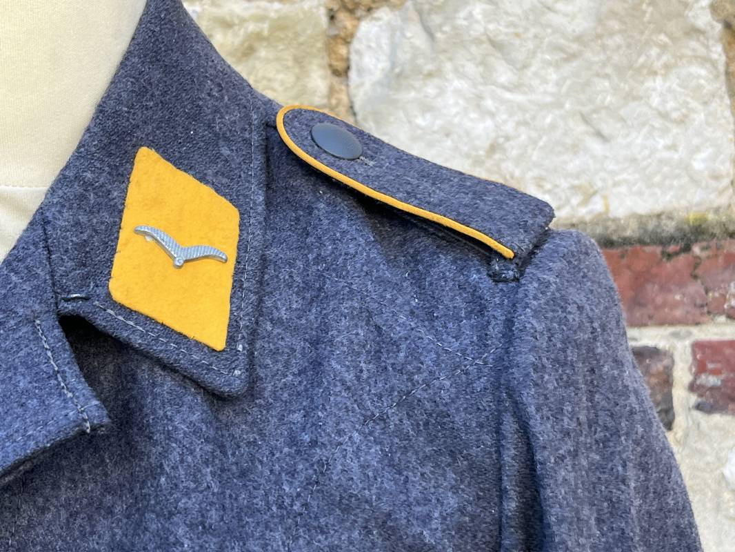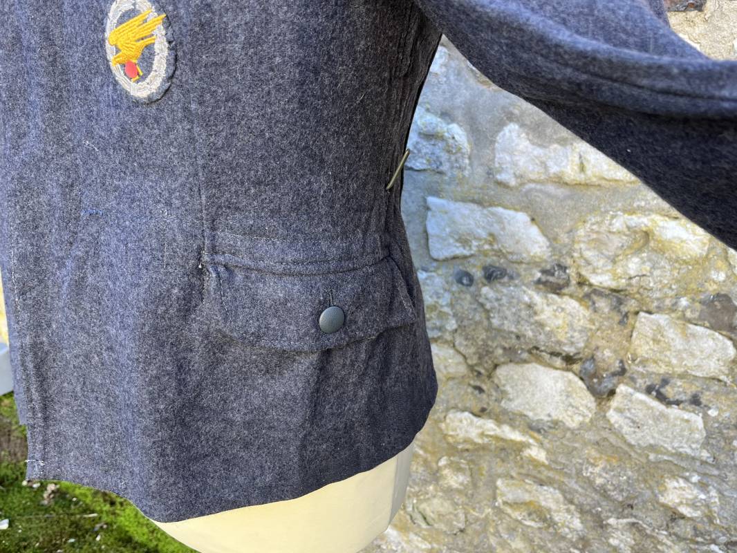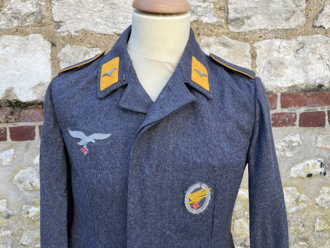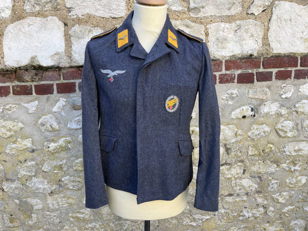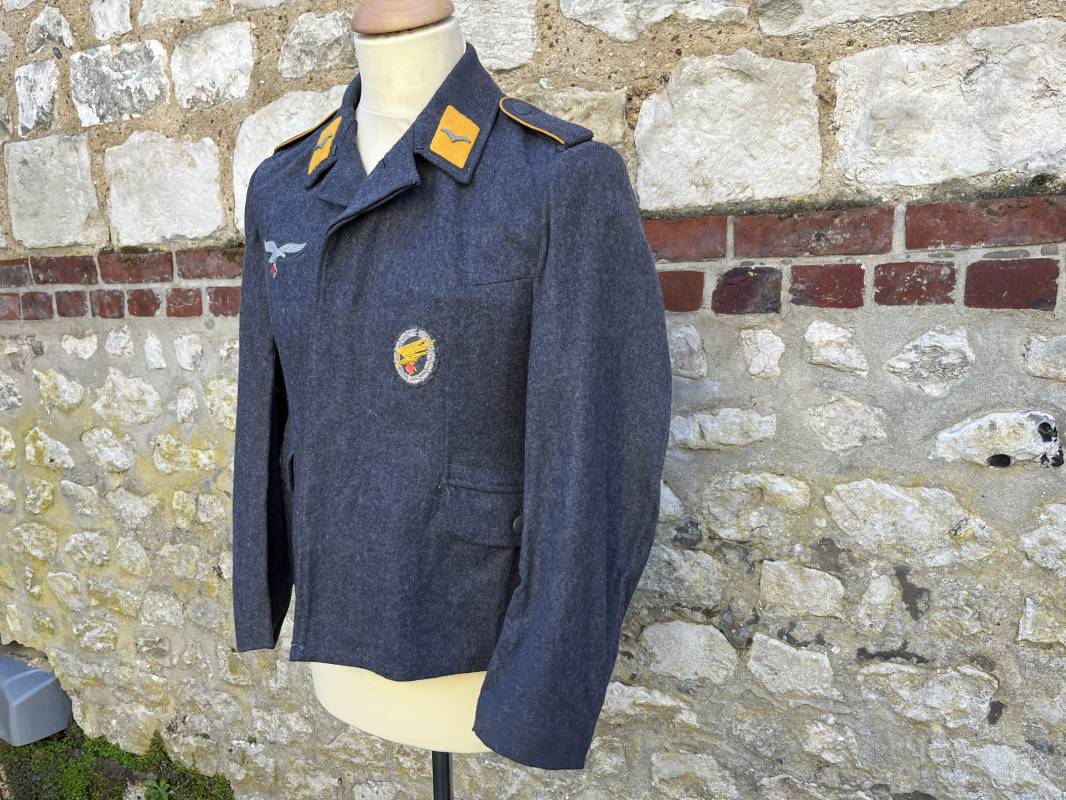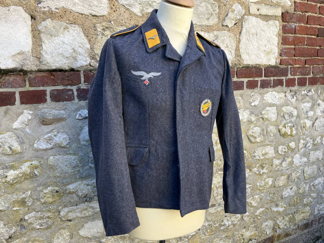 Rare Flieger Blouse d un chasseur parachutiste ( Fallschirmjager) de la Luftwaffe Veste de dotation ( Fliegerbluse) en drap gris bleu . Cette veste est entièrement montée d 'origine . 100% Nature et totalement intouchée . Pattes de col liseré jaune d or de chasseur parachutiste de la LW , pattes d 'épaules a rabats liseré en rayonne jaune d or Aigle de poitrine du modele brodé coton monté machine d 'origine couture zig zag . Brevet de chasseur parachutiste de la Luftwaffe cousu mains sur la poitrine . Brevet brodé coton. Drap de fond gris bleu. .Tous les boutons sont présents et montés d origine . Deux poches basses a rabats boutonnés . Intérieur de la veste doublée en satinette gris bleu violacé . Deux poches intérieures et poche a pansement individuel . Marquage encre code fabricant Rbnr et Tailles . Largeur épaules 41 cm , longueur 65 cm , manche 59 cm . Superbe blouse légérement portée en superbe état . Rare veste sans aucun défaut pour unité d élite de la Luftwaffe Ref 18053