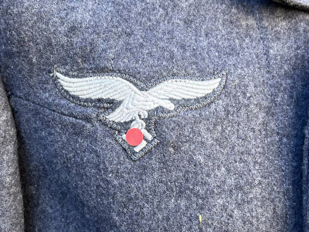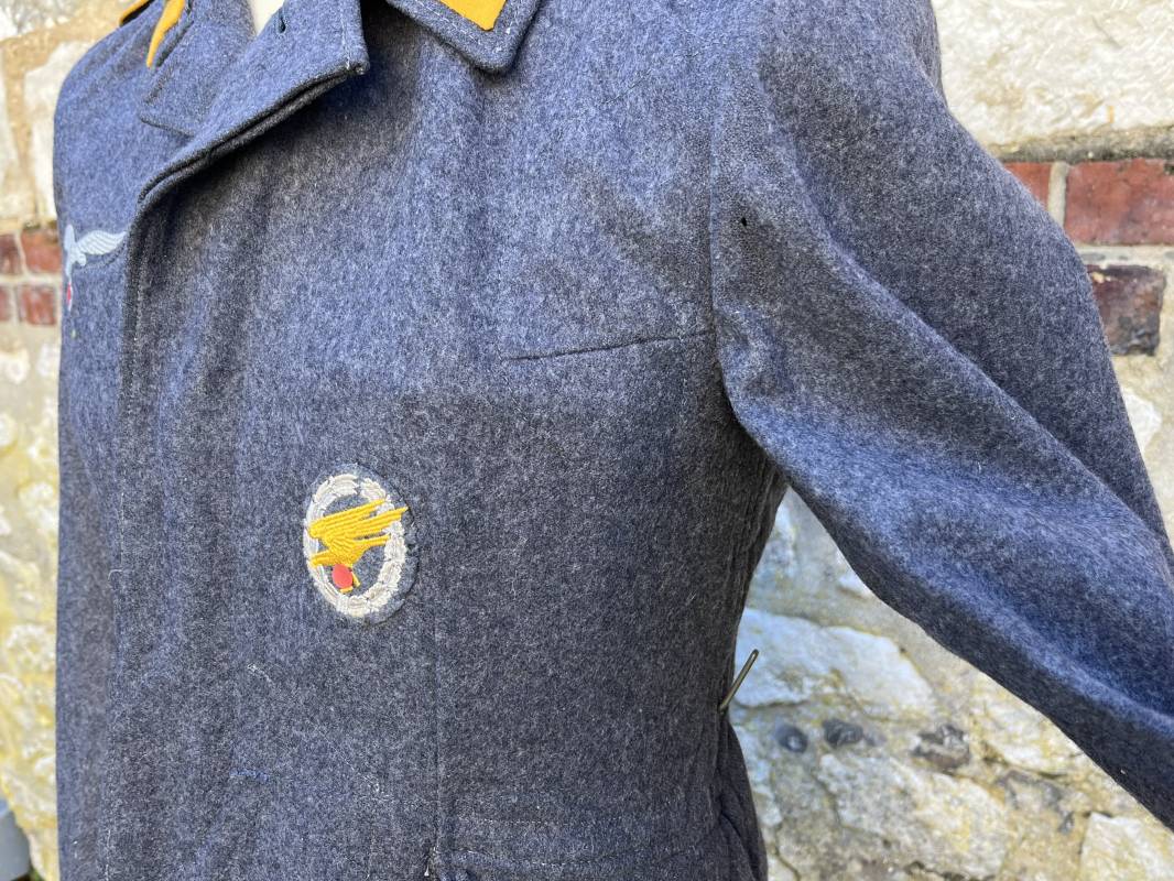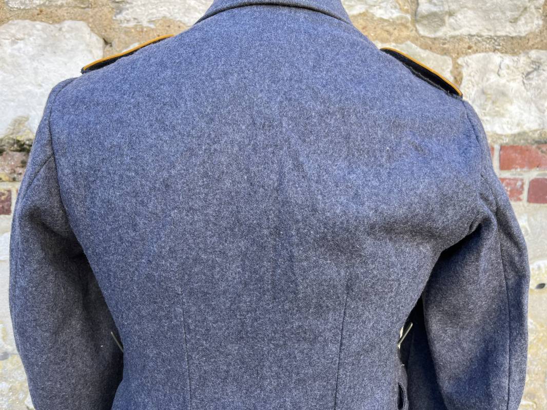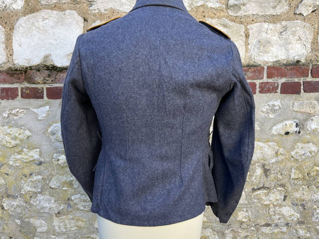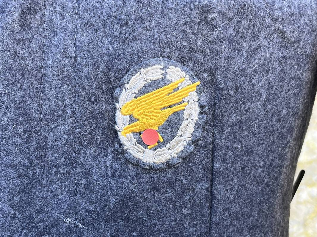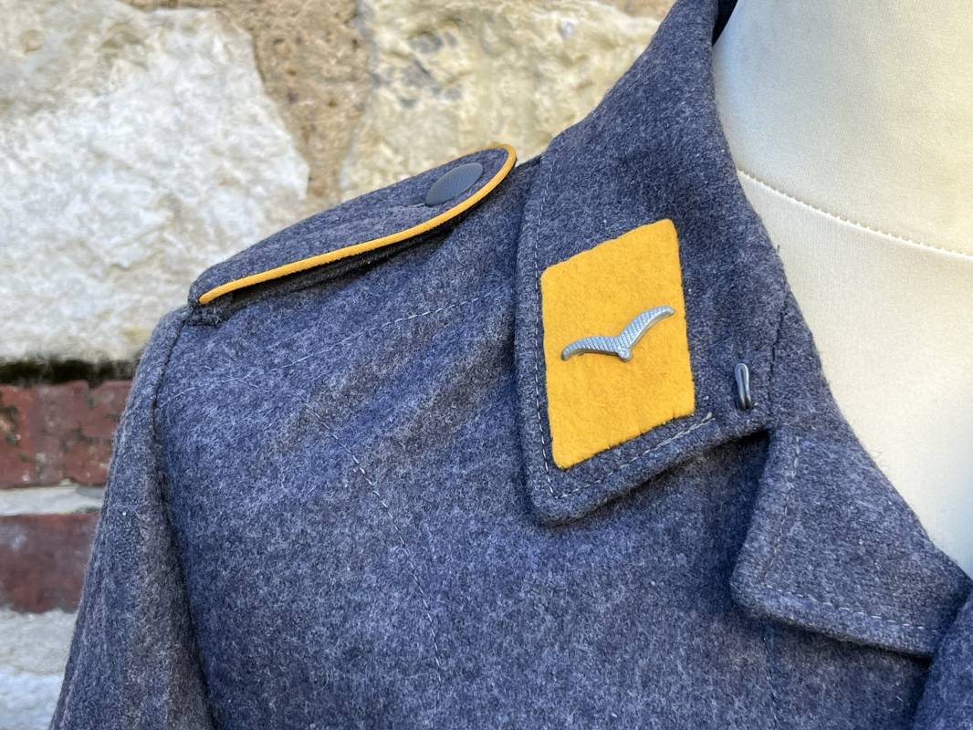 Rare Flieger Blouse d un chasseur parachutiste ( Fallschirmjager) de la Luftwaffe Veste de dotation ( Fliegerbluse) en drap gris bleu . Cette veste est entièrement montée d 'origine . 100% Nature et totalement intouchée . Pattes de col liseré jaune d or de chasseur parachutiste de la LW , pattes d 'épaules a rabats liseré en rayonne jaune d or Aigle de poitrine du modele brodé coton monté machine d 'origine couture zig zag . Brevet de chasseur parachutiste de la Luftwaffe cousu mains sur la poitrine . Brevet brodé coton. Drap de fond gris bleu. .Tous les boutons sont présents et montés d origine . Deux poches basses a rabats boutonnés . Intérieur de la veste doublée en satinette gris bleu violacé . Deux poches intérieures et poche a pansement individuel . Marquage encre code fabricant Rbnr et Tailles . Largeur épaules 41 cm , longueur 65 cm , manche 59 cm . Superbe blouse légérement portée en superbe état . Rare veste sans aucun défaut pour unité d élite de la Luftwaffe Ref 18053