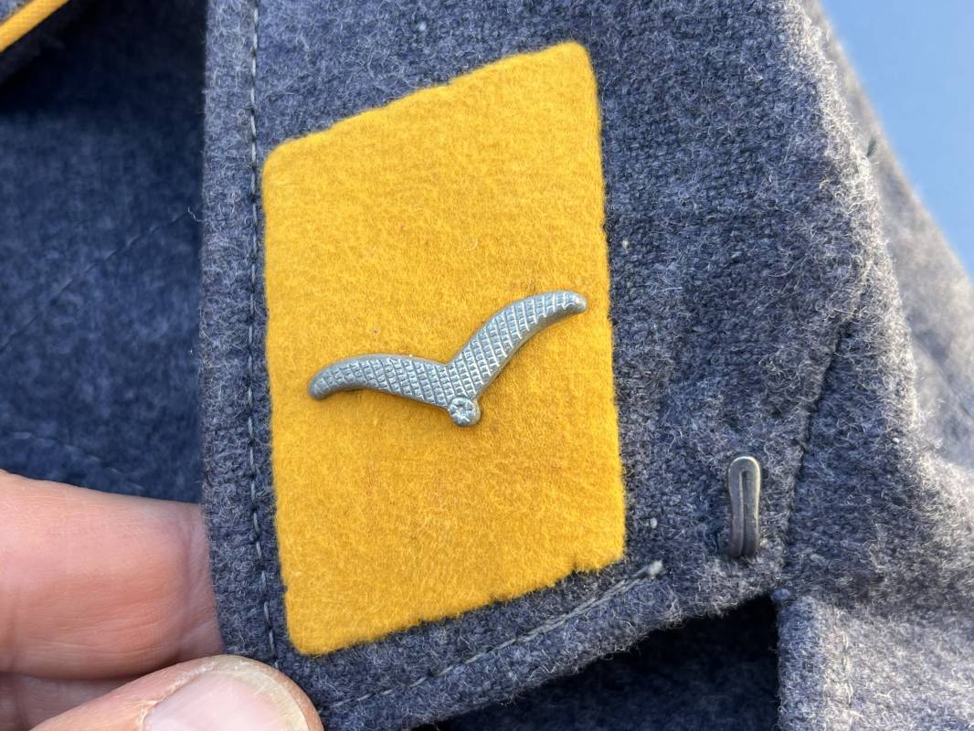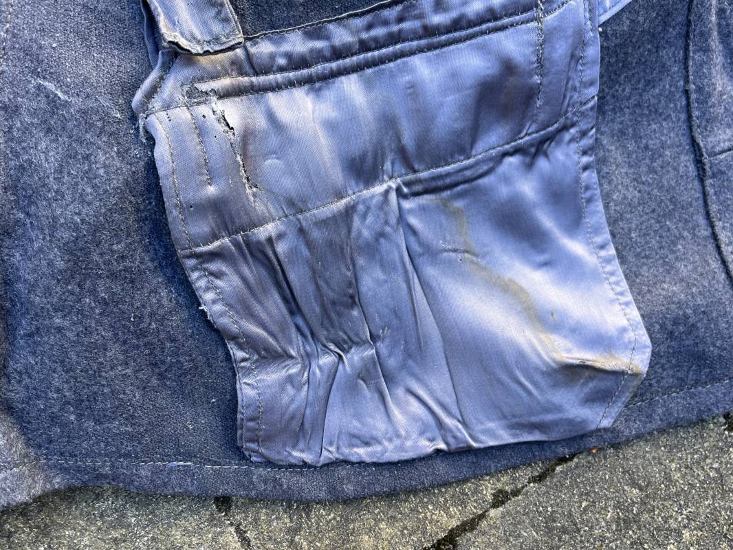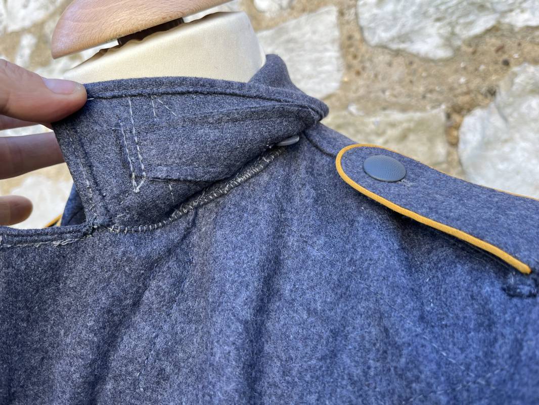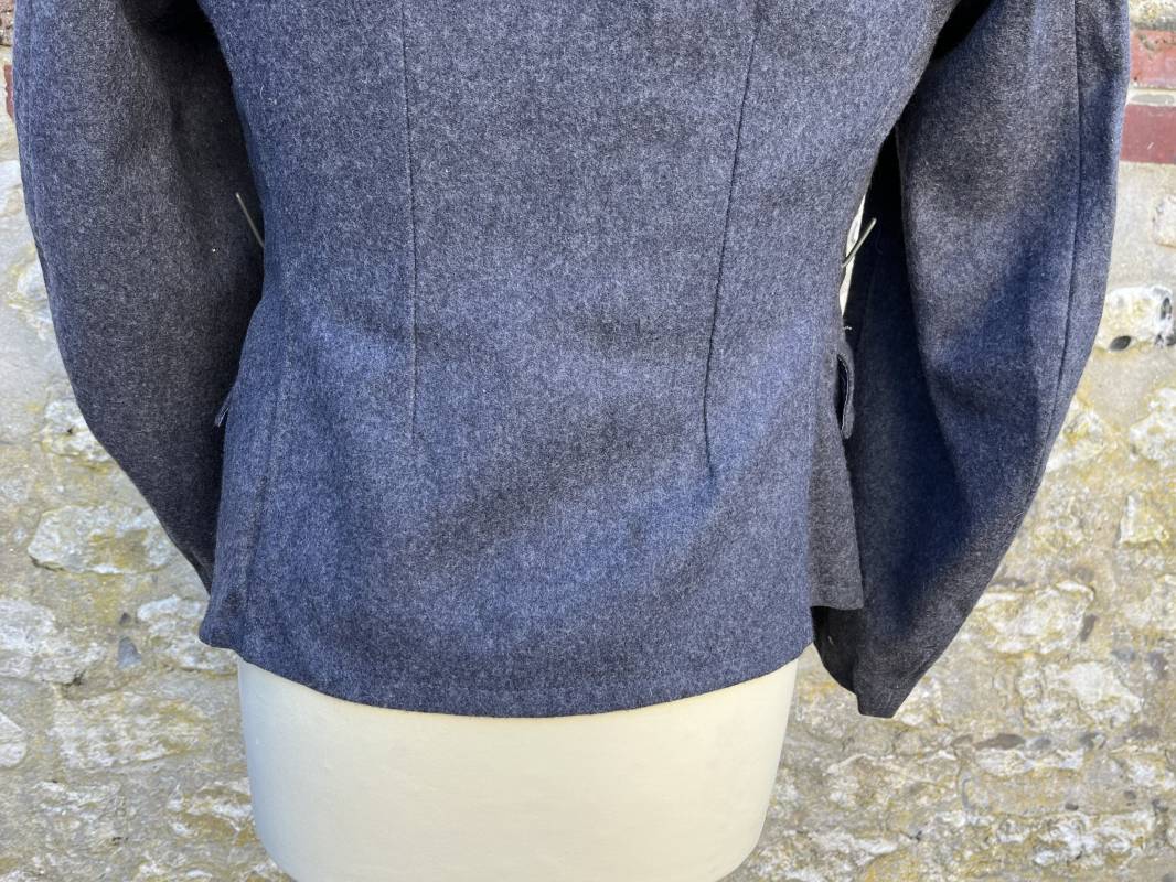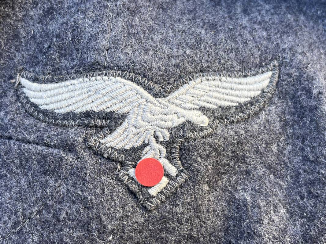 Rare Flieger Blouse d un chasseur parachutiste ( Fallschirmjager) de la Luftwaffe Veste de dotation ( Fliegerbluse) en drap gris bleu . Cette veste est entièrement montée d 'origine . 100% Nature et totalement intouchée . Pattes de col liseré jaune d or de chasseur parachutiste de la LW , pattes d 'épaules a rabats liseré en rayonne jaune d or Aigle de poitrine du modele brodé coton monté machine d 'origine couture zig zag . Brevet de chasseur parachutiste de la Luftwaffe cousu mains sur la poitrine . Brevet brodé coton. Drap de fond gris bleu. .Tous les boutons sont présents et montés d origine . Deux poches basses a rabats boutonnés . Intérieur de la veste doublée en satinette gris bleu violacé . Deux poches intérieures et poche a pansement individuel . Marquage encre code fabricant Rbnr et Tailles . Largeur épaules 41 cm , longueur 65 cm , manche 59 cm . Superbe blouse légérement portée en superbe état . Rare veste sans aucun défaut pour unité d élite de la Luftwaffe Ref 18053