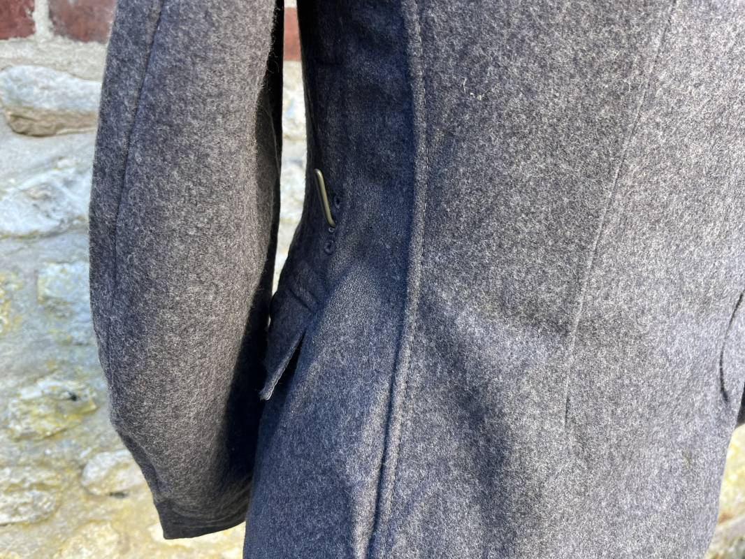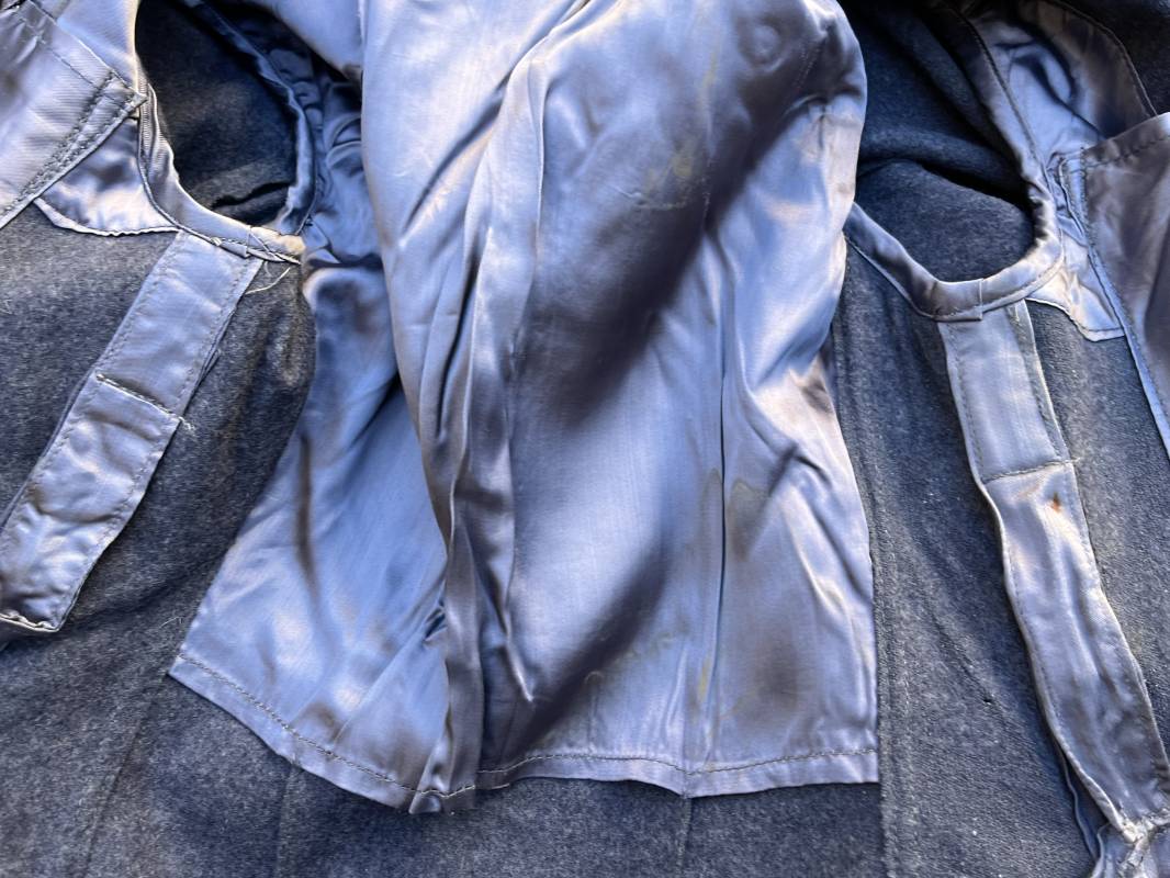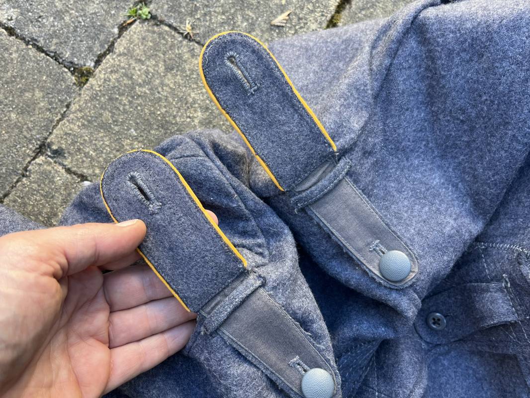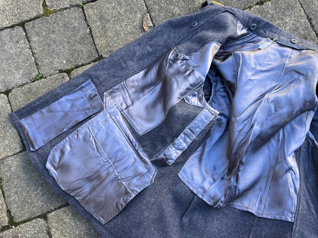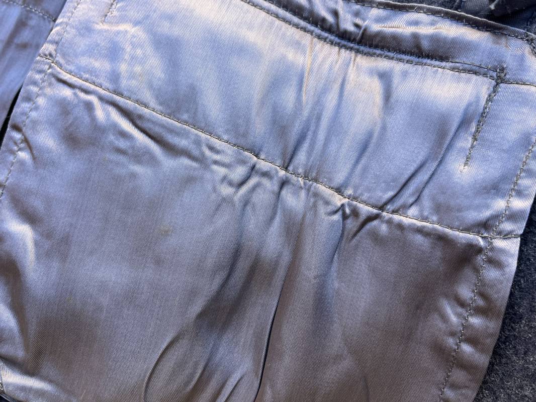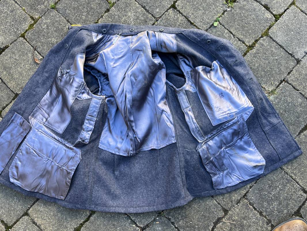 Rare Flieger Blouse d un chasseur parachutiste ( Fallschirmjager) de la Luftwaffe Veste de dotation ( Fliegerbluse) en drap gris bleu . Cette veste est entièrement montée d 'origine . 100% Nature et totalement intouchée . Pattes de col liseré jaune d or de chasseur parachutiste de la LW , pattes d 'épaules a rabats liseré en rayonne jaune d or Aigle de poitrine du modele brodé coton monté machine d 'origine couture zig zag . Brevet de chasseur parachutiste de la Luftwaffe cousu mains sur la poitrine . Brevet brodé coton. Drap de fond gris bleu. .Tous les boutons sont présents et montés d origine . Deux poches basses a rabats boutonnés . Intérieur de la veste doublée en satinette gris bleu violacé . Deux poches intérieures et poche a pansement individuel . Marquage encre code fabricant Rbnr et Tailles . Largeur épaules 41 cm , longueur 65 cm , manche 59 cm . Superbe blouse légérement portée en superbe état . Rare veste sans aucun défaut pour unité d élite de la Luftwaffe Ref 18053