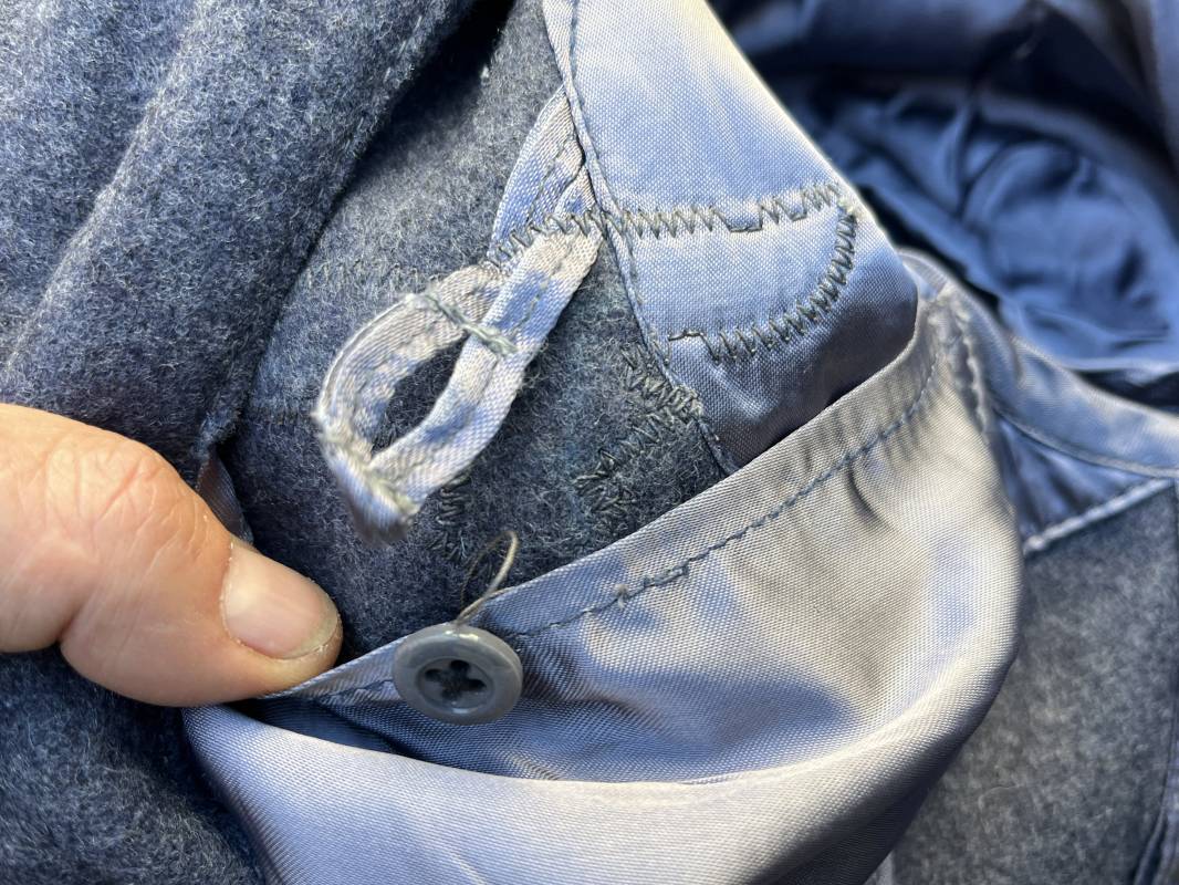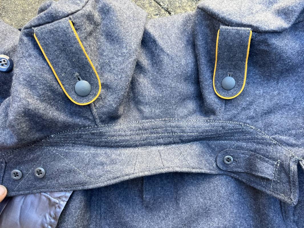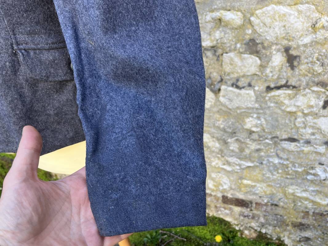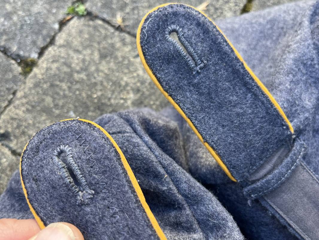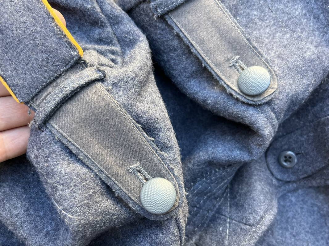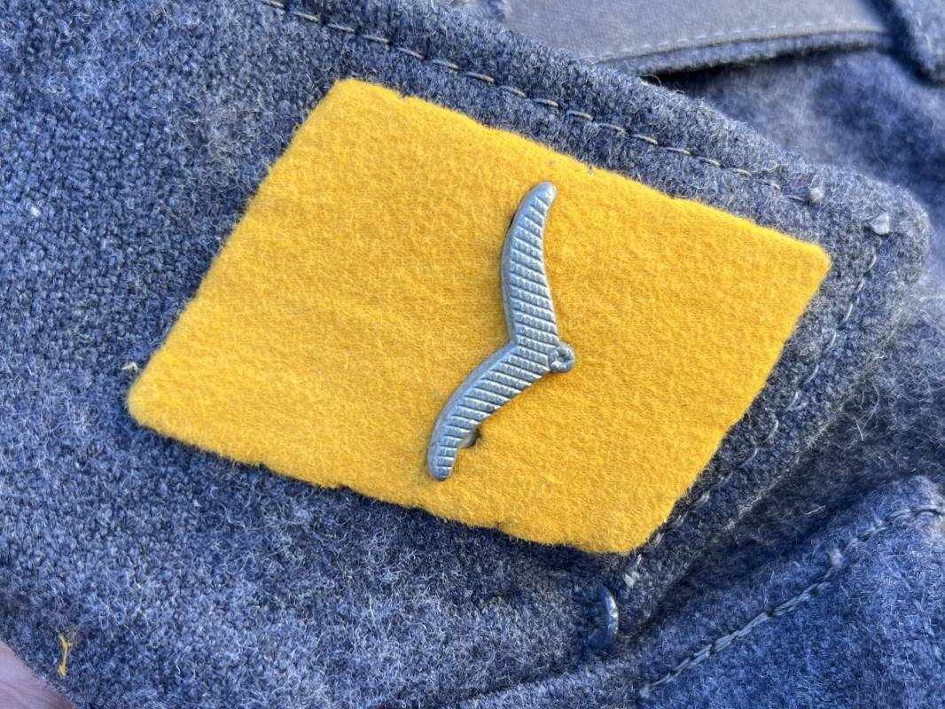 Rare Flieger Blouse d un chasseur parachutiste ( Fallschirmjager) de la Luftwaffe Veste de dotation ( Fliegerbluse) en drap gris bleu . Cette veste est entièrement montée d 'origine . 100% Nature et totalement intouchée . Pattes de col liseré jaune d or de chasseur parachutiste de la LW , pattes d 'épaules a rabats liseré en rayonne jaune d or Aigle de poitrine du modele brodé coton monté machine d 'origine couture zig zag . Brevet de chasseur parachutiste de la Luftwaffe cousu mains sur la poitrine . Brevet brodé coton. Drap de fond gris bleu. .Tous les boutons sont présents et montés d origine . Deux poches basses a rabats boutonnés . Intérieur de la veste doublée en satinette gris bleu violacé . Deux poches intérieures et poche a pansement individuel . Marquage encre code fabricant Rbnr et Tailles . Largeur épaules 41 cm , longueur 65 cm , manche 59 cm . Superbe blouse légérement portée en superbe état . Rare veste sans aucun défaut pour unité d élite de la Luftwaffe Ref 18053