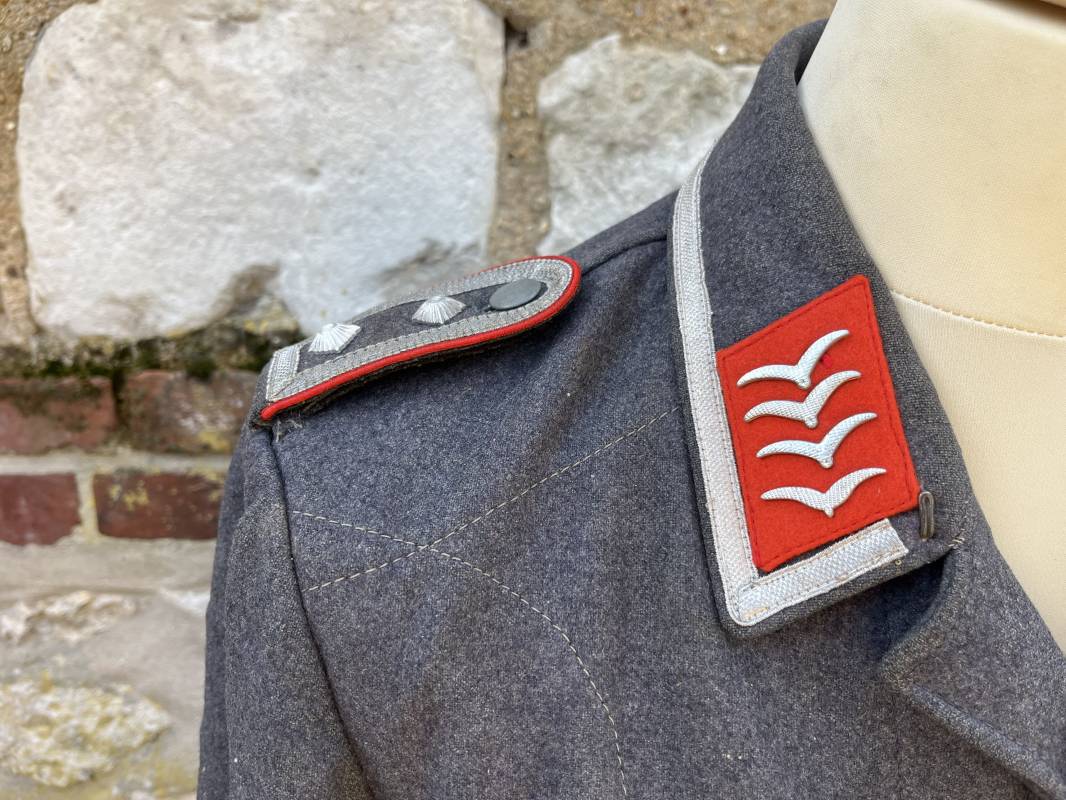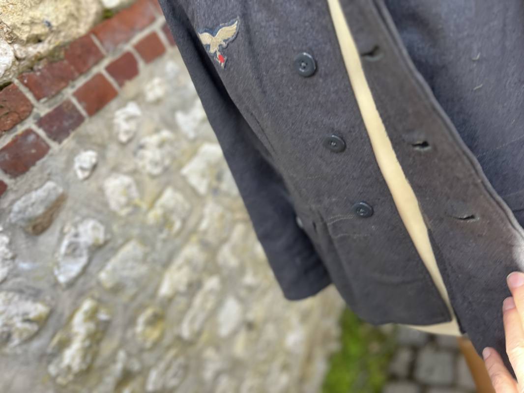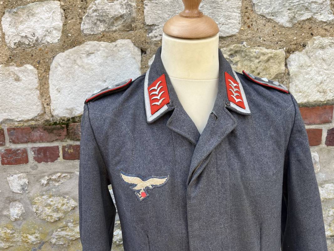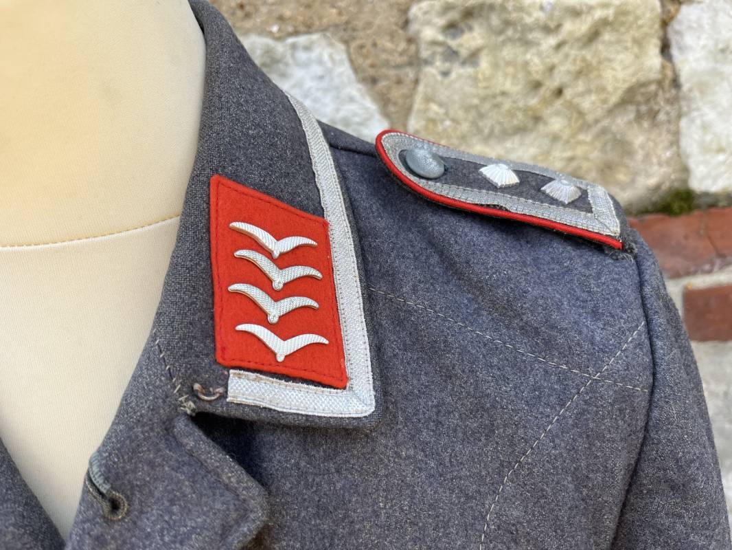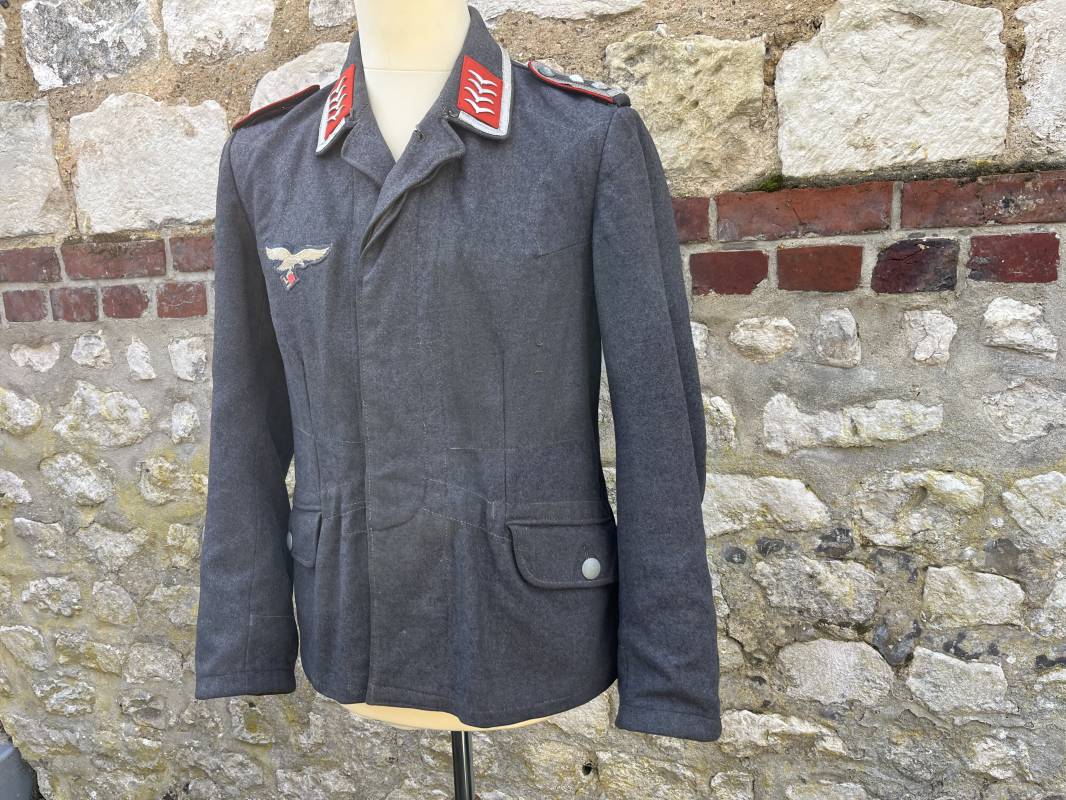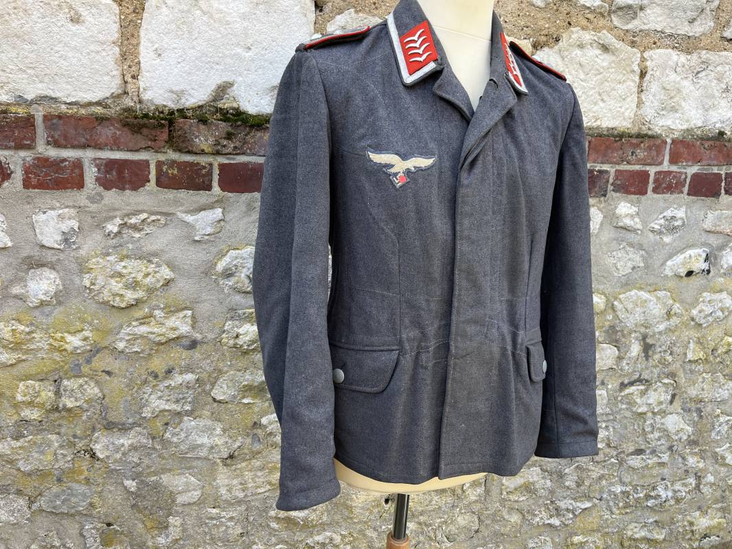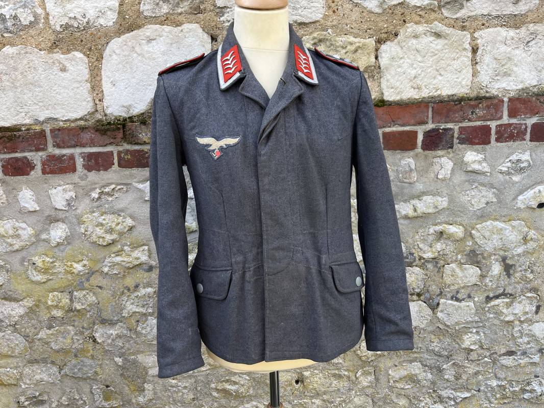 Trés belle veste ' Flieger Bluse' de la Luftwaffe d un sous officier artilleur ( Flak ) en drap gris bleu . Cette veste est entièrement montée d 'origine . 100% Nature et totalement intouchée . Pattes de col liseré rouge de l artillerie avec mouettes métalliques de grade , galon de col de sous officier , montés machine d origine , pattes d 'épaules a rabats liseré rouge avec galons de sous officier au grade d adjudant Chef ( Ober Feldwebel ) Aigle de poitrine du modele brodé coton monté machine d 'origine avec couture Zig Zag . Passants pour badge de poitrine .Tous les boutons sont présents et montés d origine . Deux poches basses à rabats boutonnés . Intérieur de la veste doublée en coton gris bleu . Deux poches intérieures et poche a pansement individuel . Marquage encre fabricant et Tailles tampon réception LBA 1940 . Largeur épaules 45 cm , longueur 67 cm , manche 63 cm . Superbe blouse légérement portée en parfait état . Trés belle patine générale . Ref 21314