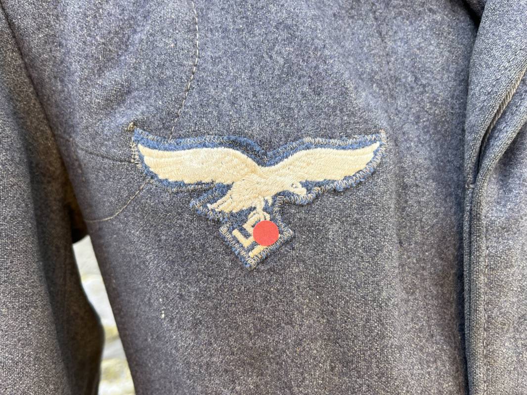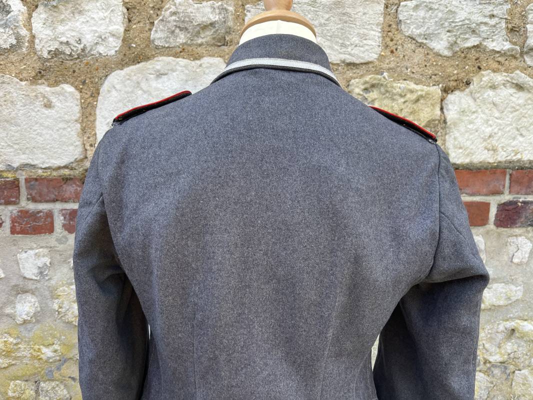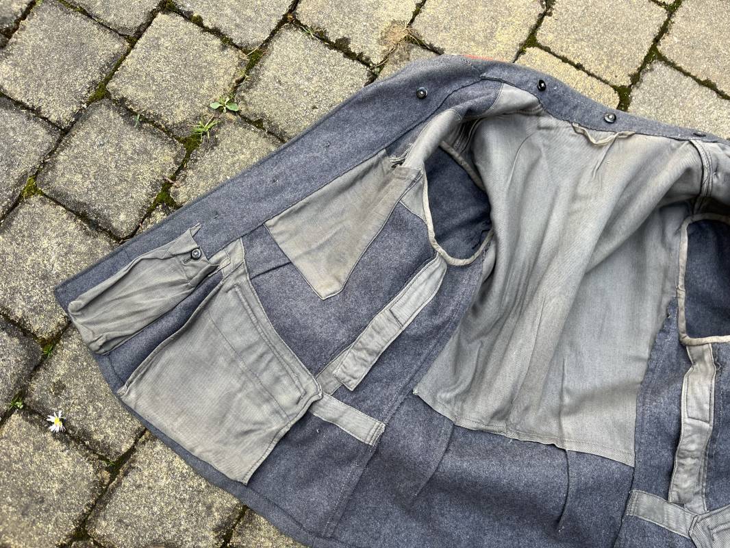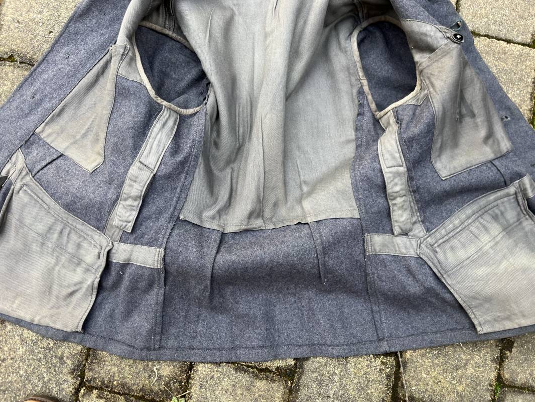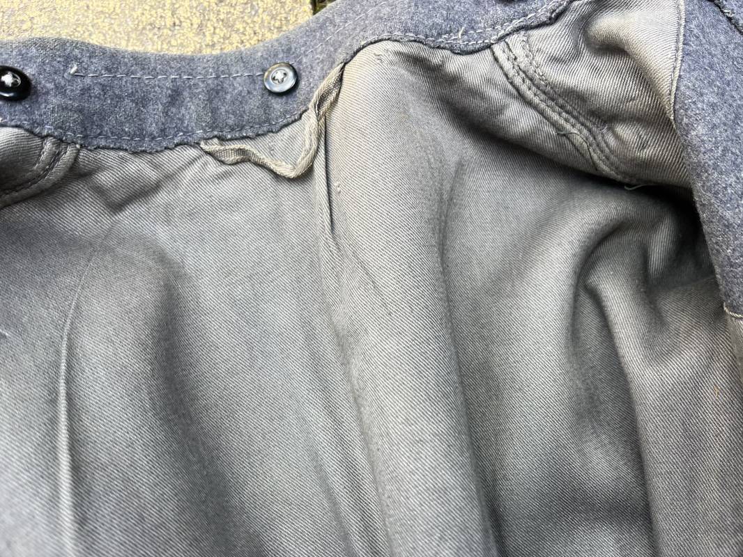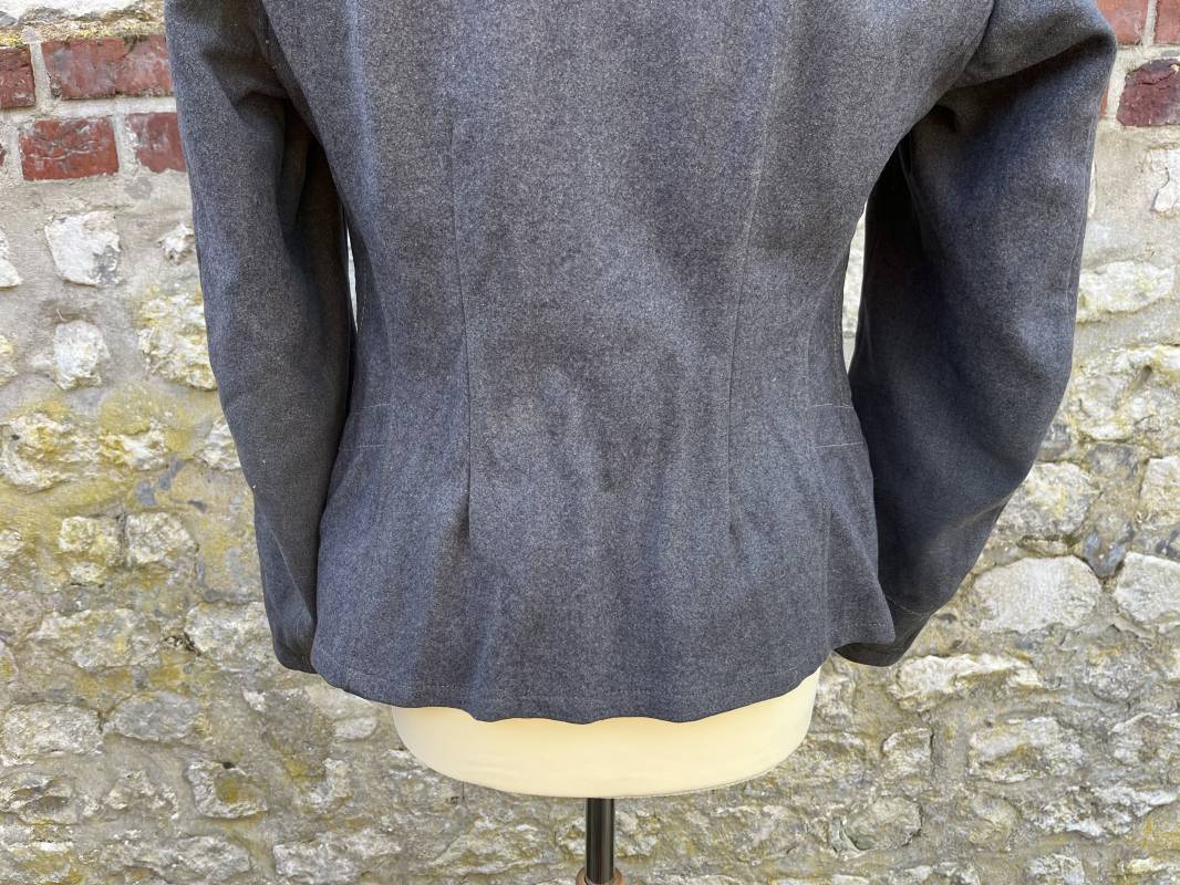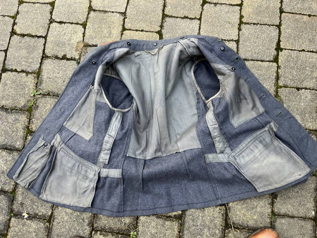 Trés belle veste ' Flieger Bluse' de la Luftwaffe d un sous officier artilleur ( Flak ) en drap gris bleu . Cette veste est entièrement montée d 'origine . 100% Nature et totalement intouchée . Pattes de col liseré rouge de l artillerie avec mouettes métalliques de grade , galon de col de sous officier , montés machine d origine , pattes d 'épaules a rabats liseré rouge avec galons de sous officier au grade d adjudant Chef ( Ober Feldwebel ) Aigle de poitrine du modele brodé coton monté machine d 'origine avec couture Zig Zag . Passants pour badge de poitrine .Tous les boutons sont présents et montés d origine . Deux poches basses à rabats boutonnés . Intérieur de la veste doublée en coton gris bleu . Deux poches intérieures et poche a pansement individuel . Marquage encre fabricant et Tailles tampon réception LBA 1940 . Largeur épaules 45 cm , longueur 67 cm , manche 63 cm . Superbe blouse légérement portée en parfait état . Trés belle patine générale . Ref 21314