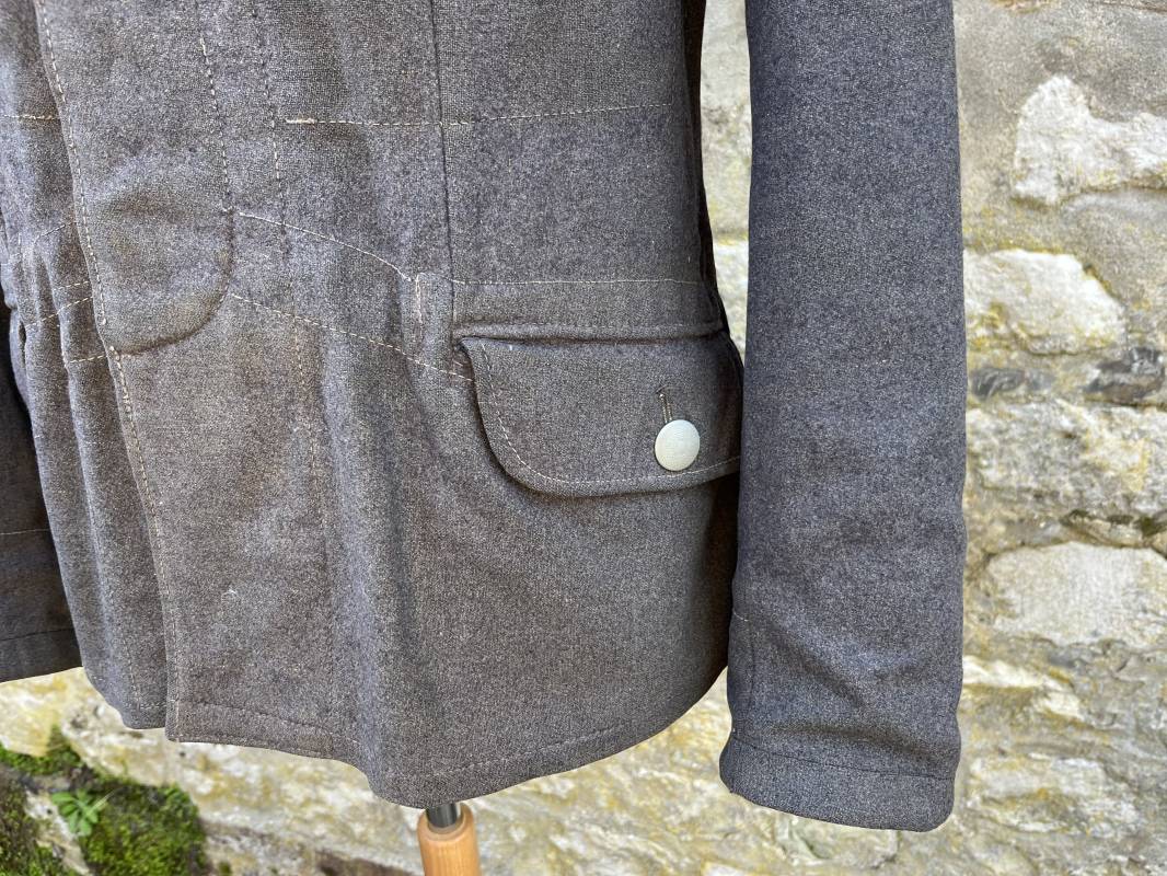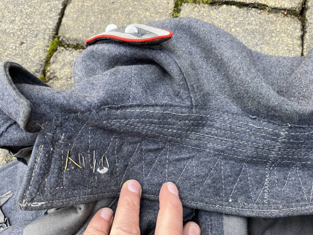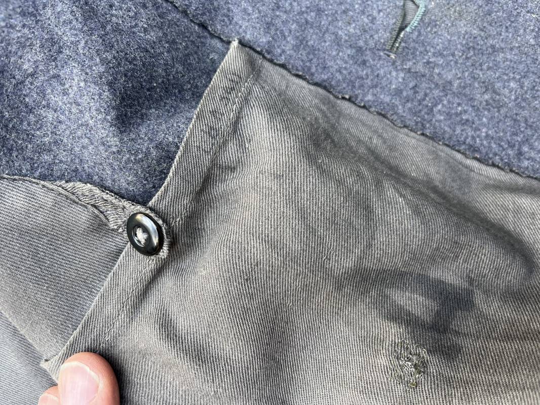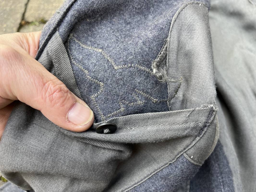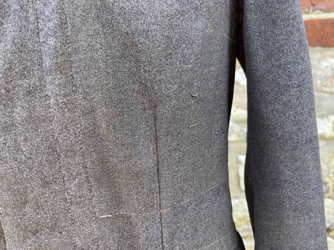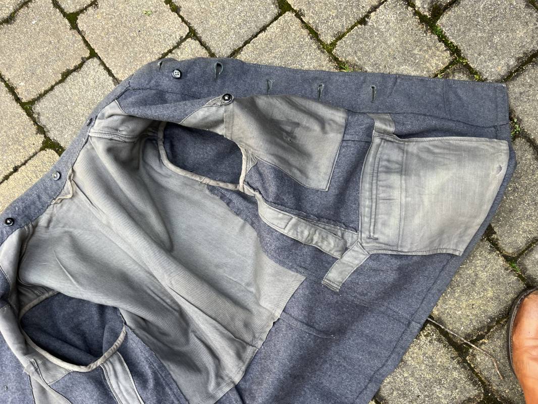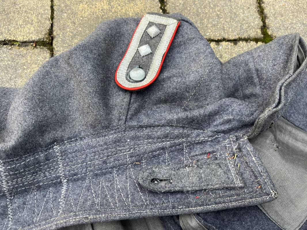 Trés belle veste ' Flieger Bluse' de la Luftwaffe d un sous officier artilleur ( Flak ) en drap gris bleu . Cette veste est entièrement montée d 'origine . 100% Nature et totalement intouchée . Pattes de col liseré rouge de l artillerie avec mouettes métalliques de grade , galon de col de sous officier , montés machine d origine , pattes d 'épaules a rabats liseré rouge avec galons de sous officier au grade d adjudant Chef ( Ober Feldwebel ) Aigle de poitrine du modele brodé coton monté machine d 'origine avec couture Zig Zag . Passants pour badge de poitrine .Tous les boutons sont présents et montés d origine . Deux poches basses à rabats boutonnés . Intérieur de la veste doublée en coton gris bleu . Deux poches intérieures et poche a pansement individuel . Marquage encre fabricant et Tailles tampon réception LBA 1940 . Largeur épaules 45 cm , longueur 67 cm , manche 63 cm . Superbe blouse légérement portée en parfait état . Trés belle patine générale . Ref 21314