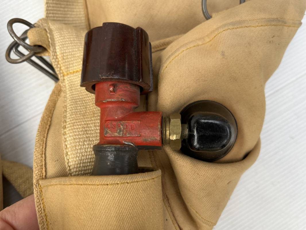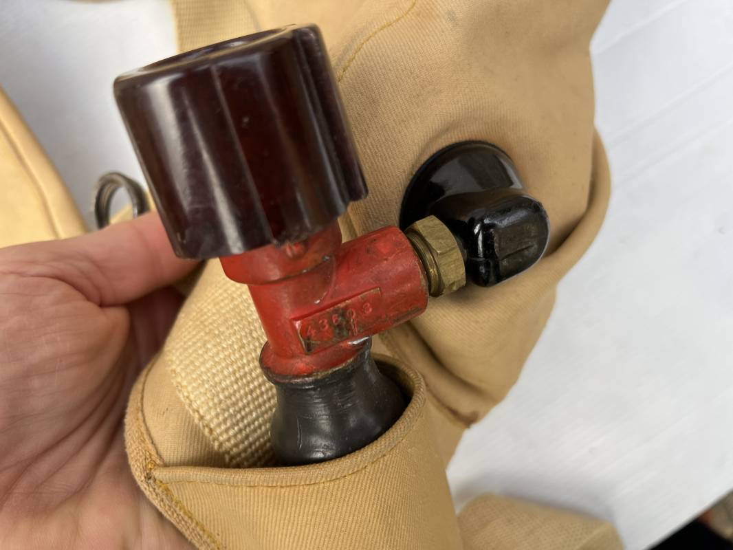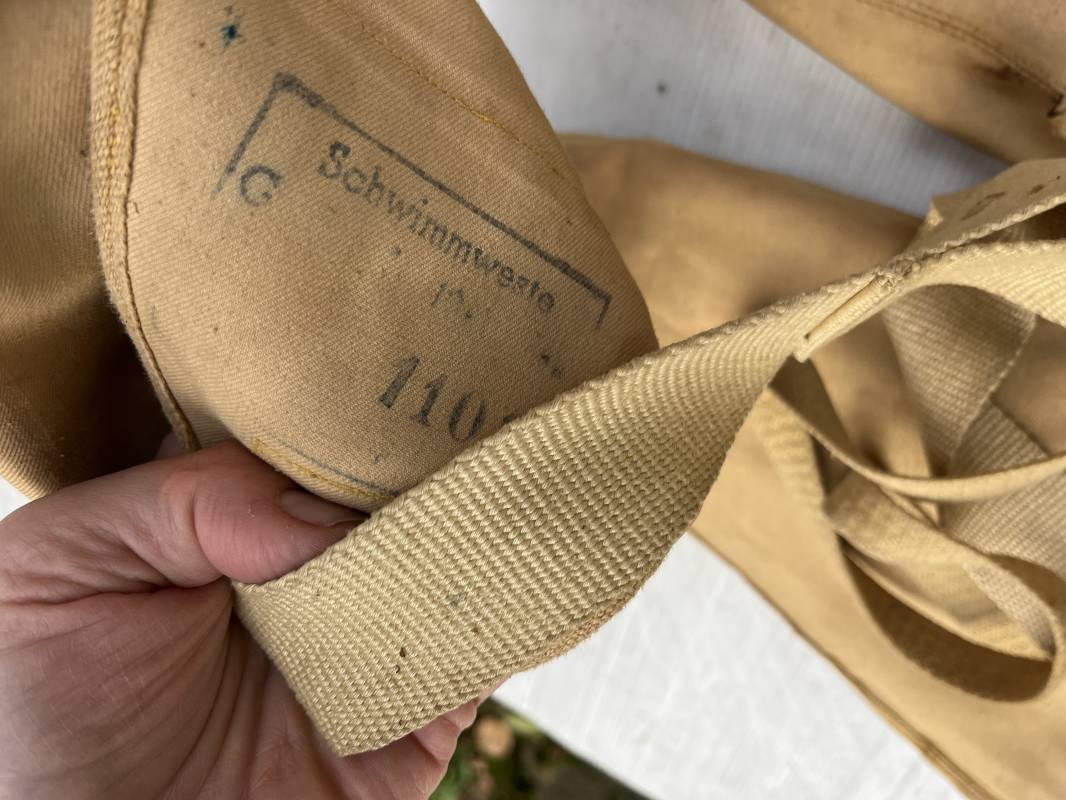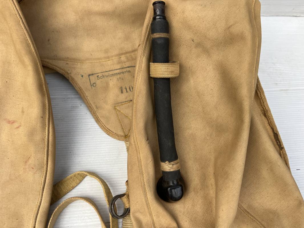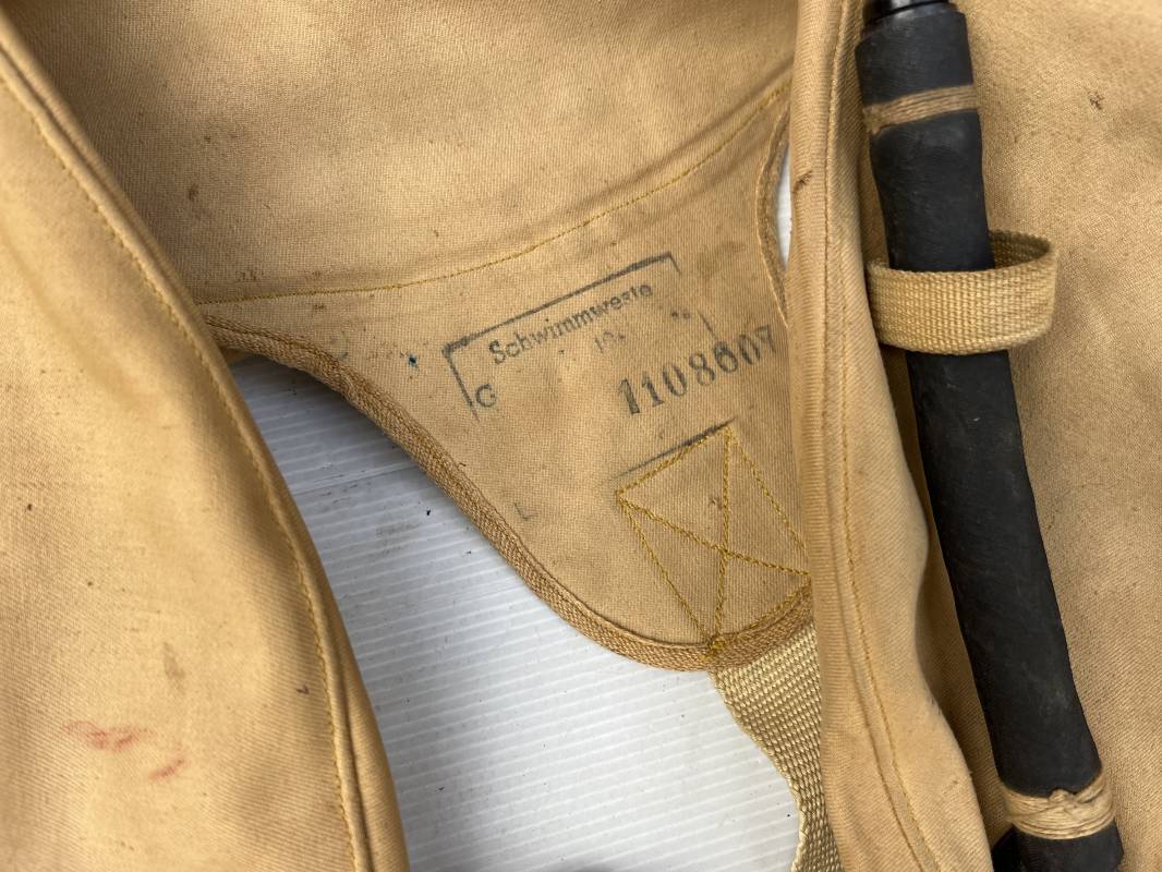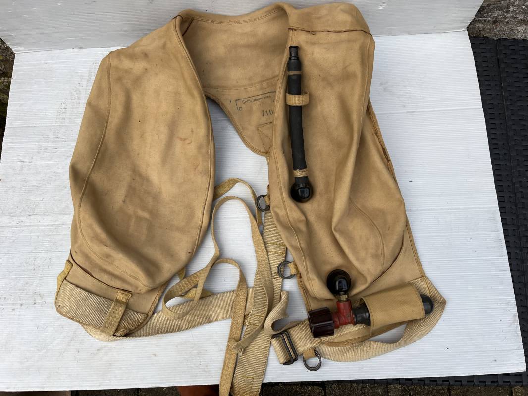 Rare gilet de sauvetage d 'un navigant de la Luftwaffe modele 10-30-B2 . Gilet en caoutchouc jaune complet avec toutes ses sangle en tile de coton filé . Boucles metalliques . Bouteille de gonflage automatique datée 8 1944 , poignée et embase Bakélite marron . Caoutchouc souple . Tube caoutchouc pour gonflage bucal , embout et embase en bakélite marron . Marquage encre ' Schimmweste et matricule ' . Tampon de réception de la Marine KM . Gilet légèrement porté en parfait état 1940/45 Ref 21536