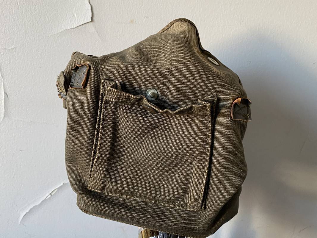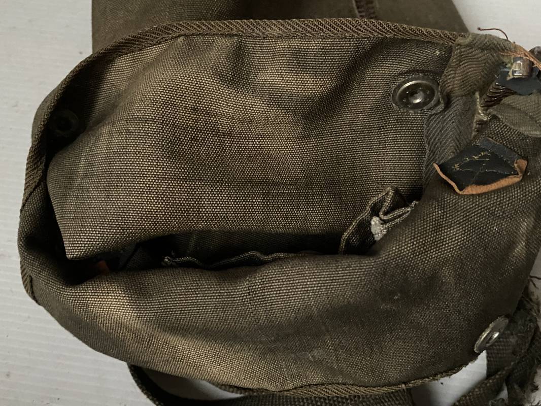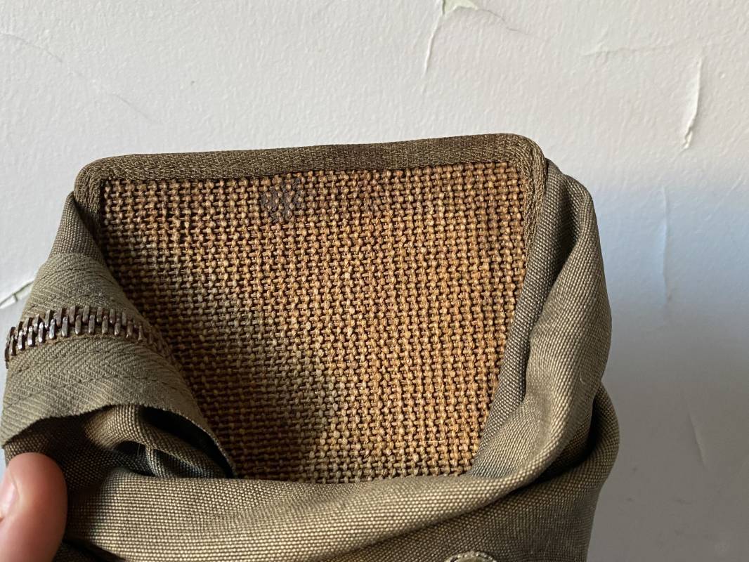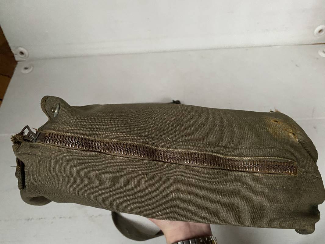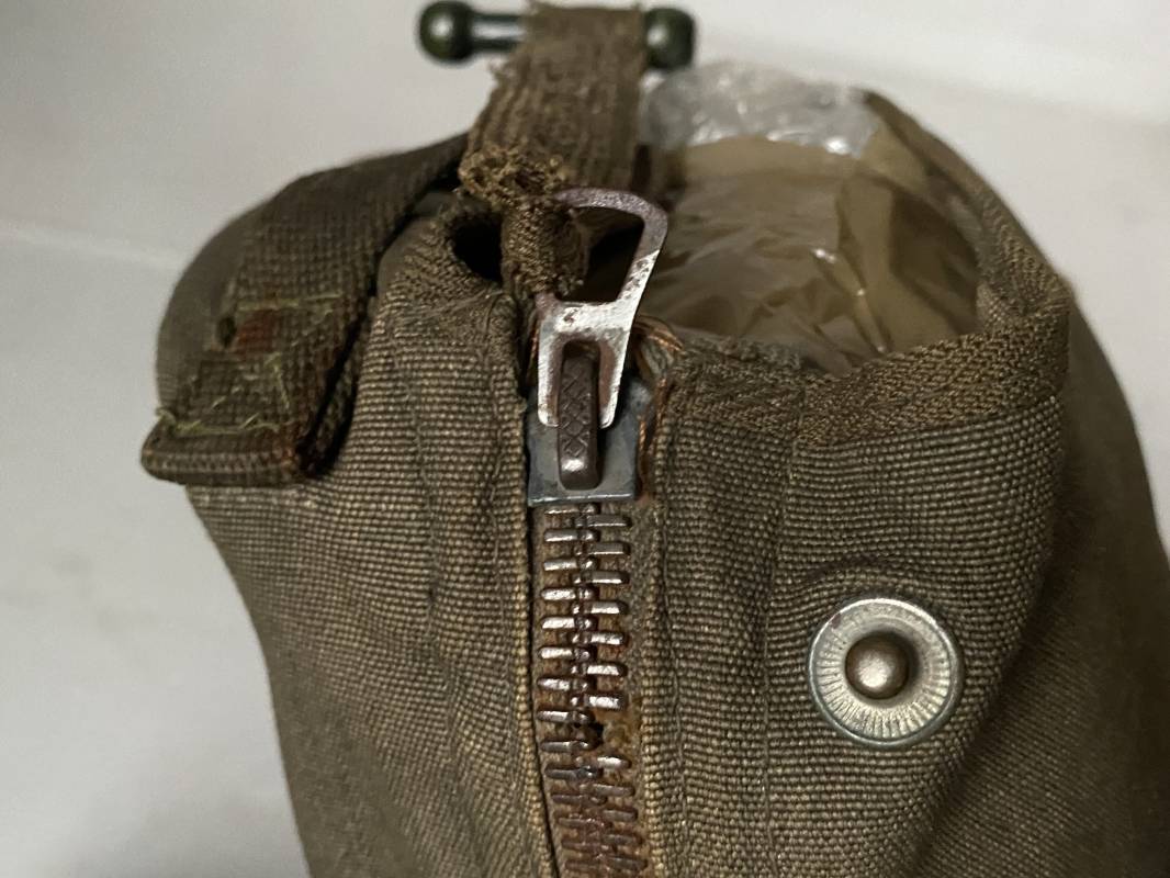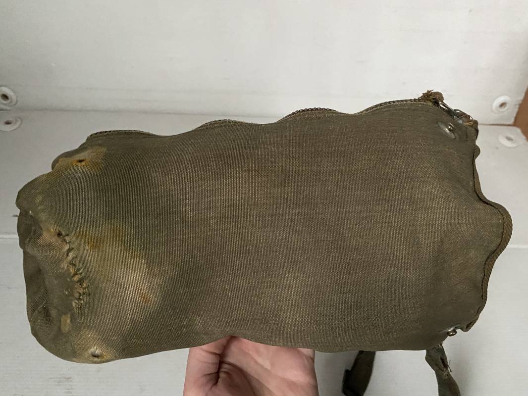 Rare housse de masque de protection d'un chasseur parachutiste de la Luftwaffe. Housse en toile fine de coton vert. Fabrication 1943. Rabat avec boutons pression Prym. Pochette toile pour occulaire. Renfort intérieur en carton cuir. Plug caoutchouc noir en fond de housse pour fixation du filtre, glissière d'origine et curseur avec tirette. Toile et cabillot bois. Fabricant Prym. La glissière est présente mais semble bloquée (nous avons pas forcé ni huiler pour tenter de la descendre). Sangles longue et courte avec crochet fer plat et boucle métallique . Cette housse est portée avec traces de port et d'usage . 100% dans son jus. Belle pièce retrouvée à Avranches (50). Ref 17108