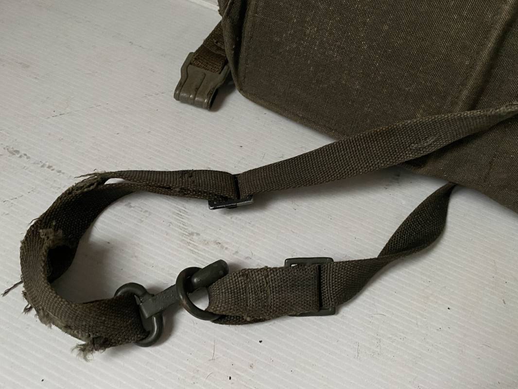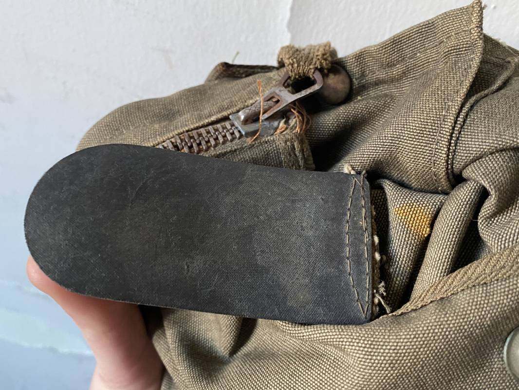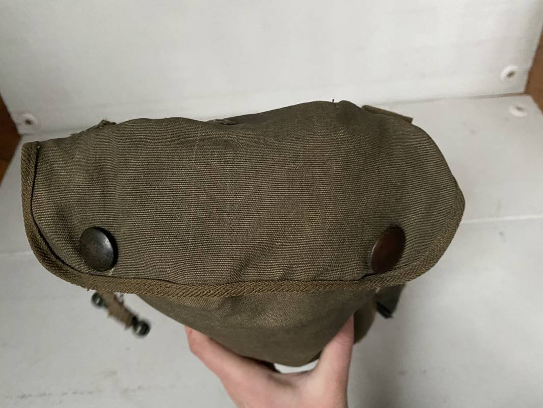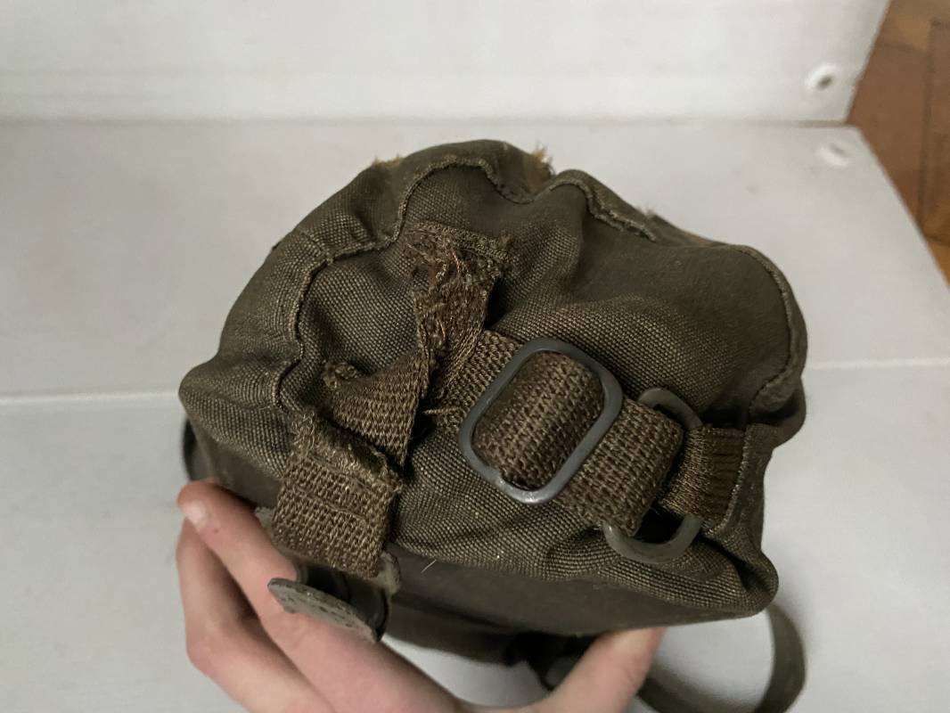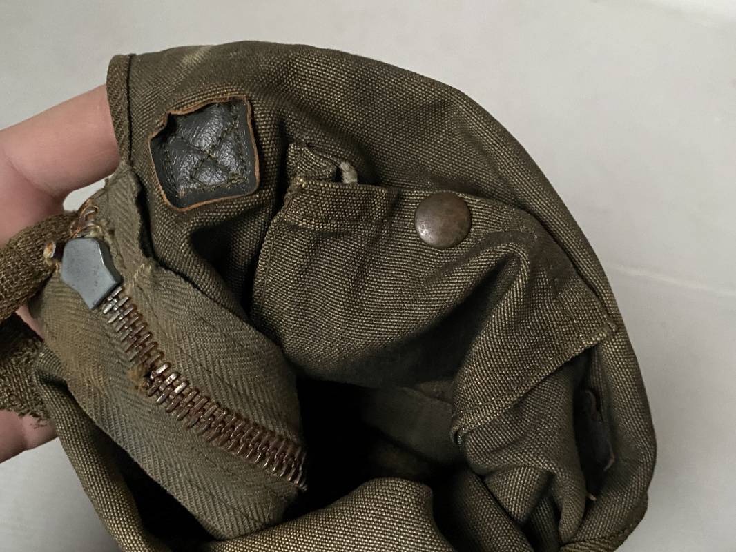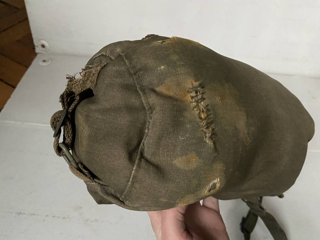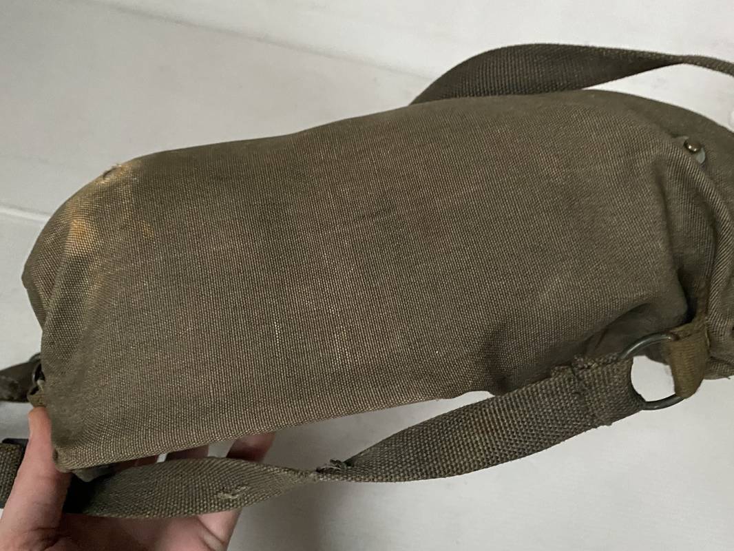Rare housse de masque de protection d'un chasseur parachutiste de la Luftwaffe. Housse en toile fine de coton vert. Fabrication 1943. Rabat avec boutons pression Prym. Pochette toile pour occulaire. Renfort intérieur en carton cuir. Plug caoutchouc noir en fond de housse pour fixation du filtre, glissière d'origine et curseur avec tirette. Toile et cabillot bois. Fabricant Prym. La glissière est présente mais semble bloquée (nous avons pas forcé ni huiler pour tenter de la descendre). Sangles longue et courte avec crochet fer plat et boucle métallique . Cette housse est portée avec traces de port et d'usage . 100% dans son jus. Belle pièce retrouvée à Avranches (50). Ref 17108