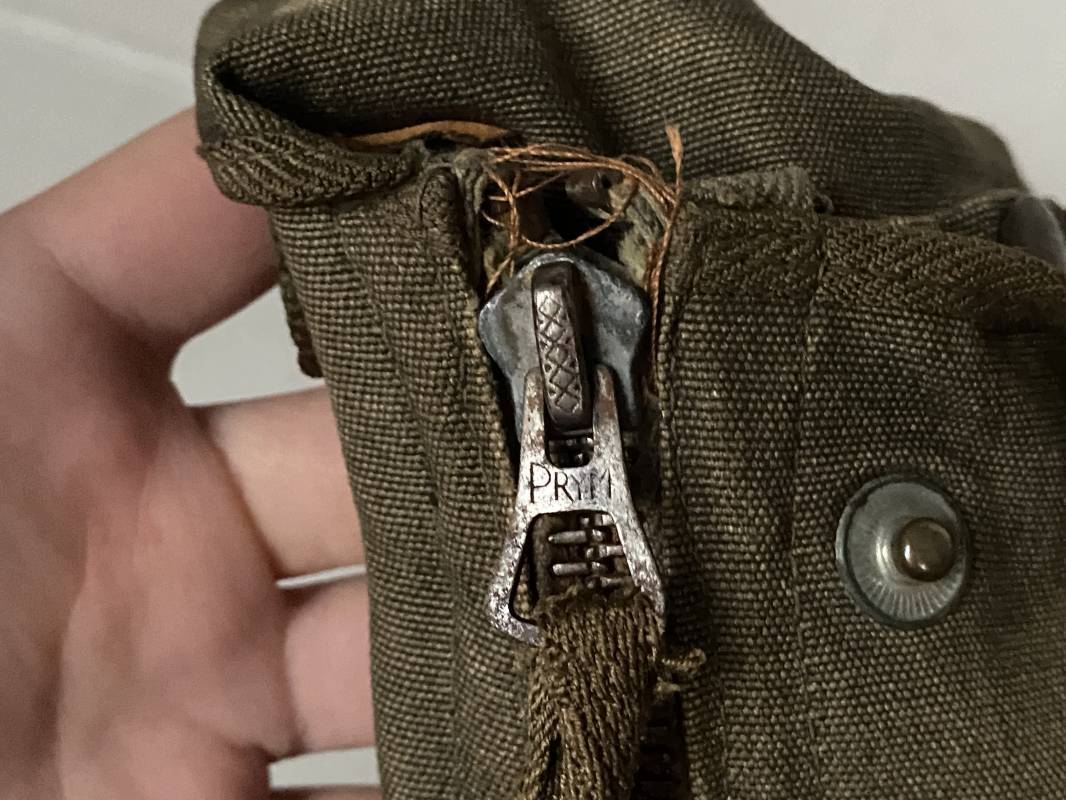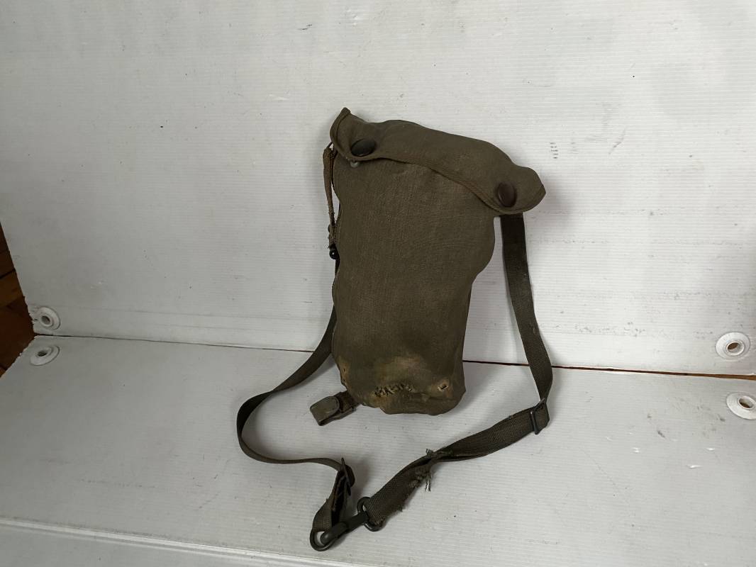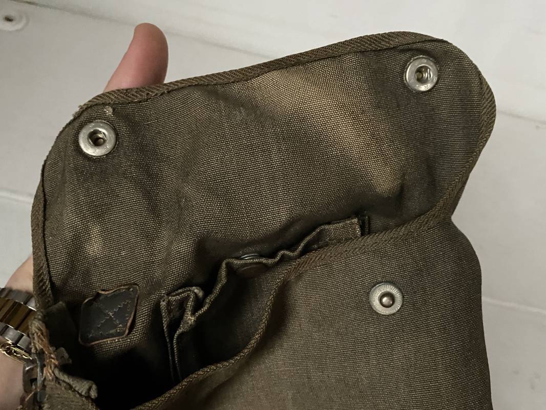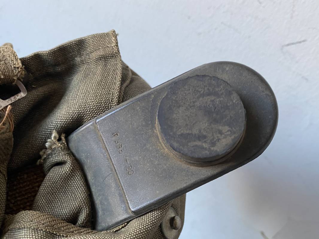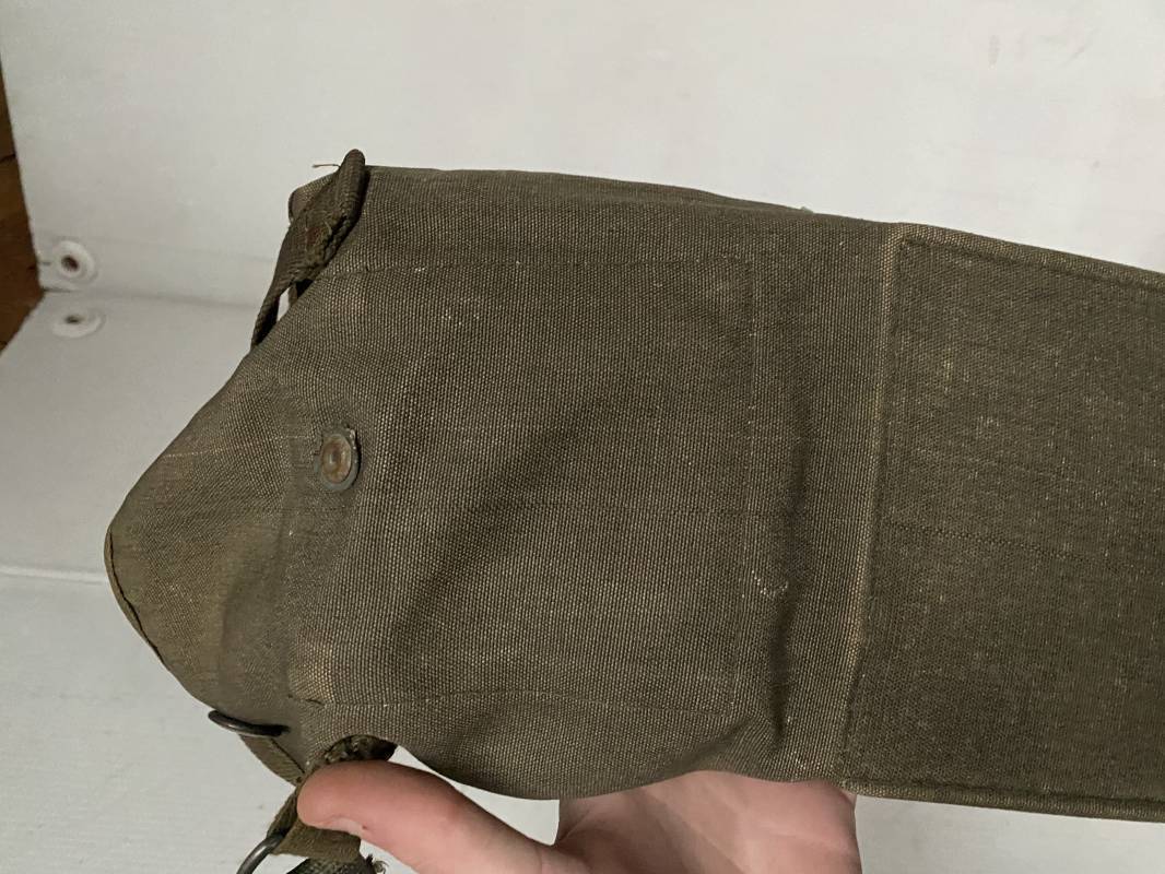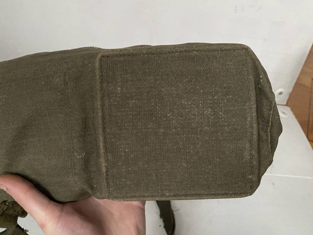 Rare housse de masque de protection d'un chasseur parachutiste de la Luftwaffe. Housse en toile fine de coton vert. Fabrication 1943. Rabat avec boutons pression Prym. Pochette toile pour occulaire. Renfort intérieur en carton cuir. Plug caoutchouc noir en fond de housse pour fixation du filtre, glissière d'origine et curseur avec tirette. Toile et cabillot bois. Fabricant Prym. La glissière est présente mais semble bloquée (nous avons pas forcé ni huiler pour tenter de la descendre). Sangles longue et courte avec crochet fer plat et boucle métallique . Cette housse est portée avec traces de port et d'usage . 100% dans son jus. Belle pièce retrouvée à Avranches (50). Ref 17108
