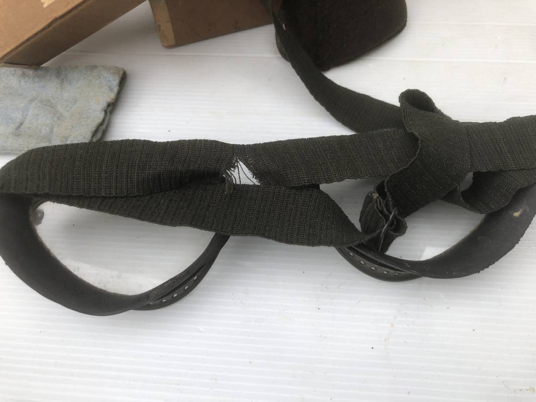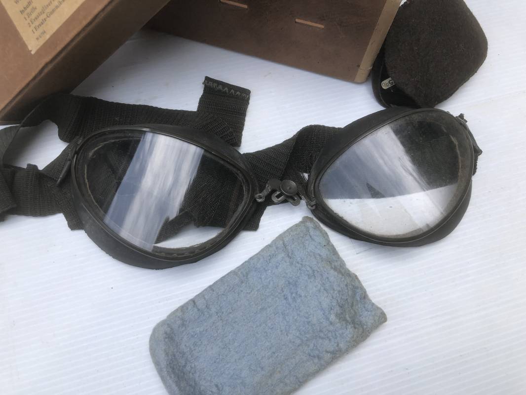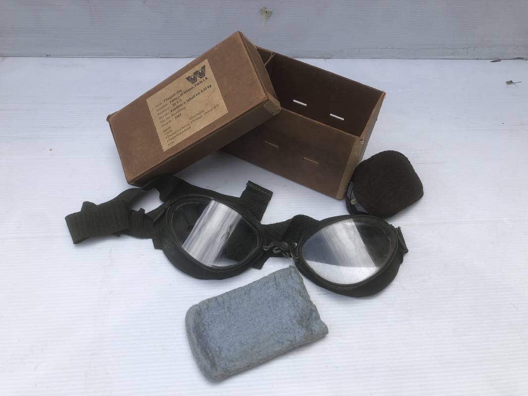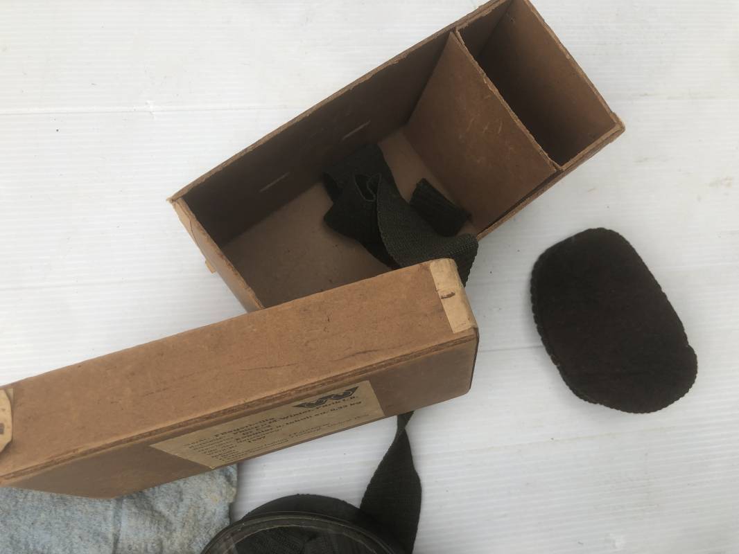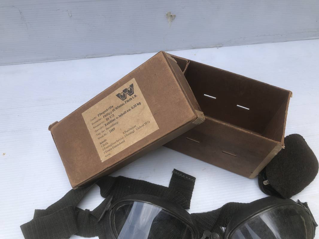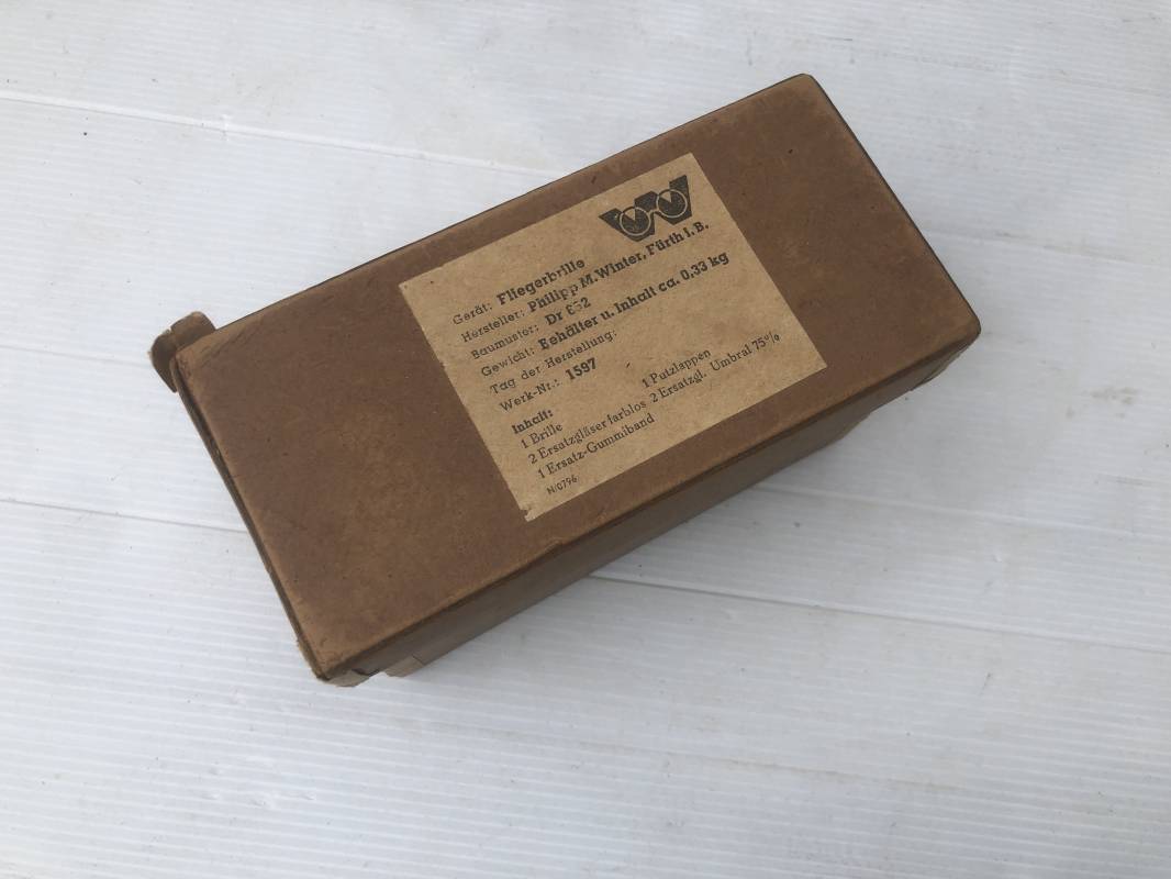 Très belle paire de lunettes de vol d'un Navigant de la Luftwaffe. Lunettes de col (Fliegerbrille ) modéle Dr 652 Verres blancs. Monture en alu peinte en vert. Pourtour en caoutchouc noir . Caoutchouc souple. Crochets métalliques de fixation. Marquage sur articulation métallique FD 42 Sangle en toile et boucle métallique de réglage. Légèrement porté en bon état . Verres de rechange de couleur foncé avec les deux pochettes en feutre . Rare boite en carton de conditionnement avec étiquette fabricant M Winter . Belle pièce de vitrine . Définitif en collection aviation de la Luftwaffe 1935/45. Ref 19178