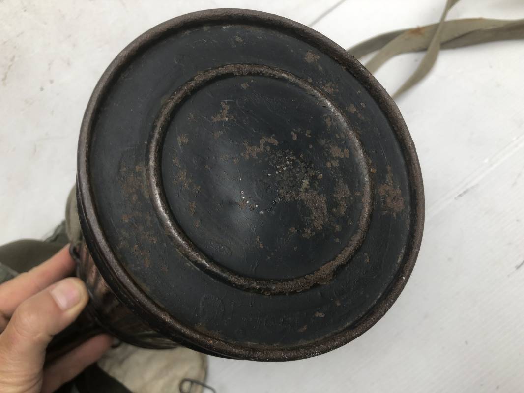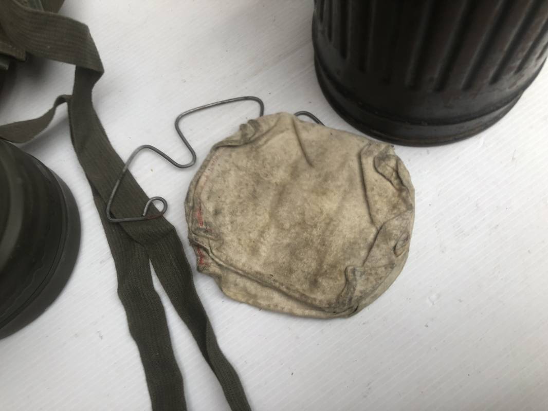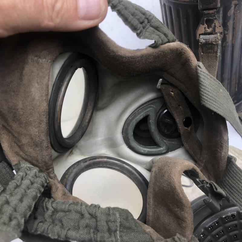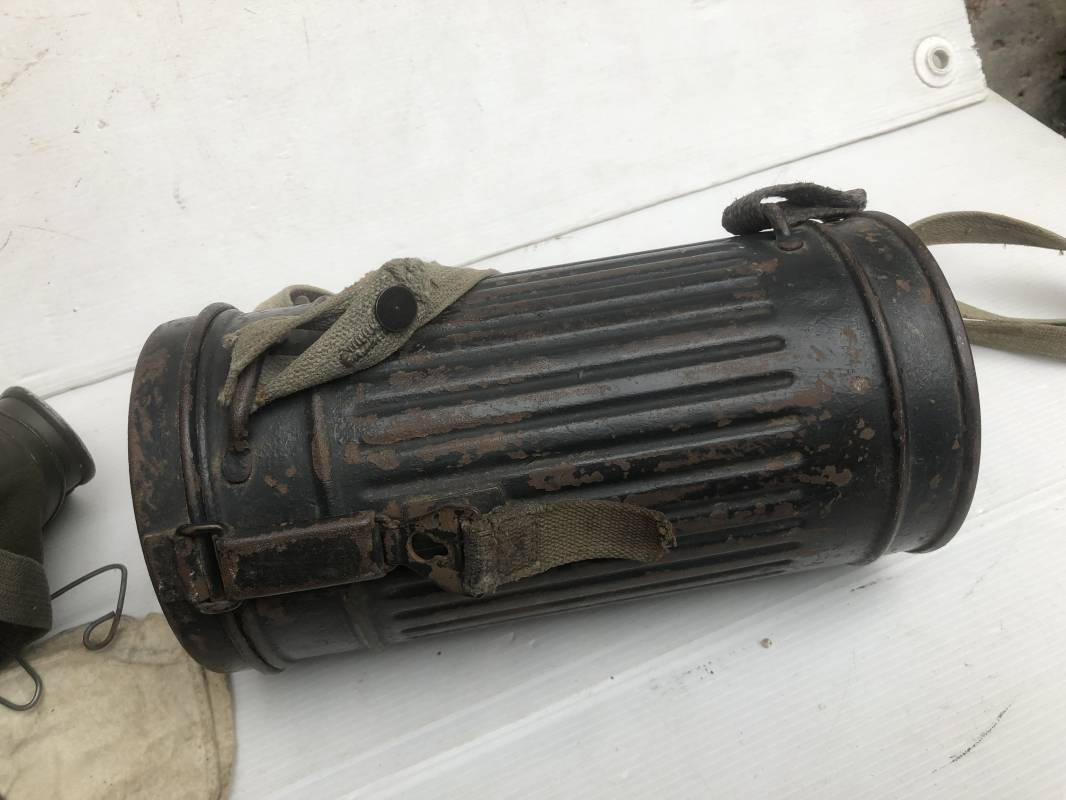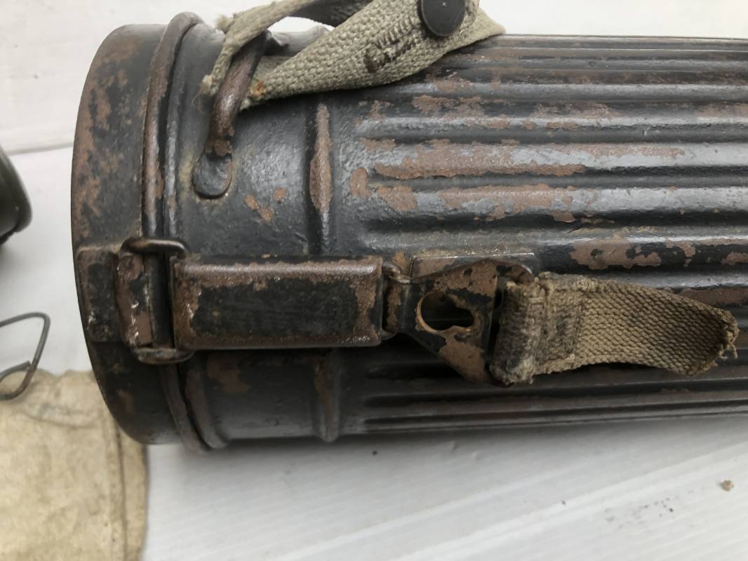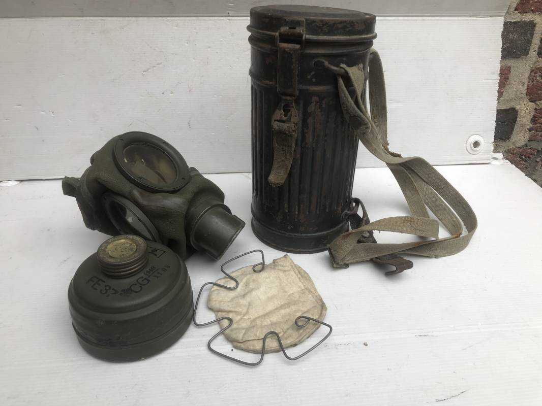 Rare masque de protection de la Luftwaffe modèle 1937 avec toutes ses sangles et accessoires. Boitier métallique 'court ' (25cm) avec peinture gris bleu d'origine.La peinture gris bleu est appliquée mains d'origine sur la peinture verte d'usinage . Marquage fabricant sur le couvercle et daté 1937 . Tampon encre WaA et aigle . Couvercle avec tirette toile et ressort métallique. Sangles longue et courte d'origines. La petite sangle est en toile gris bleu ! Verres de rechange. Chiffon et ressort métallique en fond de boitier. Masque de protection en toile verte daté 1940 . Occulaire et filtre FE 37 avec marquages encre noir daté 1940 , bouchon à visse . Bel ensemble porté en bel état.100% nature et intouché . Masque et boitier trouvé dans l'Eure ( 27 ) Rare modéle court de la LW Ref 17188