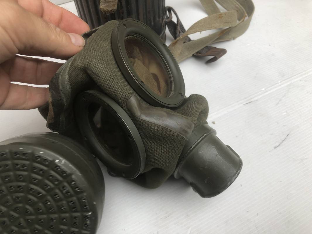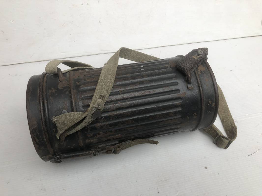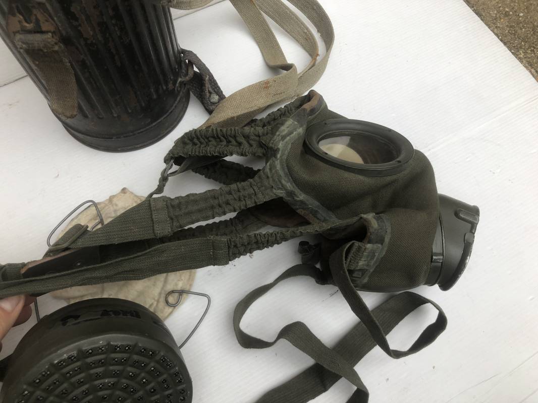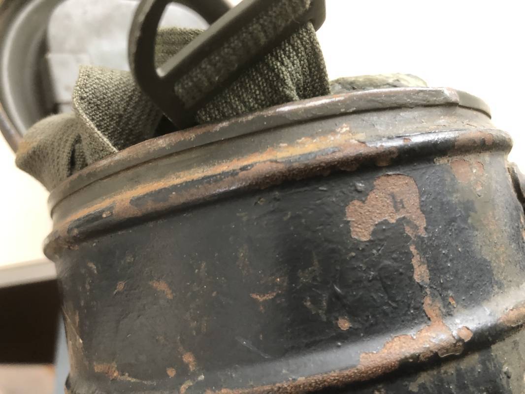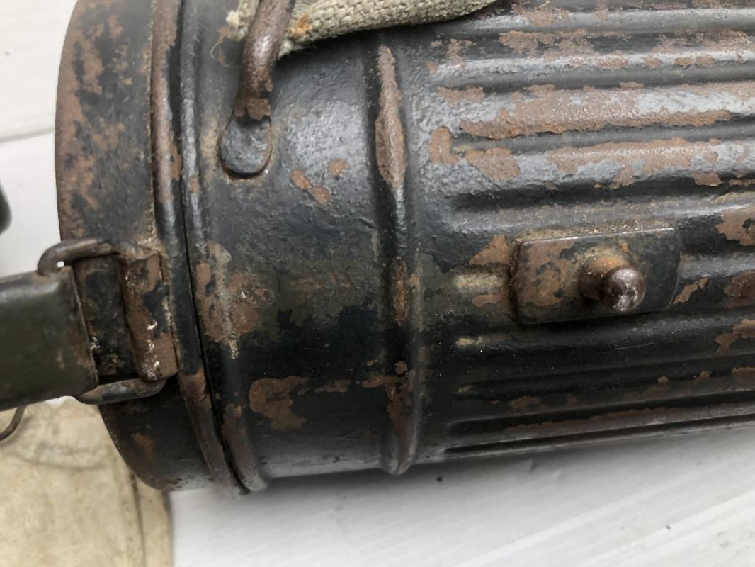 Rare masque de protection de la Luftwaffe modèle 1937 avec toutes ses sangles et accessoires. Boitier métallique 'court ' (25cm) avec peinture gris bleu d'origine.La peinture gris bleu est appliquée mains d'origine sur la peinture verte d'usinage . Marquage fabricant sur le couvercle et daté 1937 . Tampon encre WaA et aigle . Couvercle avec tirette toile et ressort métallique. Sangles longue et courte d'origines. La petite sangle est en toile gris bleu ! Verres de rechange. Chiffon et ressort métallique en fond de boitier. Masque de protection en toile verte daté 1940 . Occulaire et filtre FE 37 avec marquages encre noir daté 1940 , bouchon à visse . Bel ensemble porté en bel état.100% nature et intouché . Masque et boitier trouvé dans l'Eure ( 27 ) Rare modéle court de la LW Ref 17188