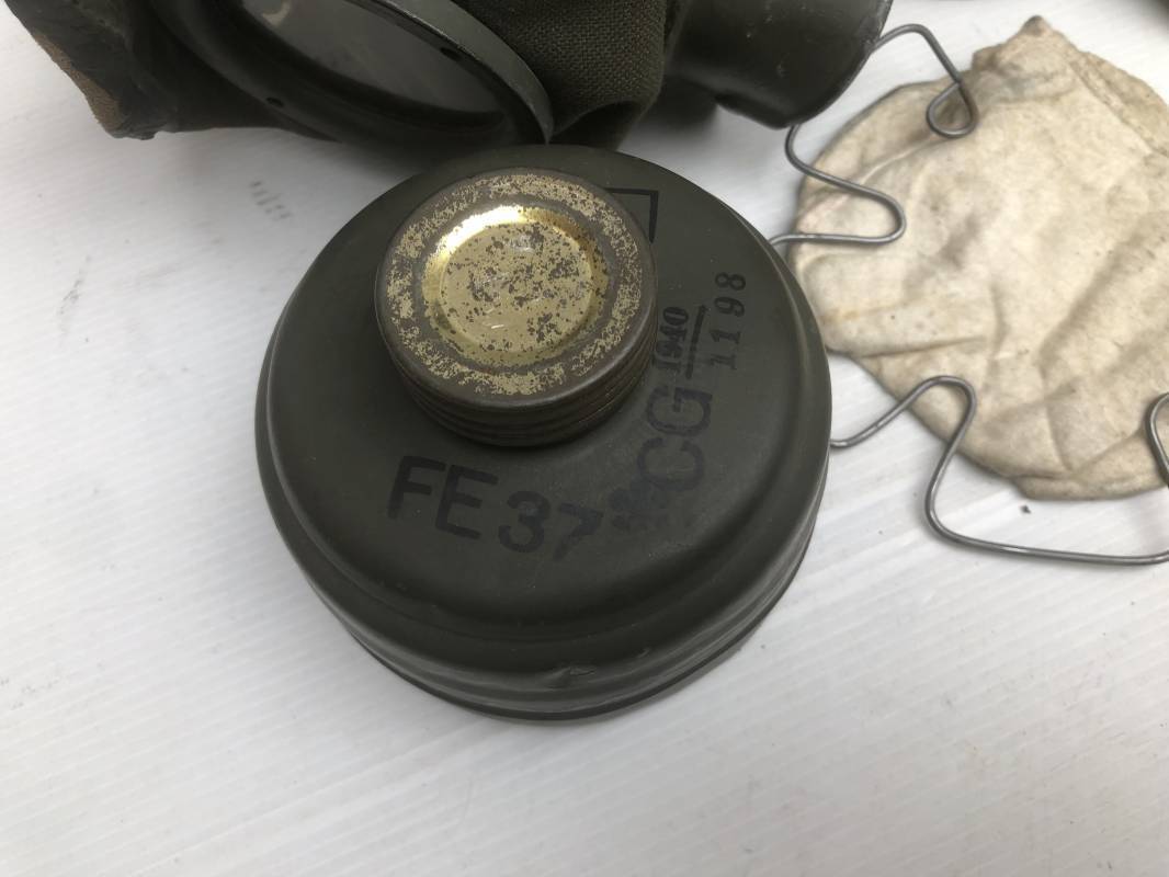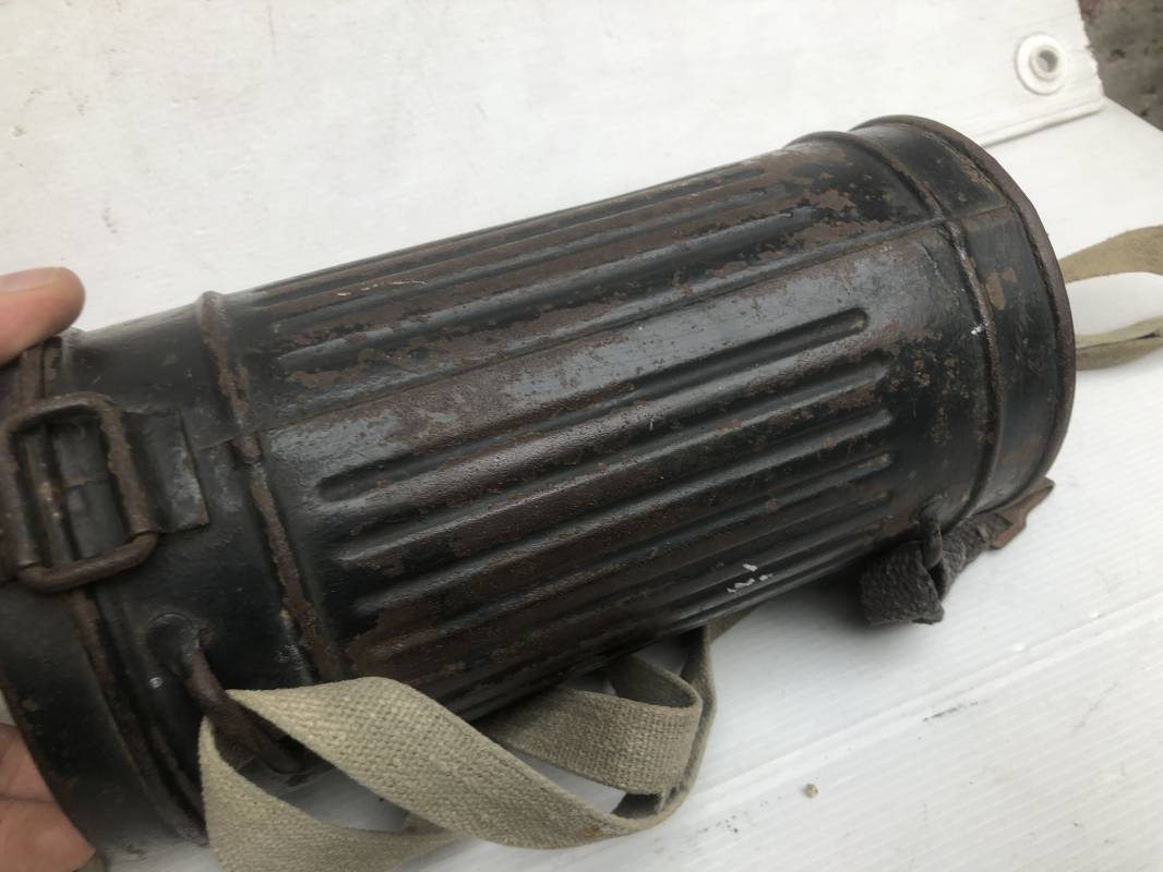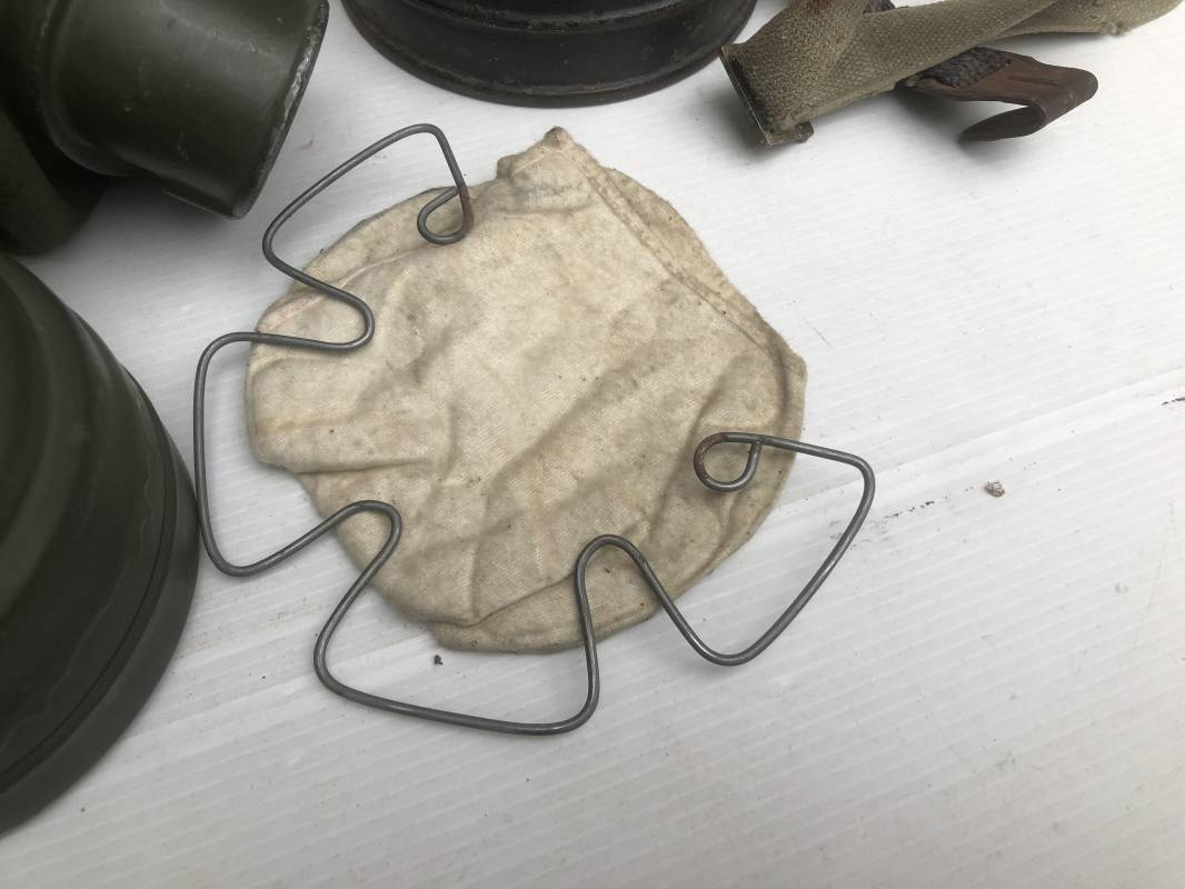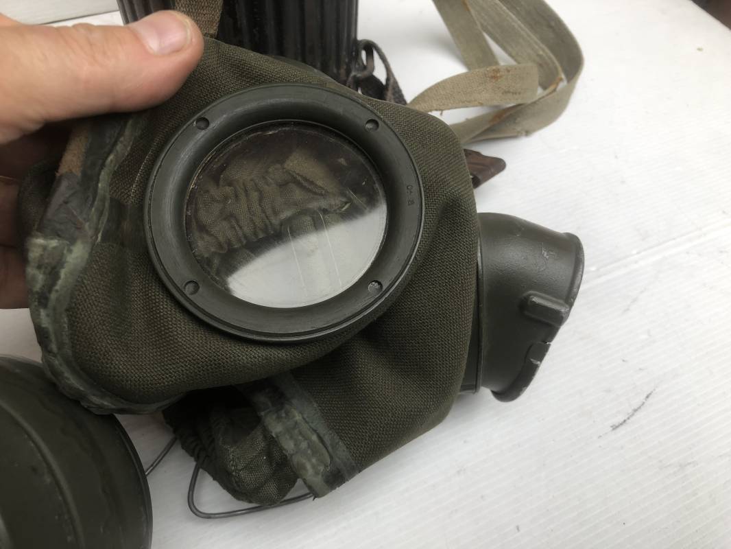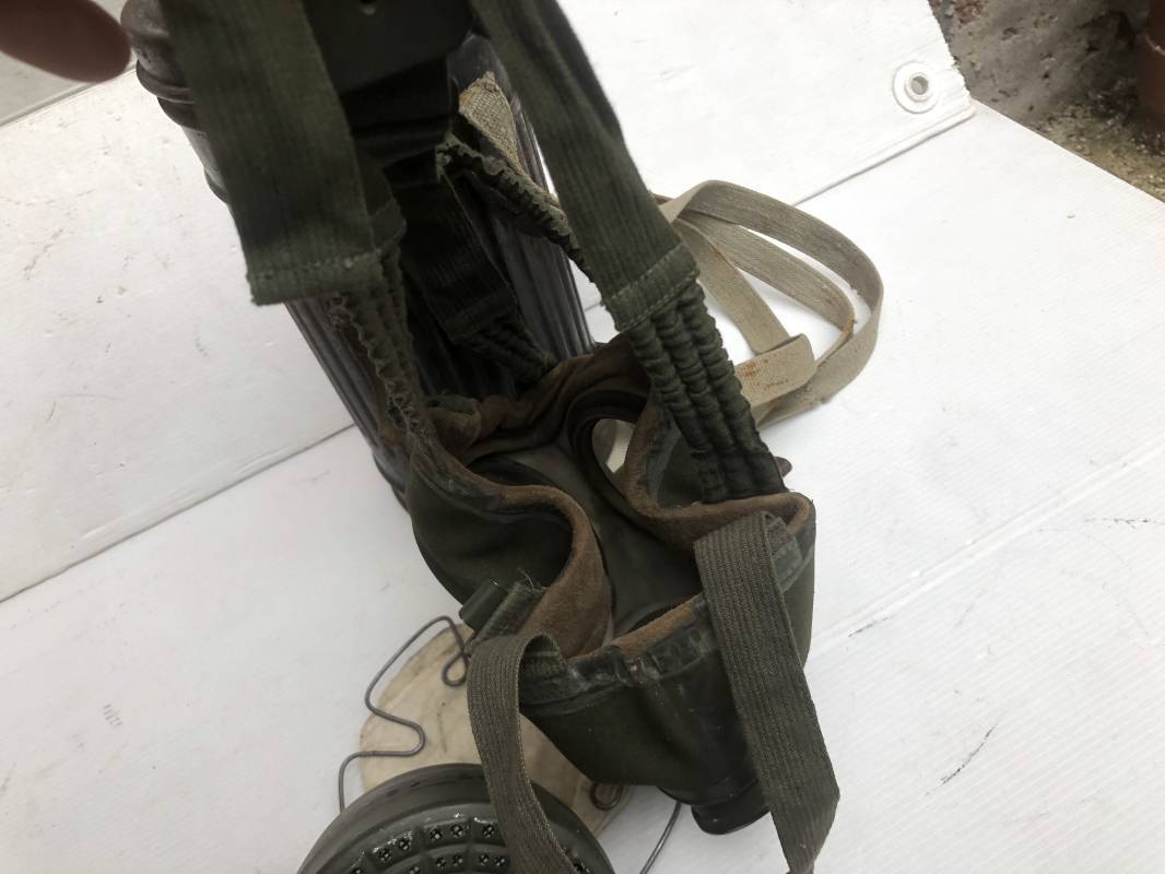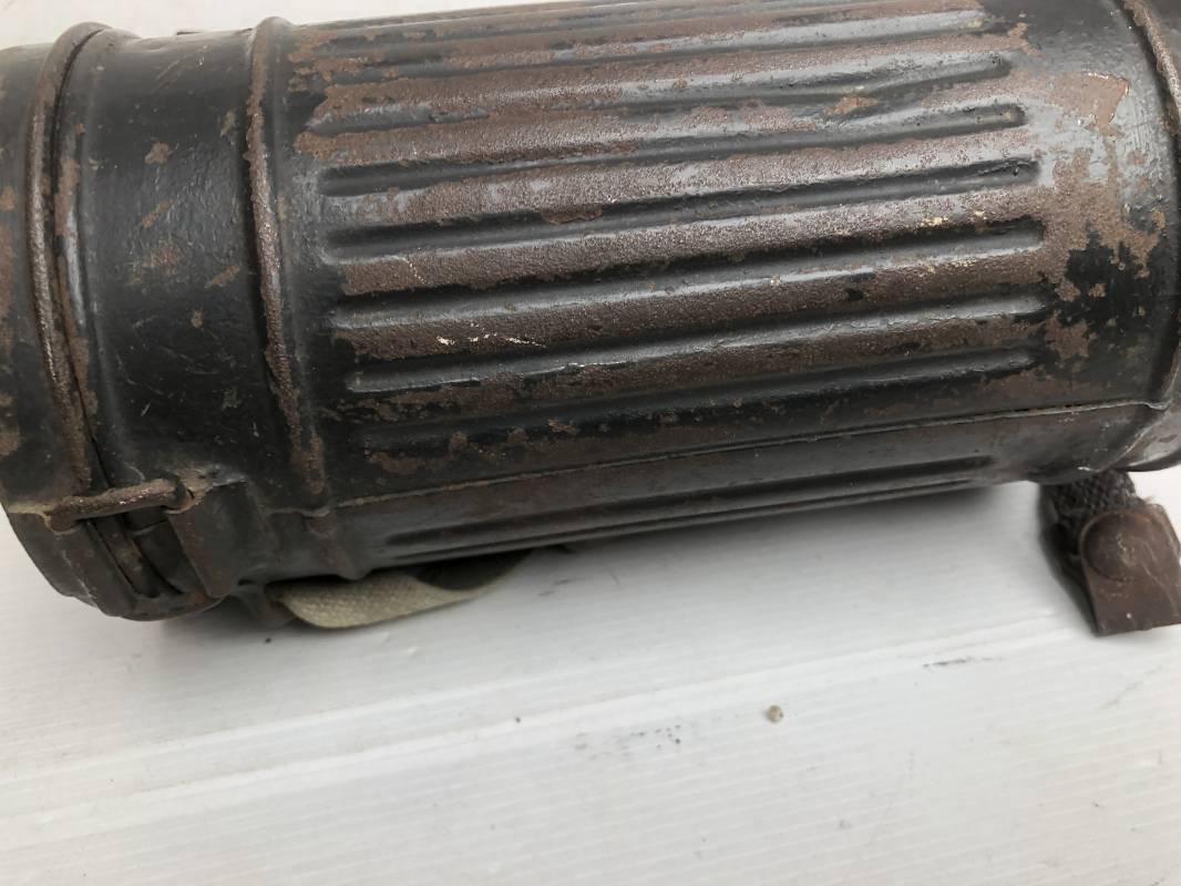 Rare masque de protection de la Luftwaffe modèle 1937 avec toutes ses sangles et accessoires. Boitier métallique 'court ' (25cm) avec peinture gris bleu d'origine.La peinture gris bleu est appliquée mains d'origine sur la peinture verte d'usinage . Marquage fabricant sur le couvercle et daté 1937 . Tampon encre WaA et aigle . Couvercle avec tirette toile et ressort métallique. Sangles longue et courte d'origines. La petite sangle est en toile gris bleu ! Verres de rechange. Chiffon et ressort métallique en fond de boitier. Masque de protection en toile verte daté 1940 . Occulaire et filtre FE 37 avec marquages encre noir daté 1940 , bouchon à visse . Bel ensemble porté en bel état.100% nature et intouché . Masque et boitier trouvé dans l'Eure ( 27 ) Rare modéle court de la LW Ref 17188