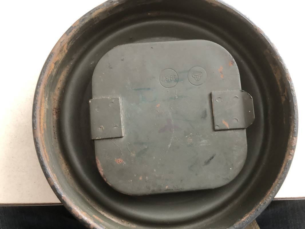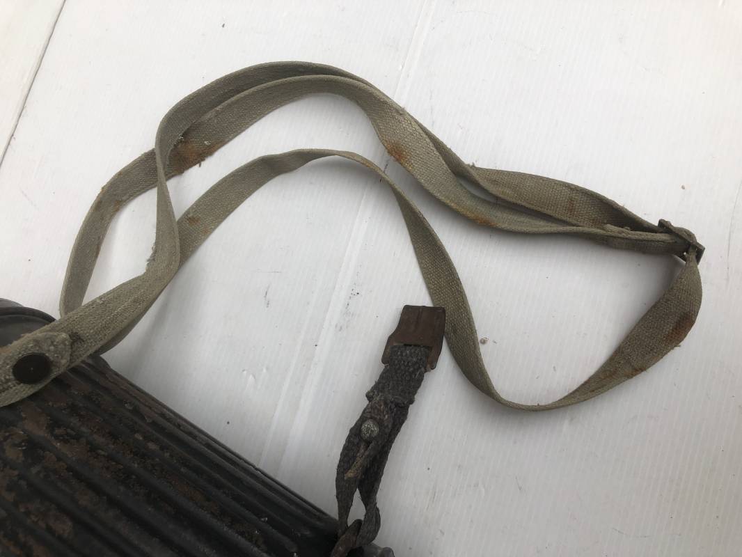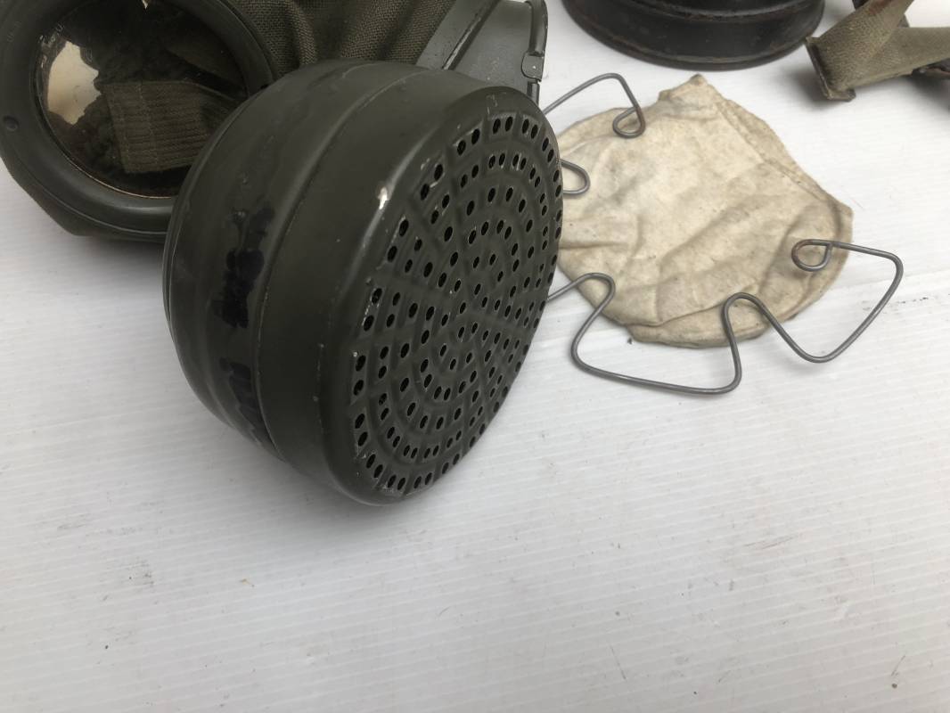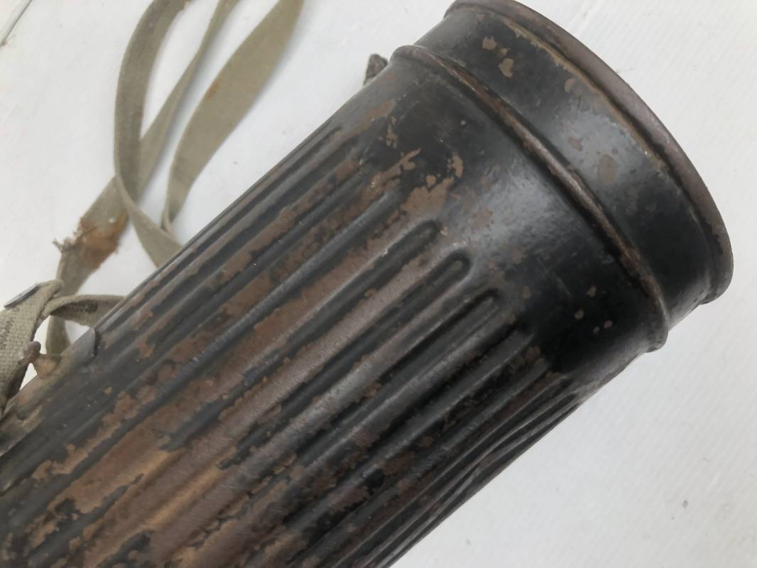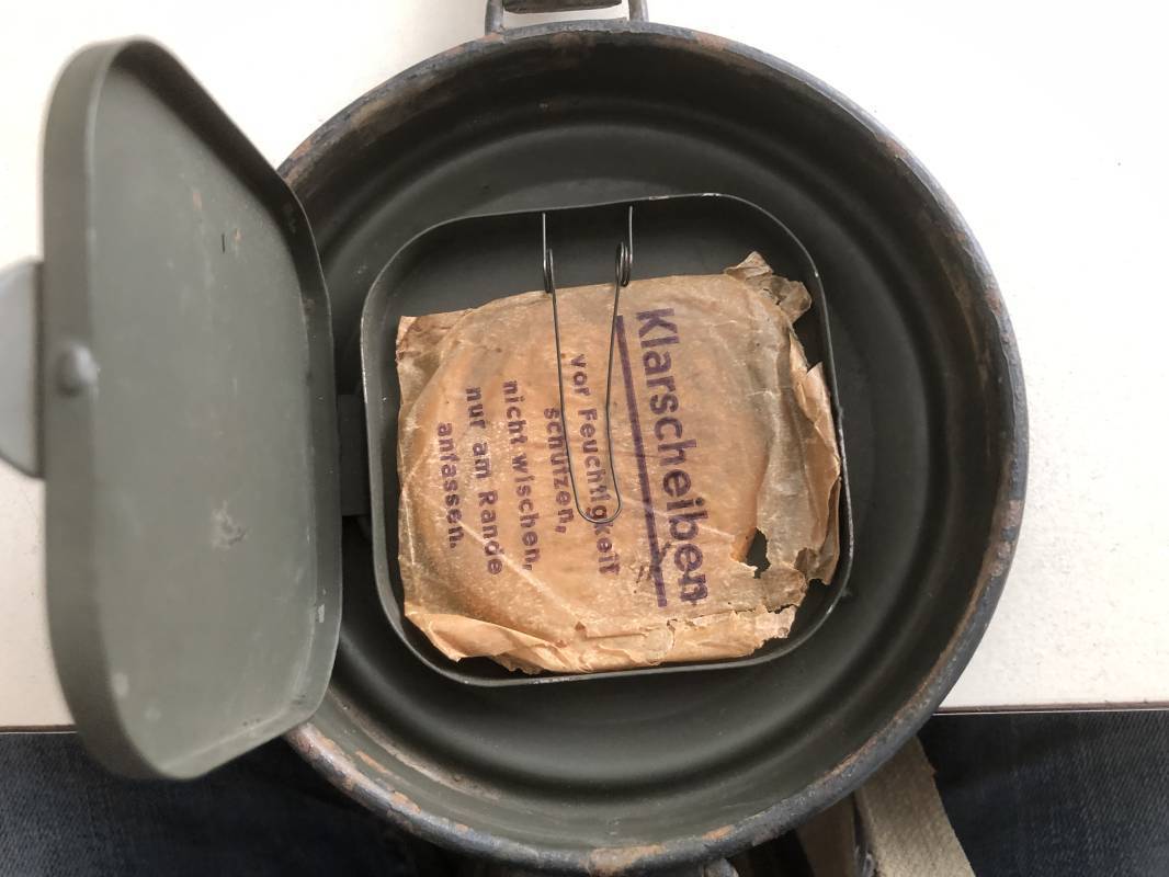 Rare masque de protection de la Luftwaffe modèle 1937 avec toutes ses sangles et accessoires. Boitier métallique 'court ' (25cm) avec peinture gris bleu d'origine.La peinture gris bleu est appliquée mains d'origine sur la peinture verte d'usinage . Marquage fabricant sur le couvercle et daté 1937 . Tampon encre WaA et aigle . Couvercle avec tirette toile et ressort métallique. Sangles longue et courte d'origines. La petite sangle est en toile gris bleu ! Verres de rechange. Chiffon et ressort métallique en fond de boitier. Masque de protection en toile verte daté 1940 . Occulaire et filtre FE 37 avec marquages encre noir daté 1940 , bouchon à visse . Bel ensemble porté en bel état.100% nature et intouché . Masque et boitier trouvé dans l'Eure ( 27 ) Rare modéle court de la LW Ref 17188