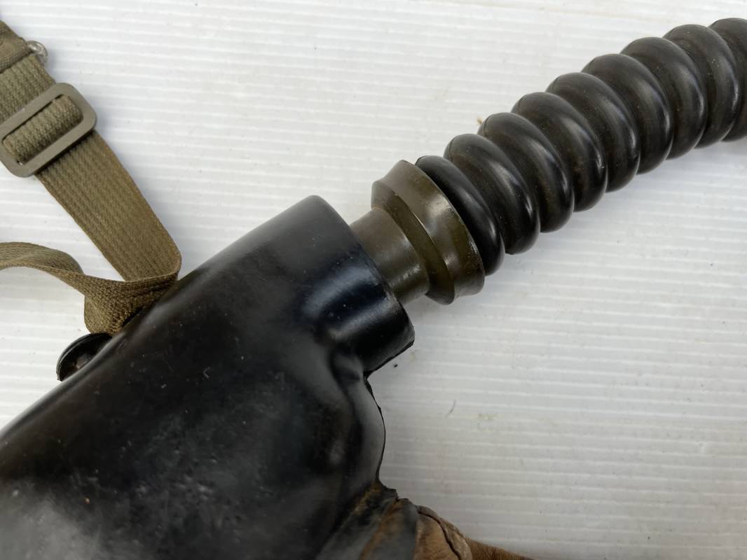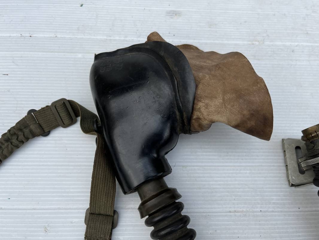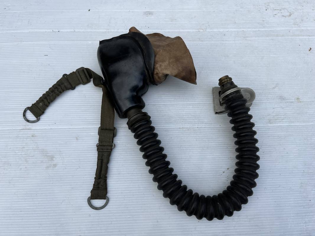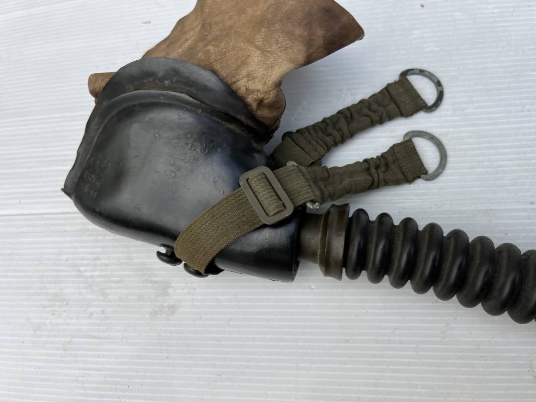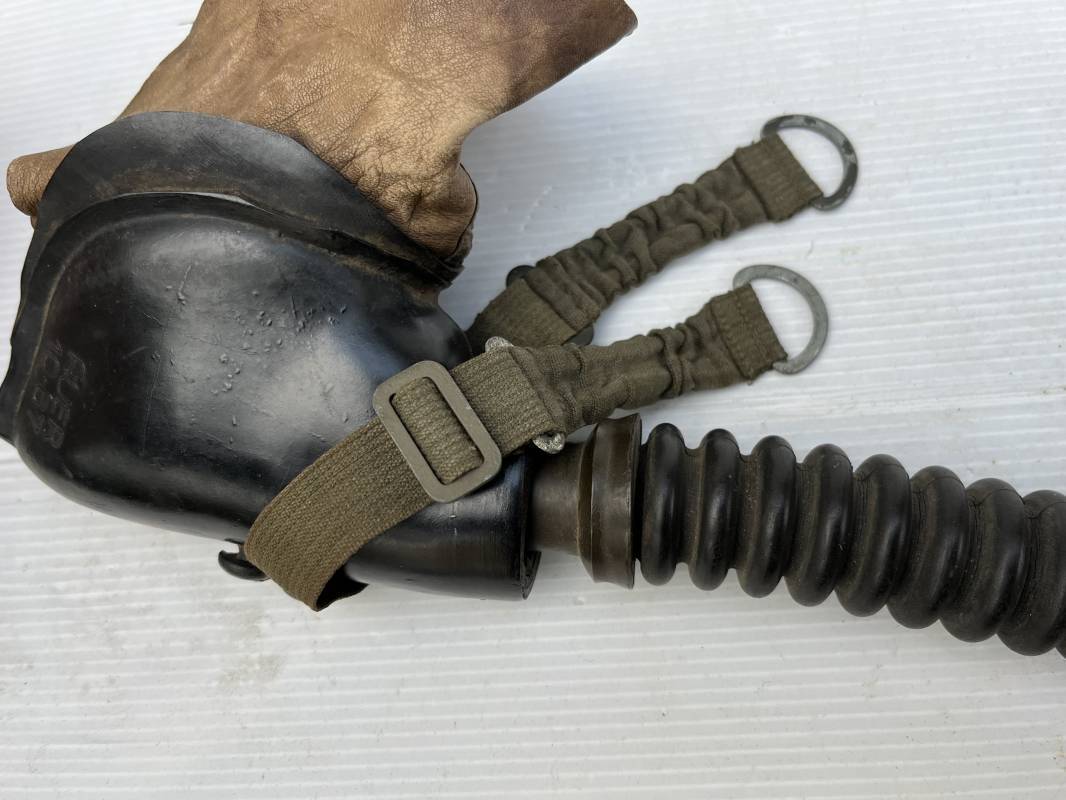 Trés rare masque oxygéne d'un navigant de la Luftwaffe .Masque 100 % nature et totalement intouché . Masque modéle 10-67 en caoutchouc noir . Caoutchouc souple . Pince crocodile en bout de tube . Sangles élastiques d'origines avec anneaux en zinc peints vert de fixation , ces sangles en coton et elastiques avec anneaux et boucles sont d 'origines . . Bavolets d 'origines en peau de chamois , les bavolets n ont pas ete découpés ni modifiés a l usage comme c 'est souvent le cas . . Marquage AUER 10-67 . Tuyau d origine en caoutchouc noir et souple . Ce masque est 100 % nature et totalement intouché . Trés Rare équipement de vol de la Luftwaffe 1940/45 Ref 21279