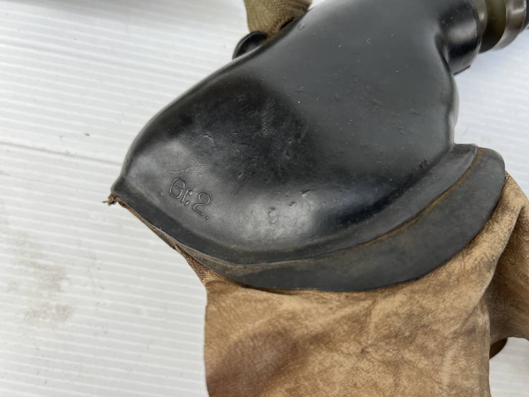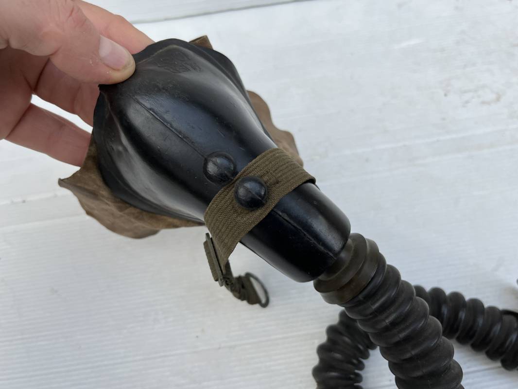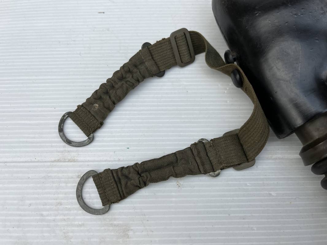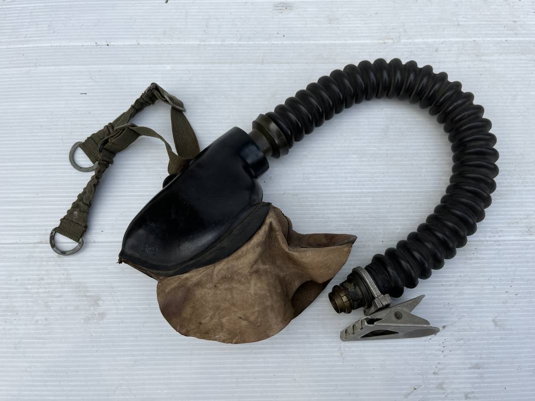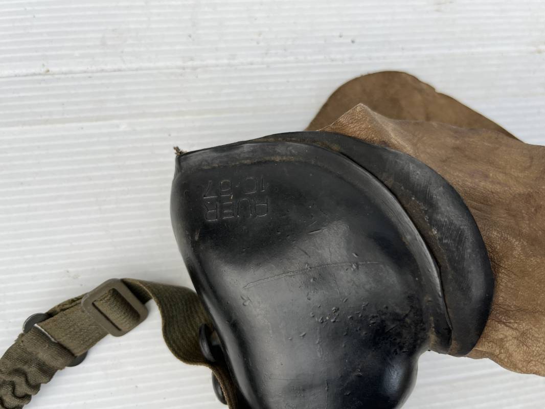 Trés rare masque oxygéne d'un navigant de la Luftwaffe .Masque 100 % nature et totalement intouché . Masque modéle 10-67 en caoutchouc noir . Caoutchouc souple . Pince crocodile en bout de tube . Sangles élastiques d'origines avec anneaux en zinc peints vert de fixation , ces sangles en coton et elastiques avec anneaux et boucles sont d 'origines . . Bavolets d 'origines en peau de chamois , les bavolets n ont pas ete découpés ni modifiés a l usage comme c 'est souvent le cas . . Marquage AUER 10-67 . Tuyau d origine en caoutchouc noir et souple . Ce masque est 100 % nature et totalement intouché . Trés Rare équipement de vol de la Luftwaffe 1940/45 Ref 21279