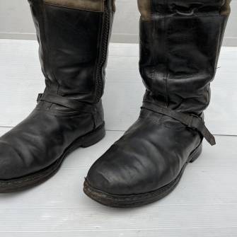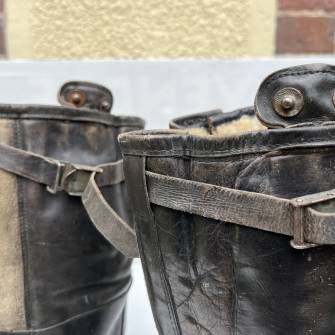 Belle paire de bottes de vol d'un navigant de la Luftwaffe .Bottes en cuir glacé noir et cuir retourné gris clair , fourrées en mouton blanc .Modèle chauffant avec deux prises males sur les hauts de chaque tiges . Lanières de serrage hautes et basses en cuir et boucles métalliques . Glissières d'origines et fonctionnelles fen plastique noir fabricant ' RiRi' . Etiquette en coton avec marquage code fabricant RBNR daté 44 . Semelles et talon caoutchouc d'origines Longueur semelle 29 cm taille 43 . Hauteur bottes 41 cm . Cuir souple . Paire portée en bel état . Belle paire de bottes chauffantes 1943/45 Ref 19736