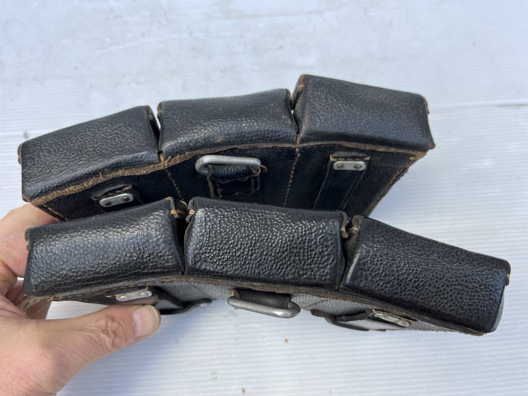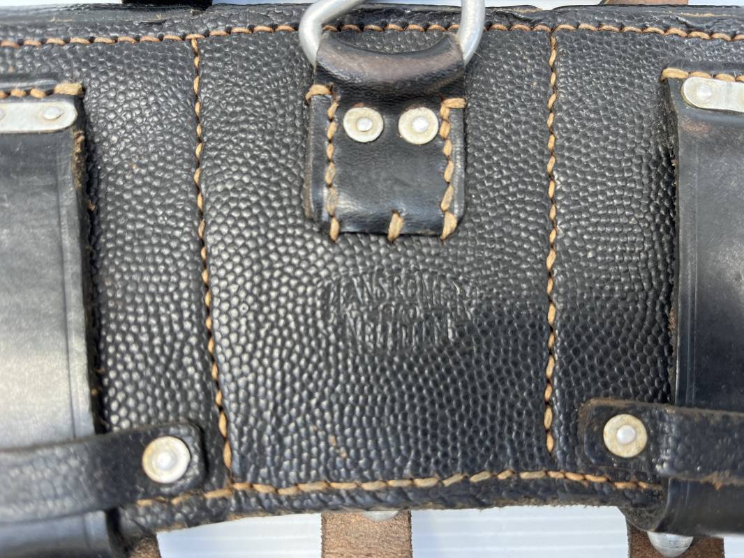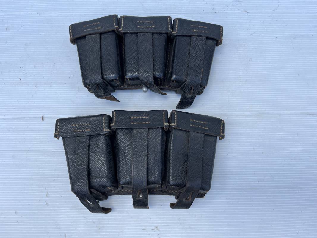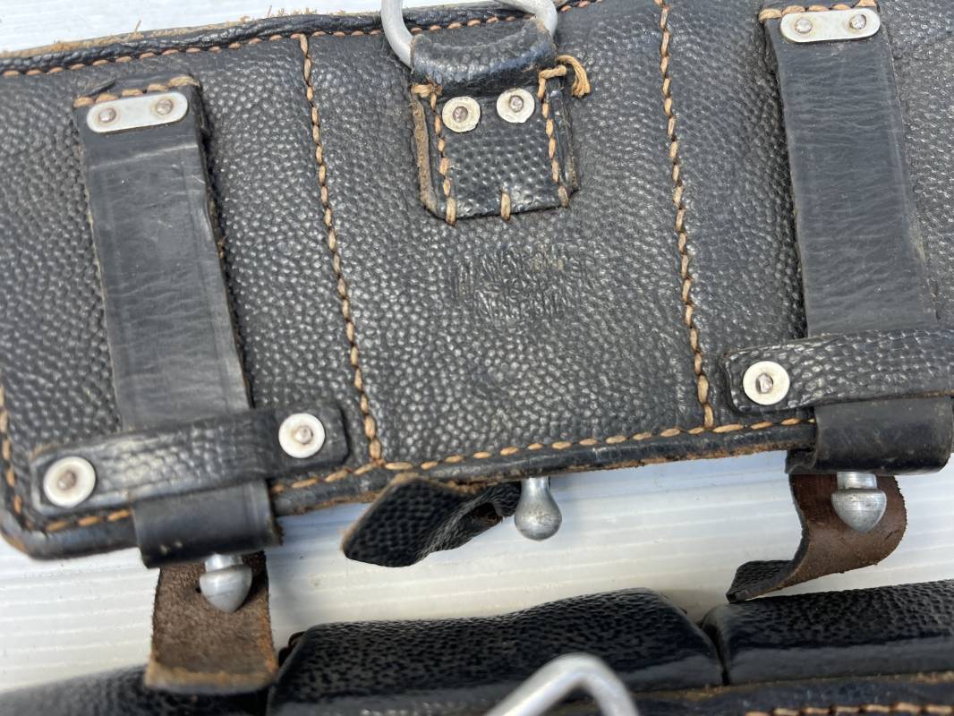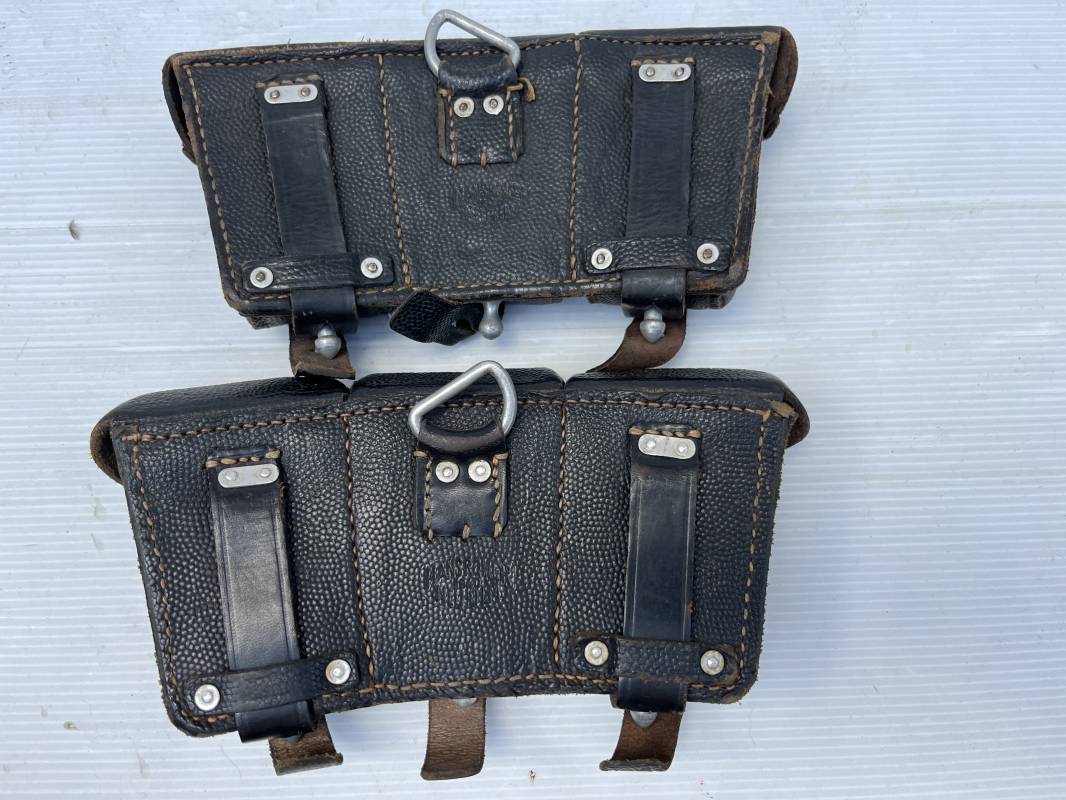 Tres belle paire de cartouchières 98 K en cuir grenelé noir . Cartochières homogéne et du meme fabricant . Marquages au dos Hans Romer 1940 . Rivets et passants en alu . Réceptionnée bureau habillement de la LW LBA 1940 . Légérement portées en parfait état .Séparations internes manquantes sur une desdeux cartouchières Ref 21264