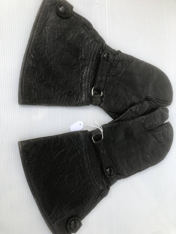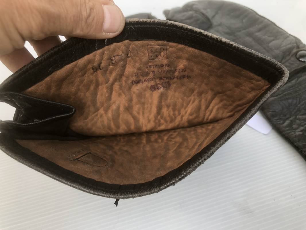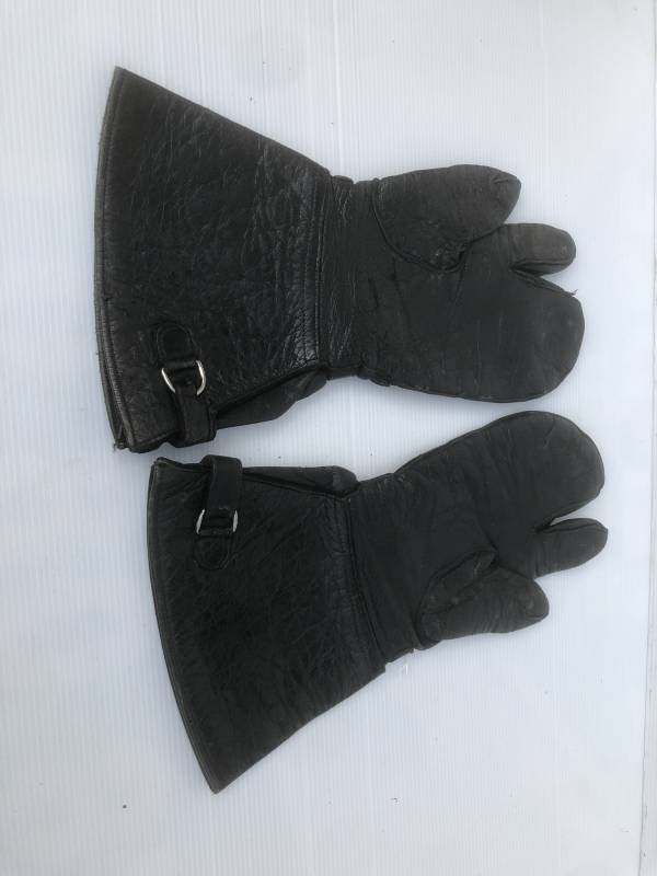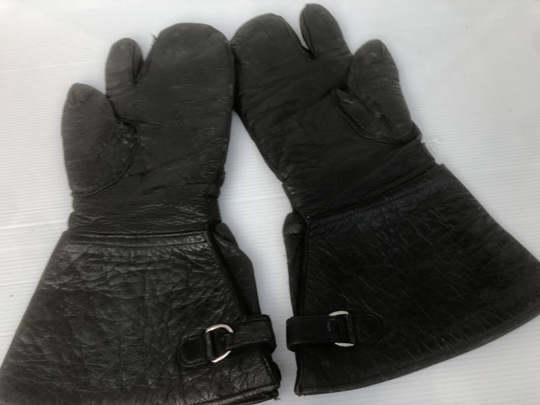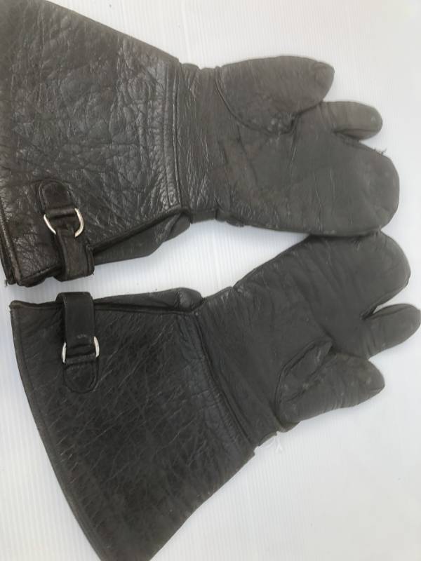 Belle paire de gants de vol d'un navigant de la Luftwaffe . Paire de gants à crispins en cuir noir . Lanières en cuir et boucles avec pressions . Intérieurs des mains doublé en laine blanche . Marquage fabricant receptionné LBA daté 1939 Taille 9 1/2 . Cuir souple , legerement porté en parfait état Ref 19404