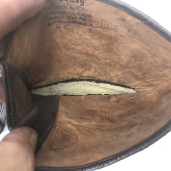 Belle paire d egants de vol d'un navigant de la Luftwaffe . Paire d egants a crispins en cuir marron foncé . Lanières en cuir et boucles avec pressions . Intérieurs des mains doublé en mouton blanc . Marquage fabricant Gerlach à Berlin daté 1938 Taille 81/2 . Cuir souple , legerement porté en parfait état Ref 19306