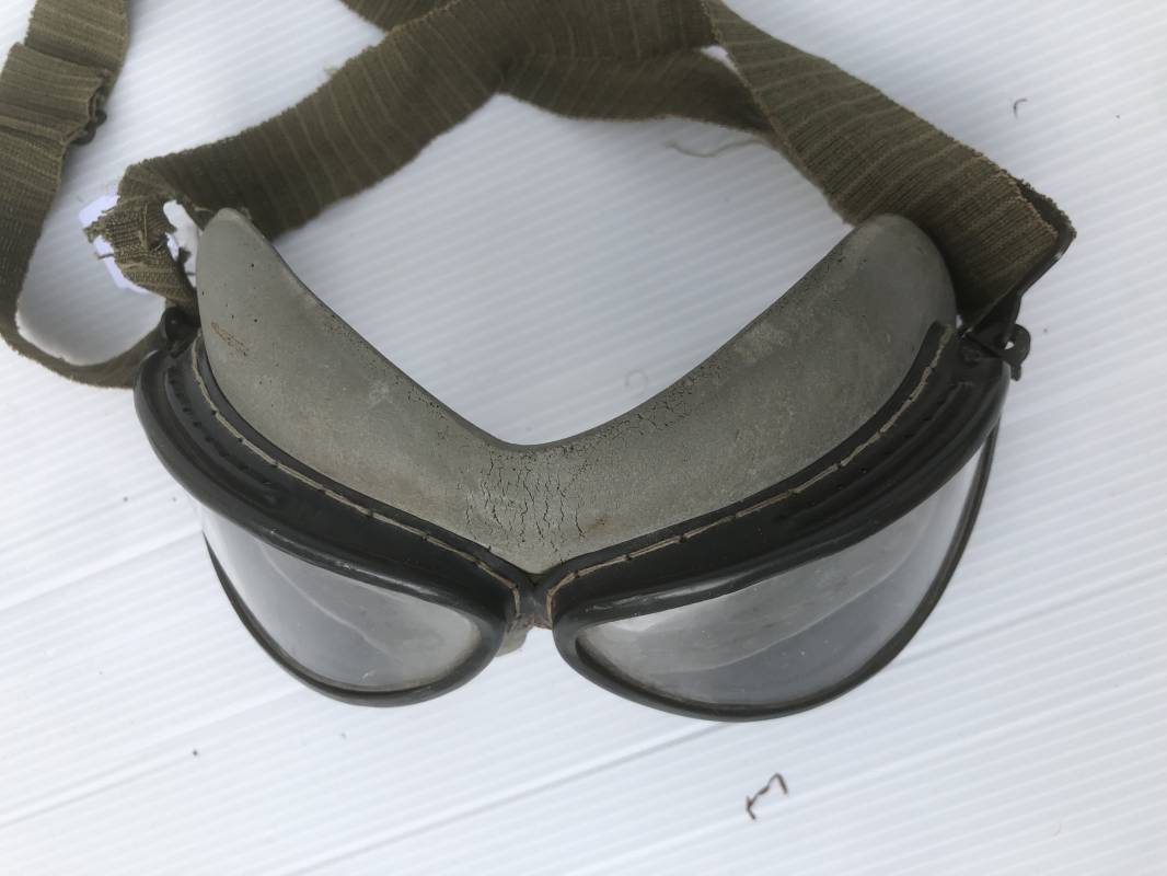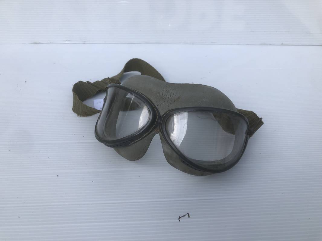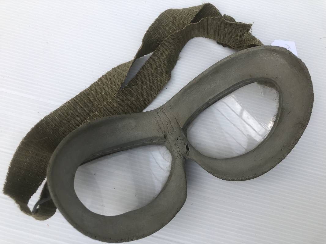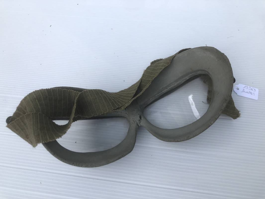 Très belle paire de lunettes de vol d'un Navigant de la Luftwaffe. Lunettes de col (Windschutzbrille 295). Verres blancs. Monture en alu peinte en vert. Pourtour en caoutchouc mono bloc beige . Caoutchouc souple. Crochets métalliques de fixation. Sangle en toile et boucle métallique de réglage. Légèrement porté en bon état 1935/45. Ref 19363