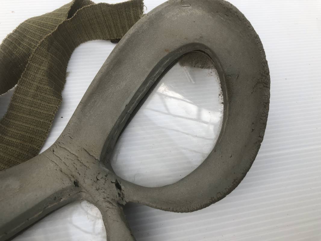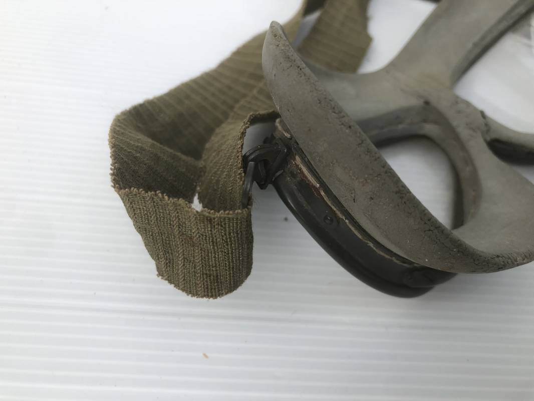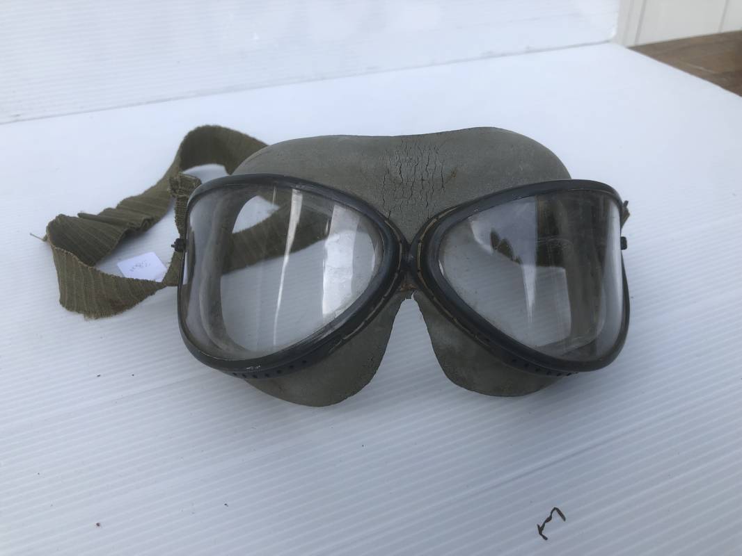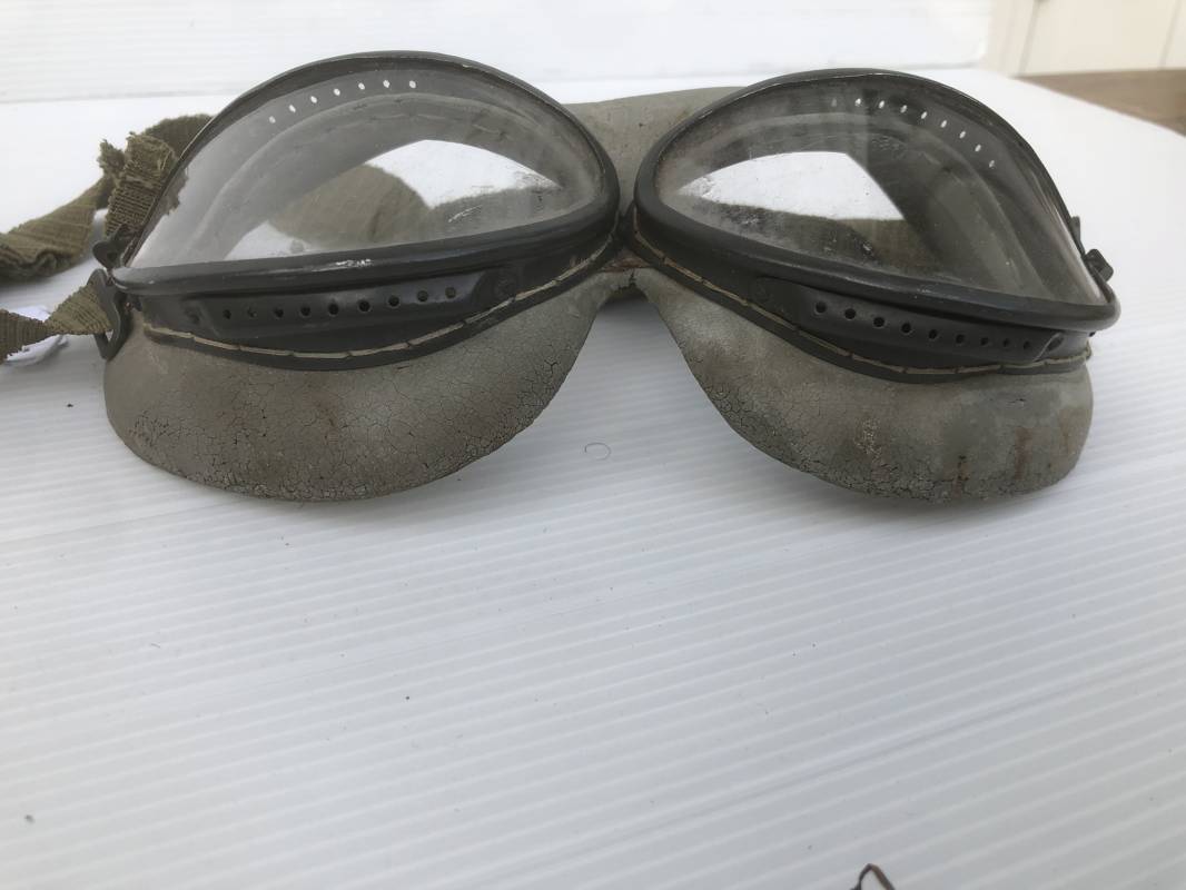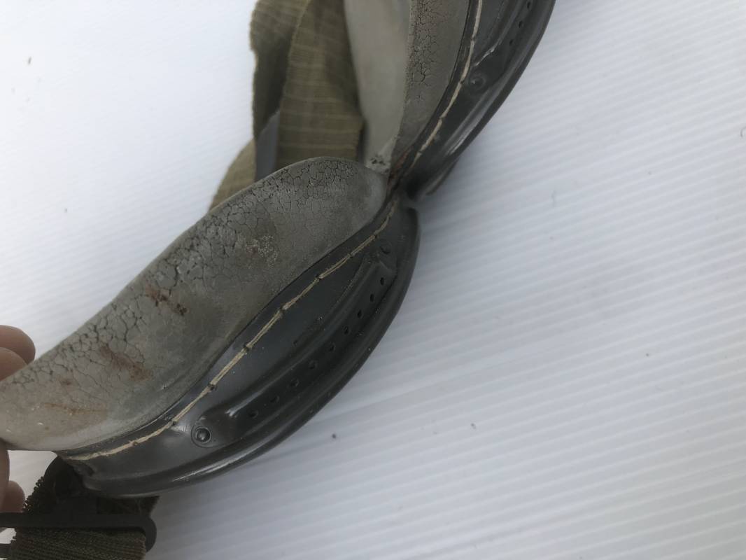 Très belle paire de lunettes de vol d'un Navigant de la Luftwaffe. Lunettes de col (Windschutzbrille 295). Verres blancs. Monture en alu peinte en vert. Pourtour en caoutchouc mono bloc beige . Caoutchouc souple. Crochets métalliques de fixation. Sangle en toile et boucle métallique de réglage. Légèrement porté en bon état 1935/45. Ref 19363