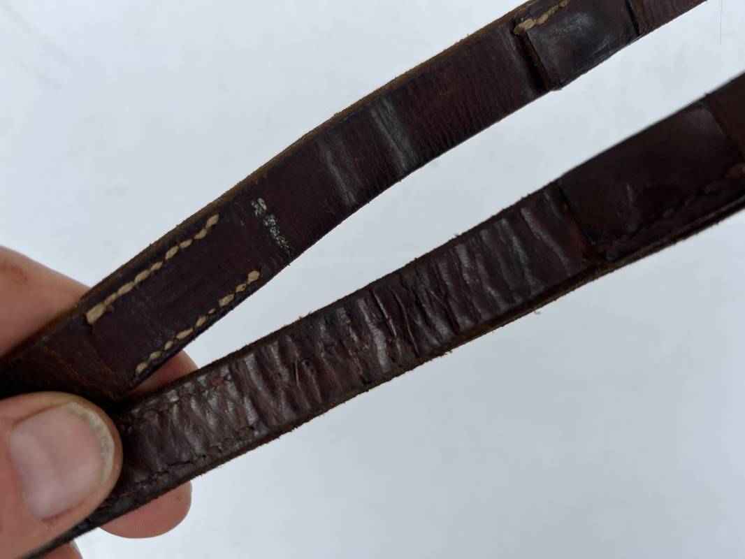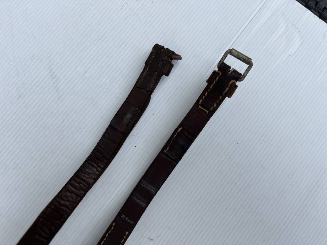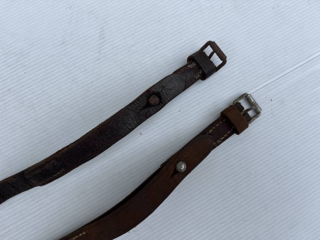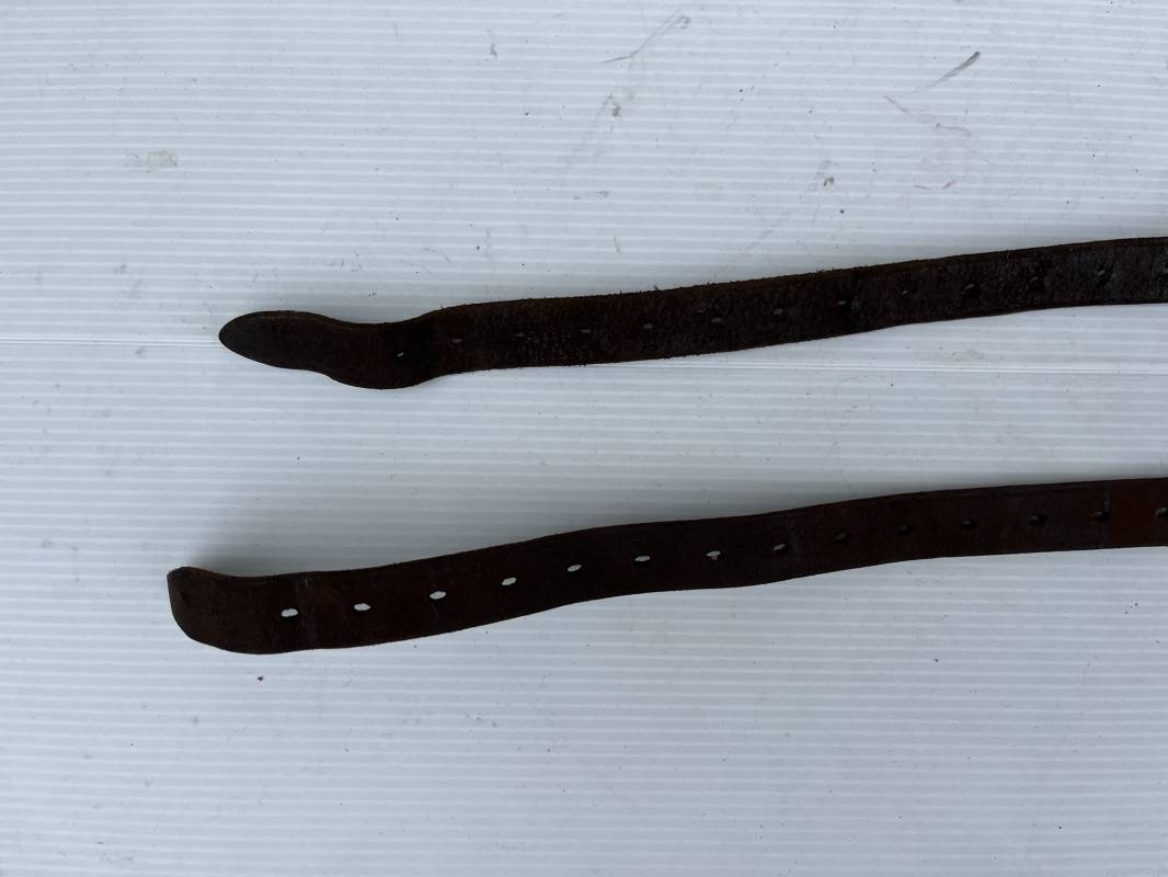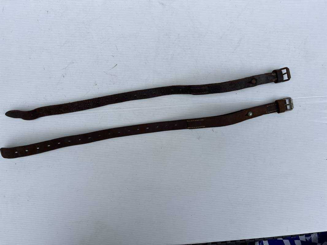 Belle paire de sangles réglementaires à paquetage de la Luftwaffe . Sangles en cuir retourné marron foncé . Boucles a un ardillon . Marquages fabricant daté 1939 . Marquage affectation Flak Rgt 7 / 3 bttr LBA , cuir souple, longueur 55cm. Porté en bon état . Paire trouvée en brocante en Normandie Ref 19795