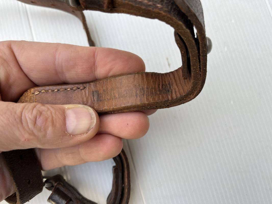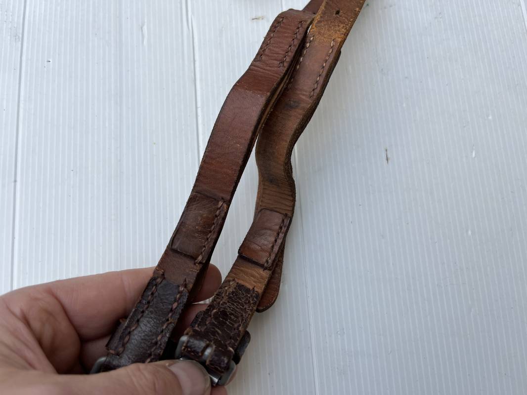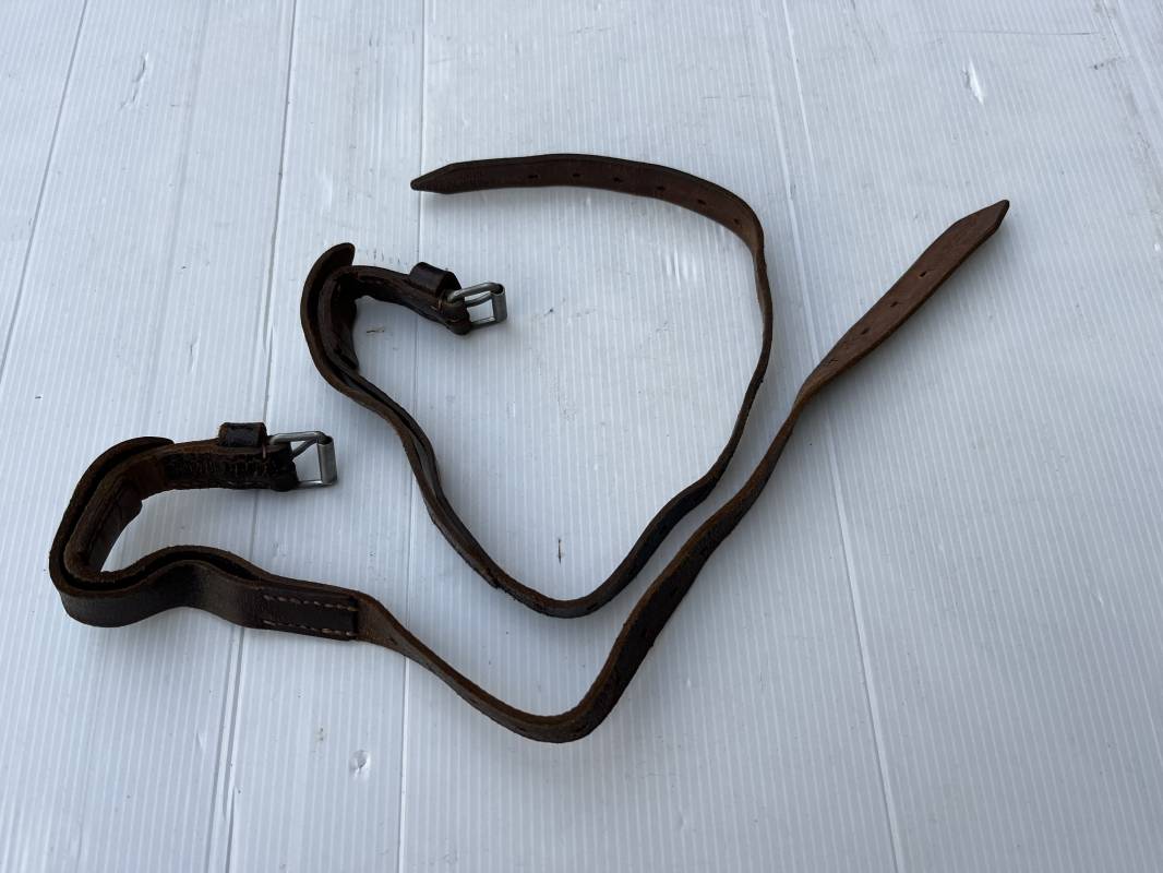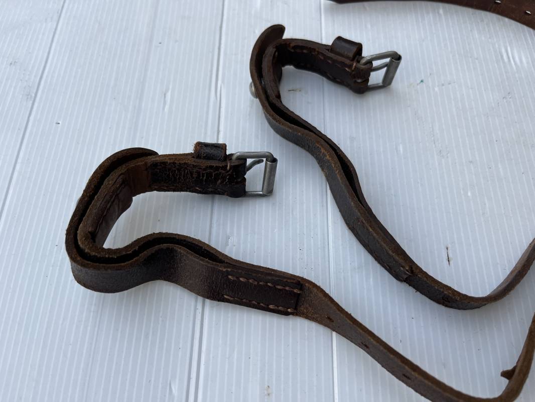 Rare paire de sangles à paquetage ( gamelle , tente , capote .. ) de la Luftwaffe en cuir marron foncé . Paire homogéne du meme fabricant 4Conrad Scherz 19374 receptionné LBA . Boucles et tétonS en alu . Petites pattes en cuir pour d2grafage rapide . Cuir soupe longueur 52 cm parfait état . Peu courant en vrai paire ! 21603