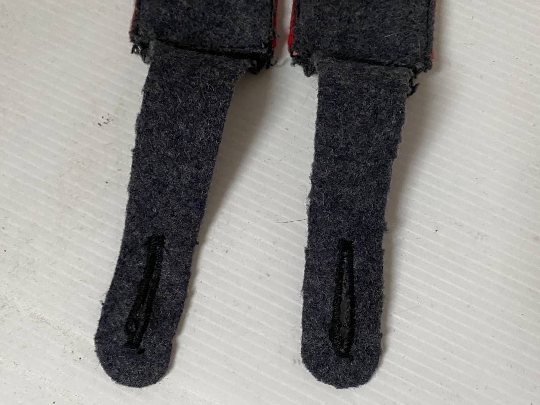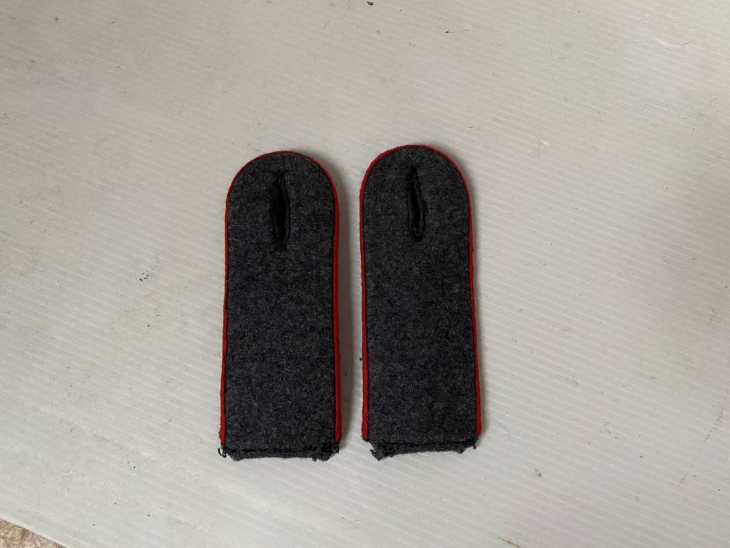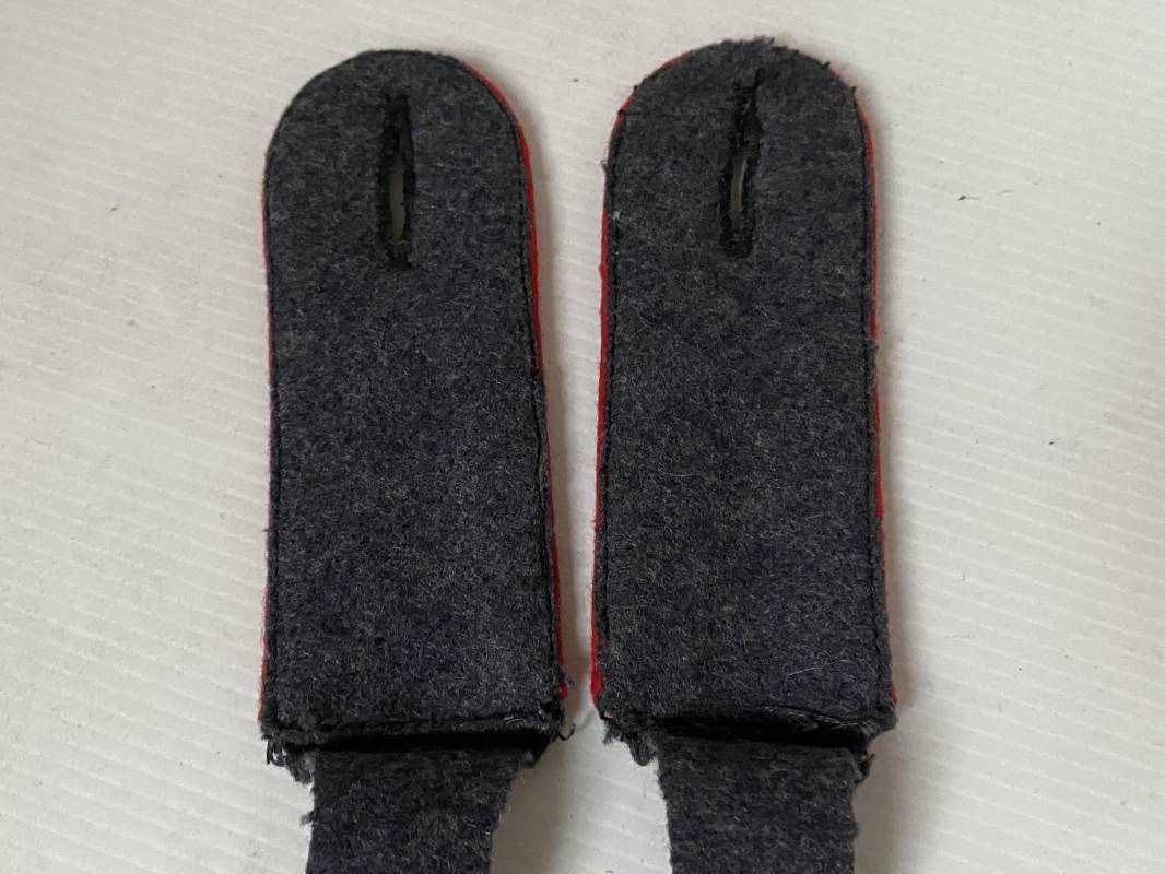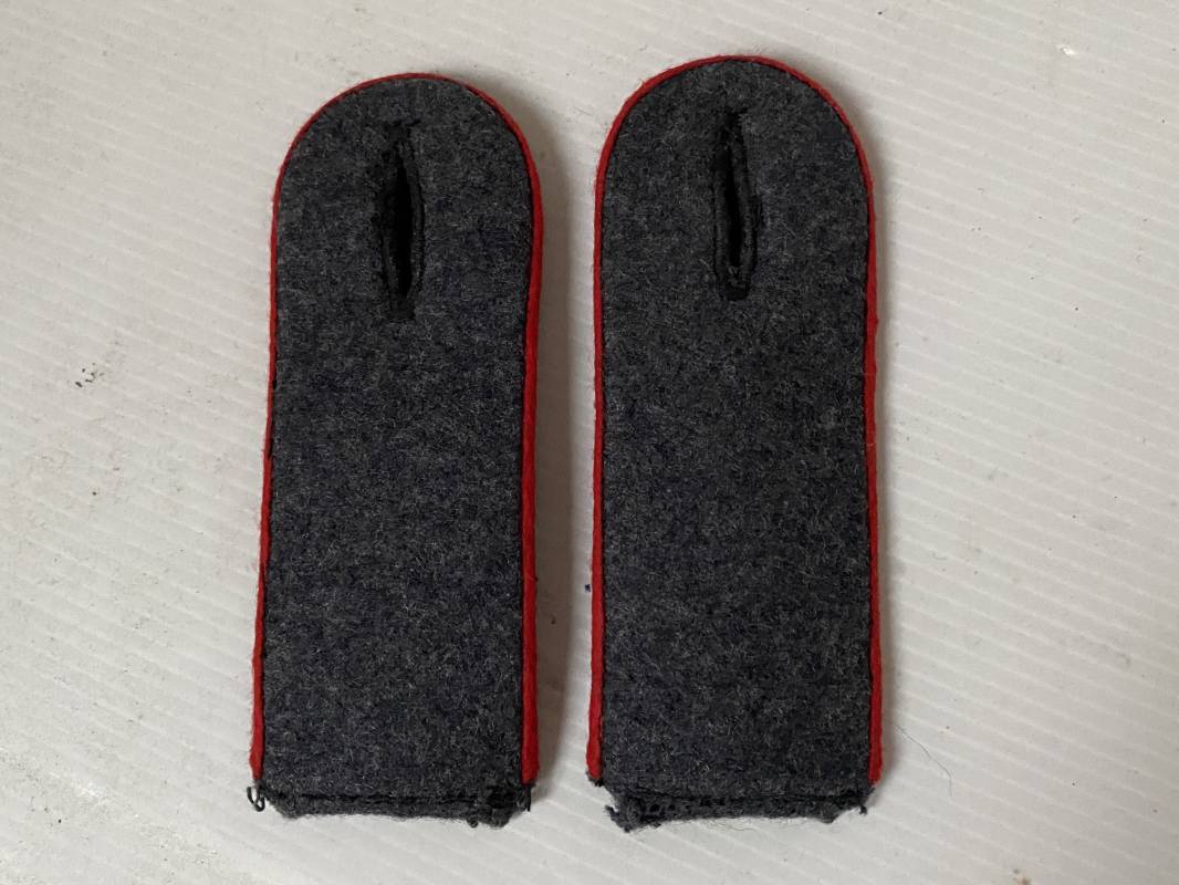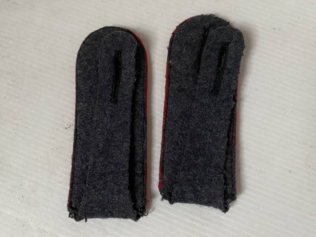 Paire de pattes d'épaules d'un soldat de la Luftwaffe, liseré rouge de l'Artillerie. Liseré en laine, drap gris/bleu. Boutonnière, modèle à rabat. Longueur 115mm. Pattes d'épaules de confection précoce 1935/38 avec rajout d'un rabat en drap d'origine 1939/40. Ref 15697