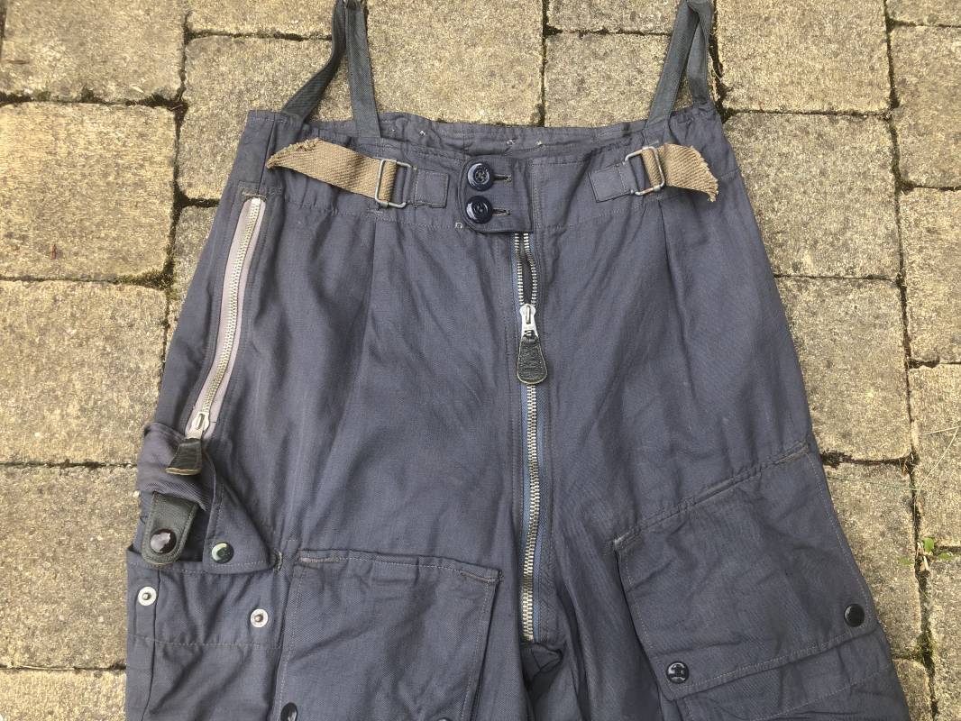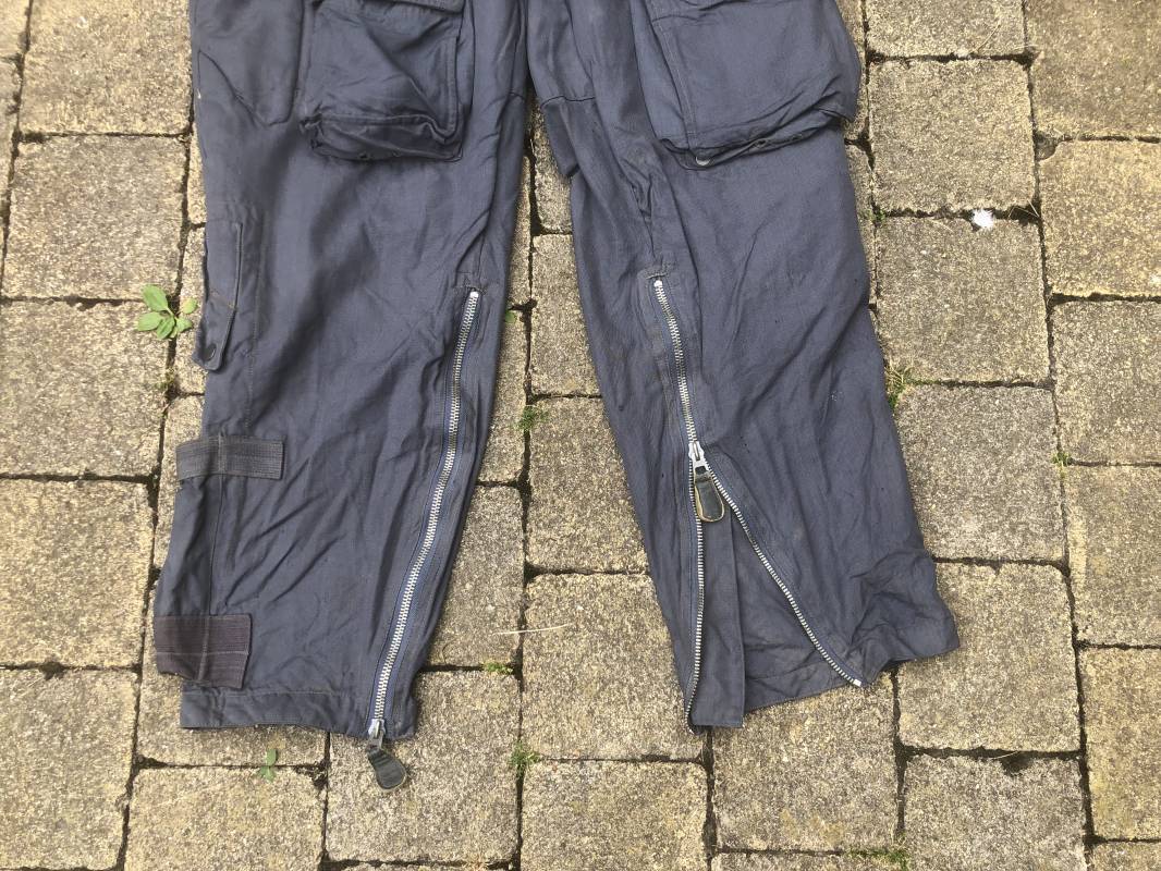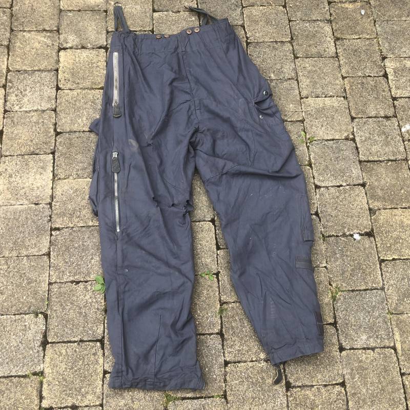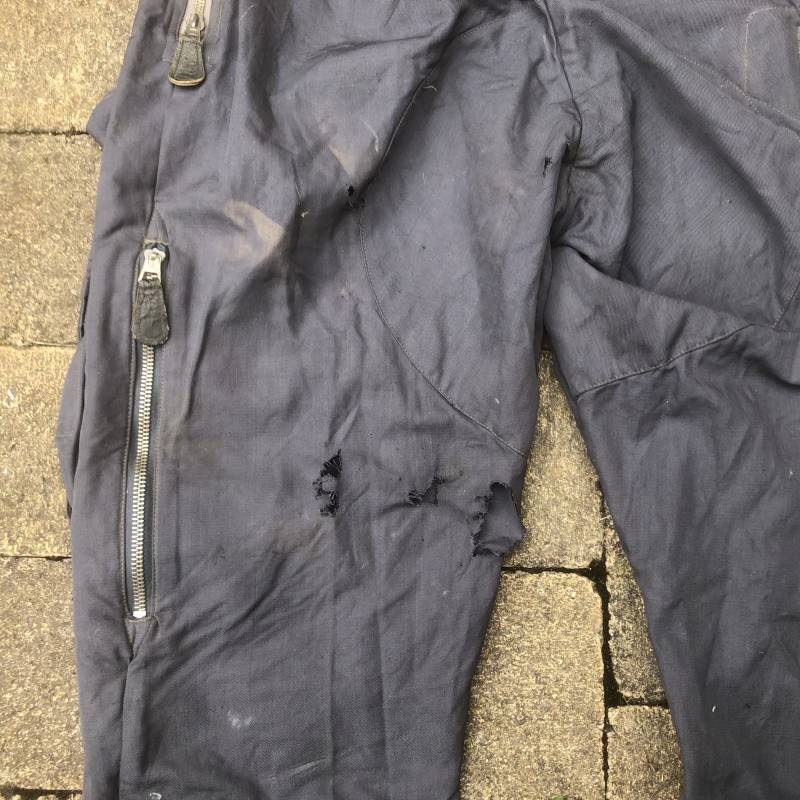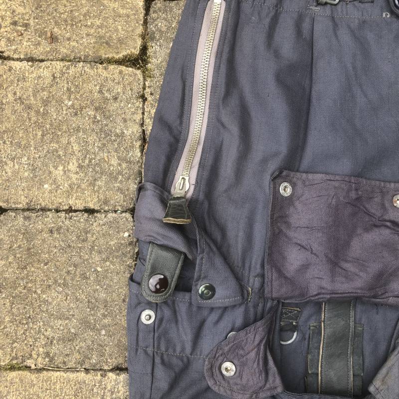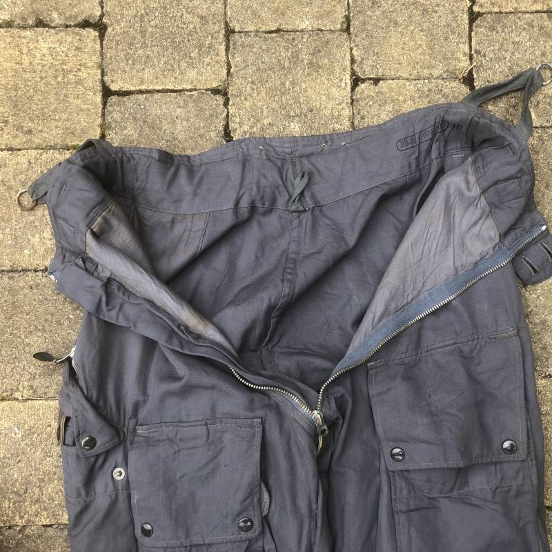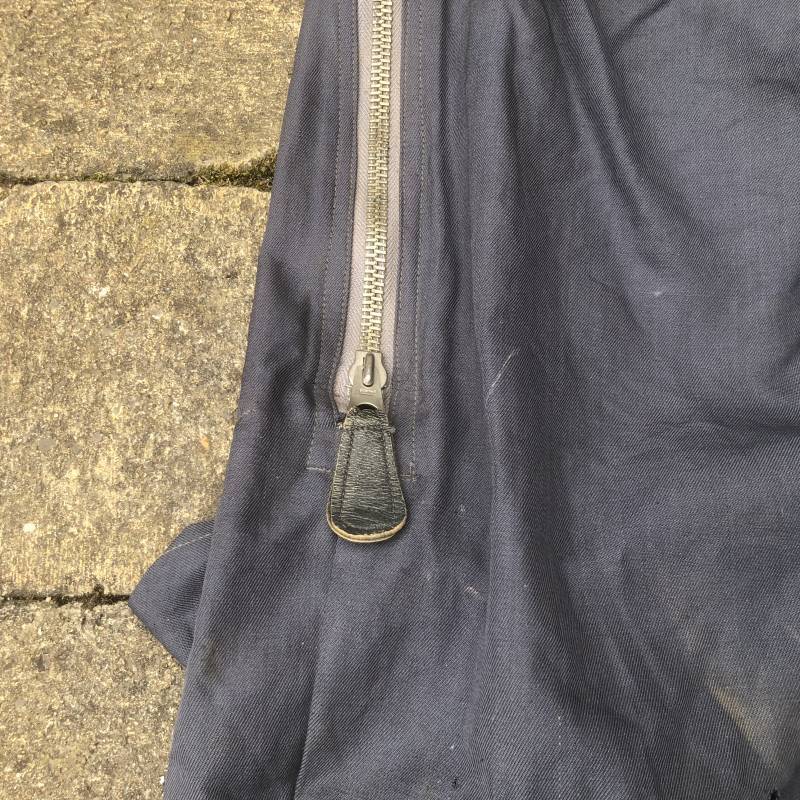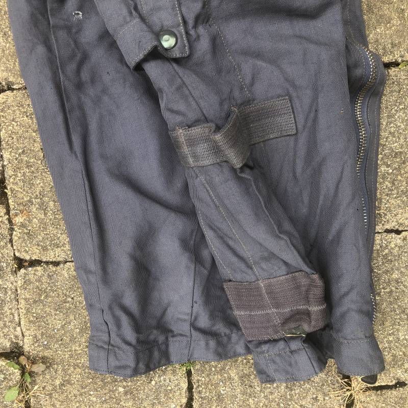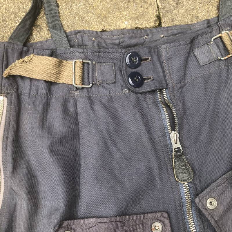 Rare Pantalon de vol d'un navigant de la Luftwaffe ( Kanal Hose ) . Pantalon réglementaire en toile de coton bleu avec de nombreuses poches pour les équipements de survie . Pantalon du 'modéle léger' non électrifié et non fourré . Poches avec rabats à bouton 'Prym' , poche à pistolet lde détresse sur le coté , poche a couteau gravité . Bas des jambes a glissières . Toutes les glissières sont fonctionnelles et d'origines . Deux boutons en plastique sur le devant et deux pattes de serrage en toile pour la taille . Intérieur sans doublure du modele leger . Marquage code fabricant Rbnr Taille 1 b Taille 41 longueur 108 cm . Pantalon de vol légérement porté en trés bel état . Coton de couleur bleu non délavé . A noté trous sur le derrière ( voir photos ) Ce panatalon n'a jamais été restauré .Rare piéce d'uniforme d'un pilote de la Luftwaffe 1940/45 Ref 19333