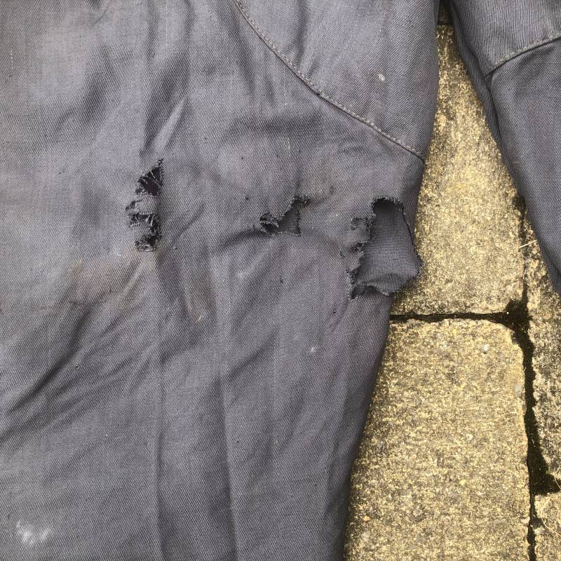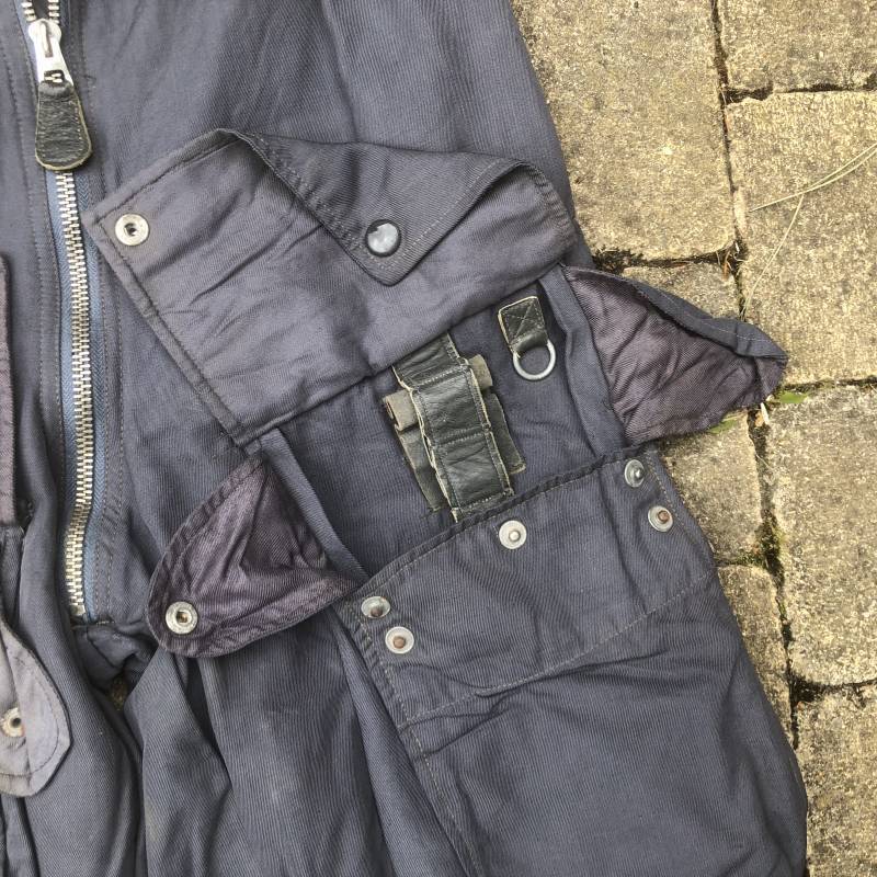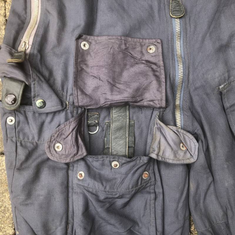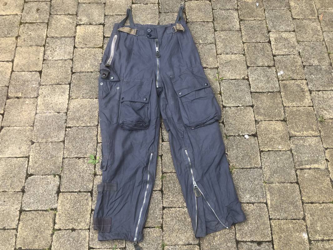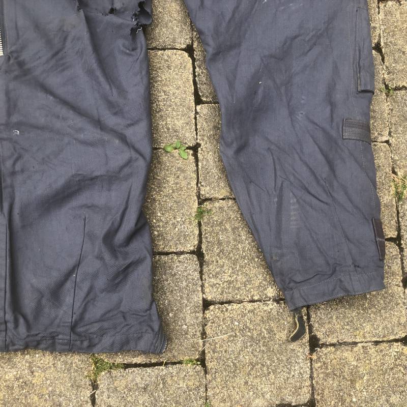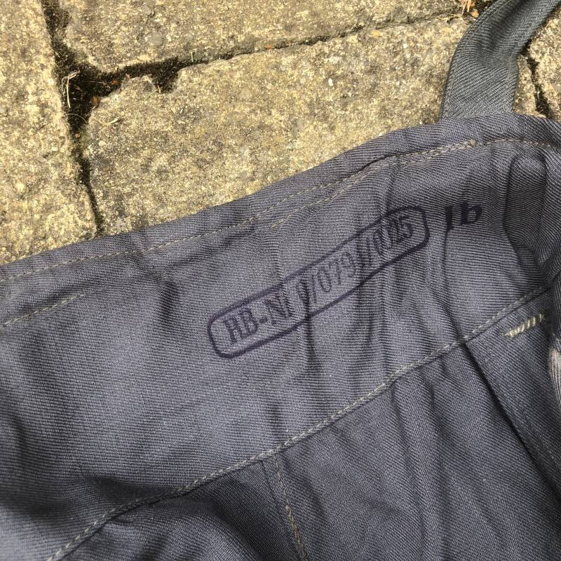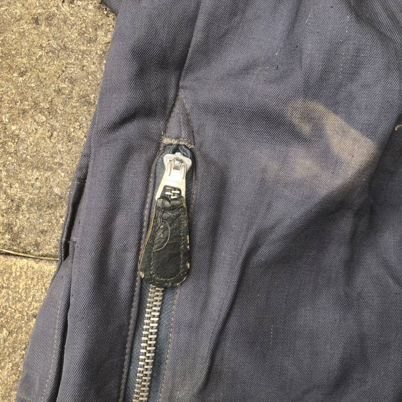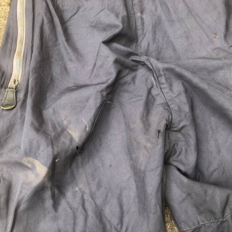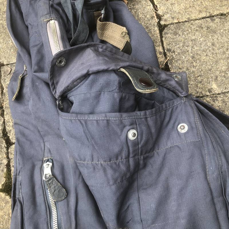 Rare Pantalon de vol d'un navigant de la Luftwaffe ( Kanal Hose ) . Pantalon réglementaire en toile de coton bleu avec de nombreuses poches pour les équipements de survie . Pantalon du 'modéle léger' non électrifié et non fourré . Poches avec rabats à bouton 'Prym' , poche à pistolet lde détresse sur le coté , poche a couteau gravité . Bas des jambes a glissières . Toutes les glissières sont fonctionnelles et d'origines . Deux boutons en plastique sur le devant et deux pattes de serrage en toile pour la taille . Intérieur sans doublure du modele leger . Marquage code fabricant Rbnr Taille 1 b Taille 41 longueur 108 cm . Pantalon de vol légérement porté en trés bel état . Coton de couleur bleu non délavé . A noté trous sur le derrière ( voir photos ) Ce panatalon n'a jamais été restauré .Rare piéce d'uniforme d'un pilote de la Luftwaffe 1940/45 Ref 19333