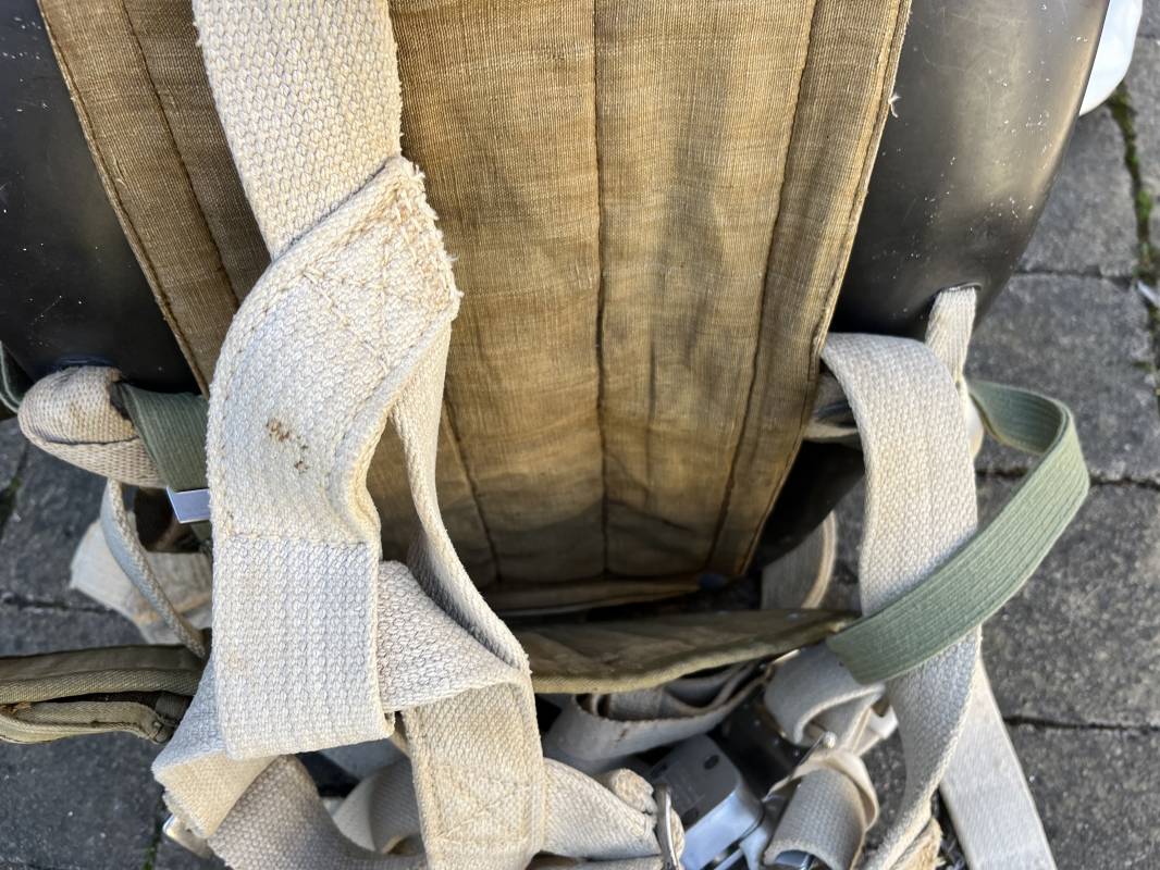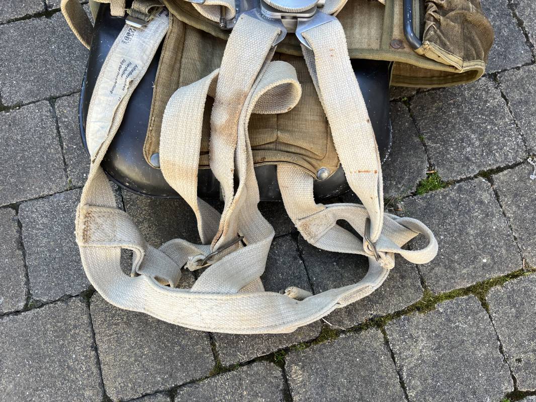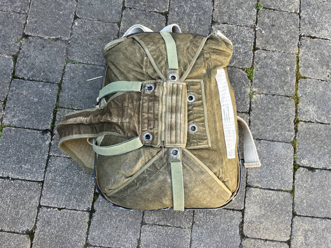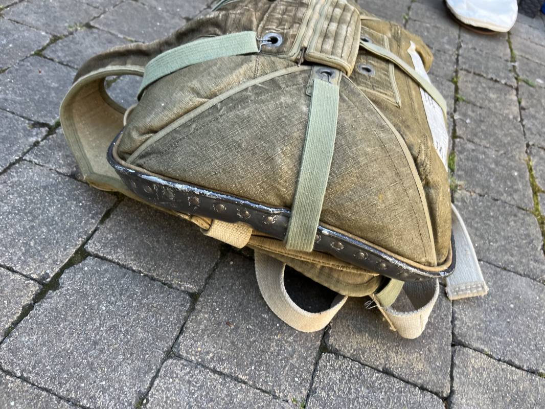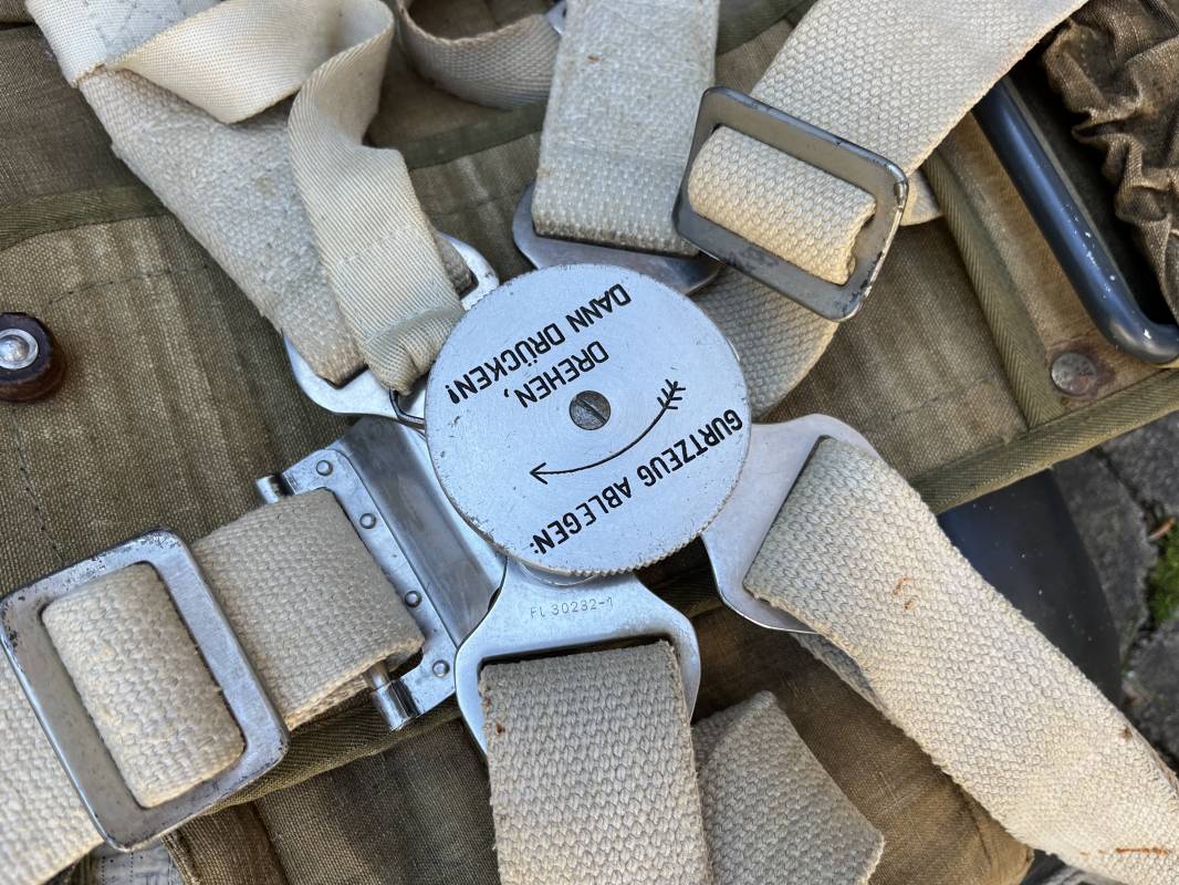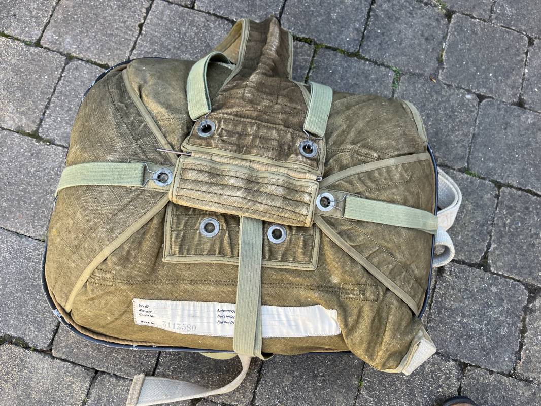 Rare parachute dorsal de pilote ou navigant de la Luftwaffe, « Rückenfallschirm », dossier en aluminium, système de dégrafage rapide du harnais, voilure avec extracteur et suspentes, nombreux tampons de fabrication et d'inspection, daté 3 juin 1942, .Ce modèle équipait aussi bien les pilotes de chasse que les équipages de bombardier de la Luftwaffe. Le parachute n a pas été déplié pour vérifier l'état de la voilure . Voilure interieure en soie blanche . Harnais en forte toile blanche , étaiquette soie . Boucleries en metal . Large boucle de degrafage rapide sur le devant . Parachute legerement utilisé en parfait état 1935/45 Ref 21928