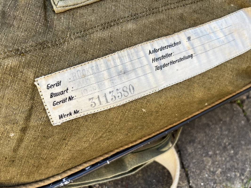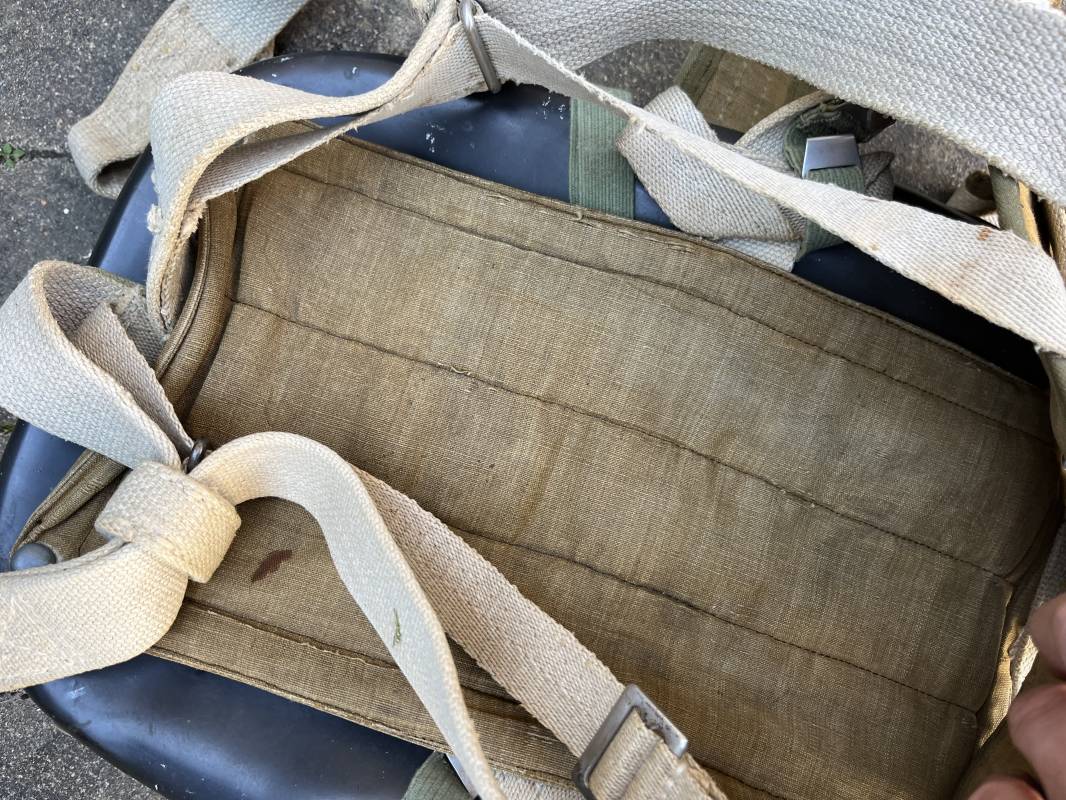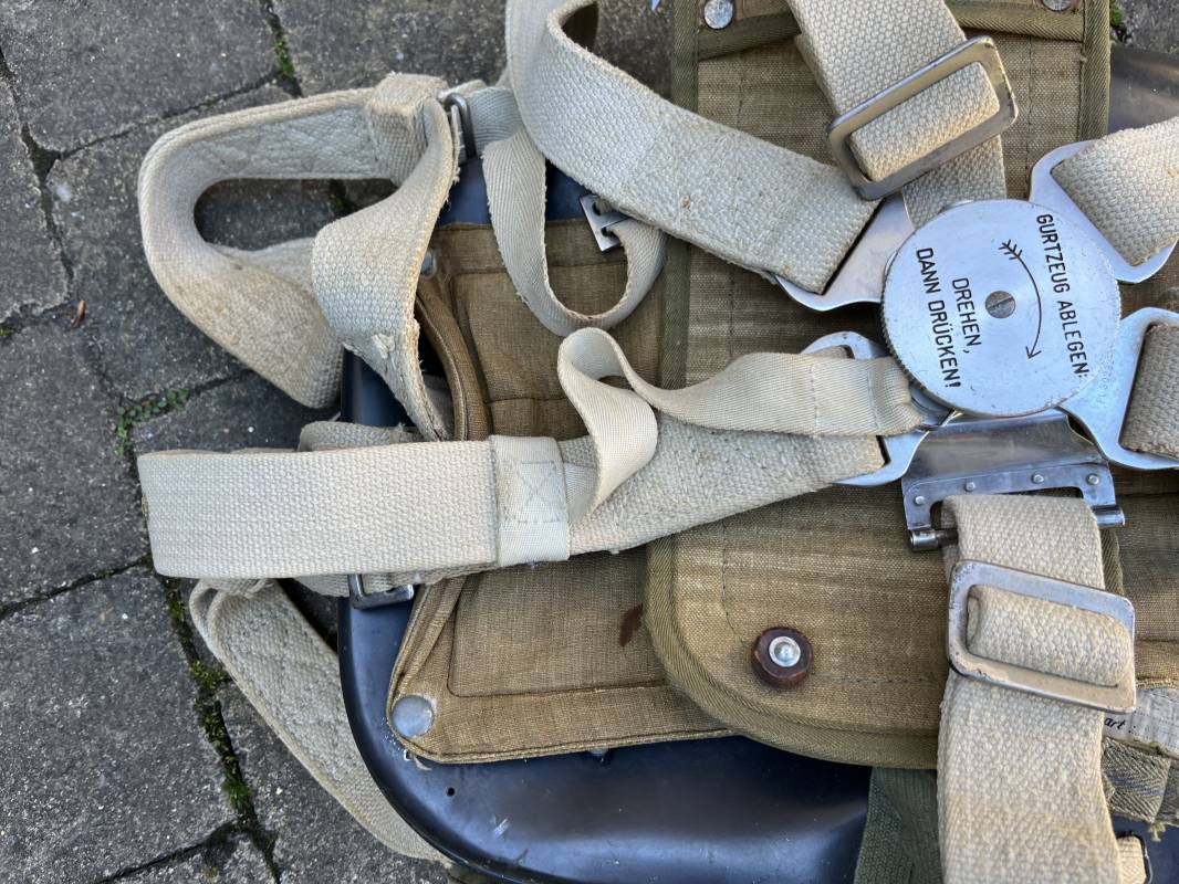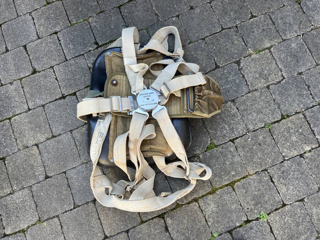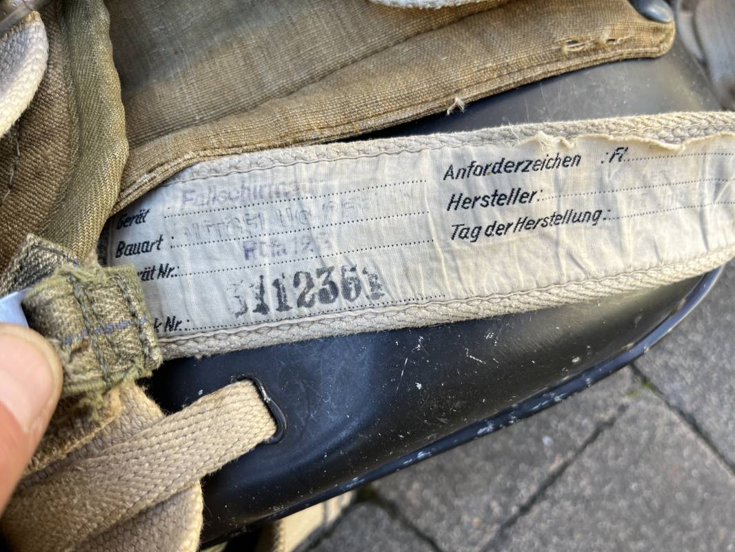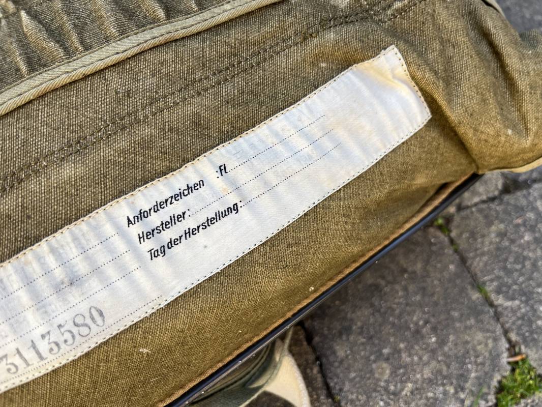 Rare parachute dorsal de pilote ou navigant de la Luftwaffe, « Rückenfallschirm », dossier en aluminium, système de dégrafage rapide du harnais, voilure avec extracteur et suspentes, nombreux tampons de fabrication et d'inspection, daté 3 juin 1942, .Ce modèle équipait aussi bien les pilotes de chasse que les équipages de bombardier de la Luftwaffe. Le parachute n a pas été déplié pour vérifier l'état de la voilure . Voilure interieure en soie blanche . Harnais en forte toile blanche , étaiquette soie . Boucleries en metal . Large boucle de degrafage rapide sur le devant . Parachute legerement utilisé en parfait état 1935/45 Ref 21928