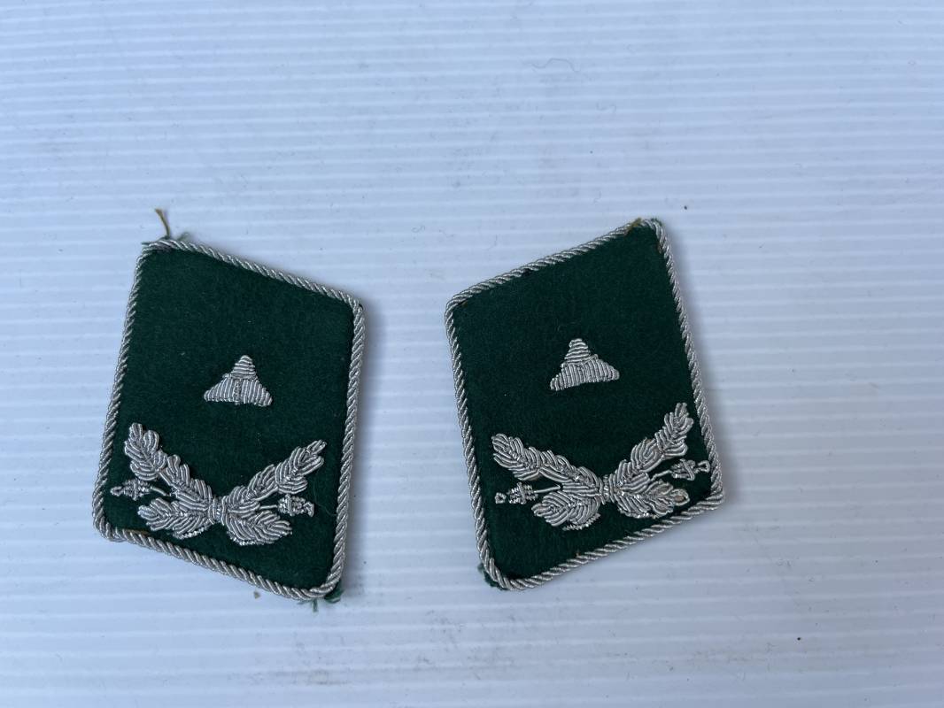 Paire de coins de col ( litzen ) d un officier de l administration de la Luftwaffe , liseré vert foncé .Grade de sous lieutenant ( leutnant) Cannetille argent . Démonté d une vareuse parfait état Ref 21042