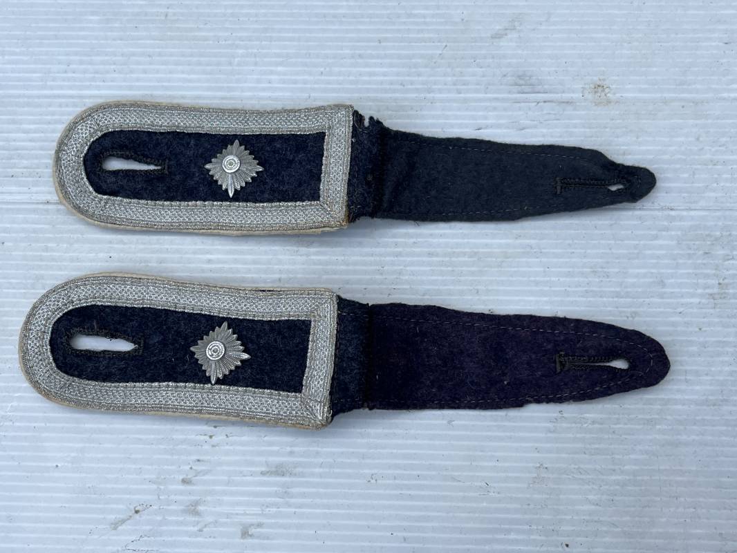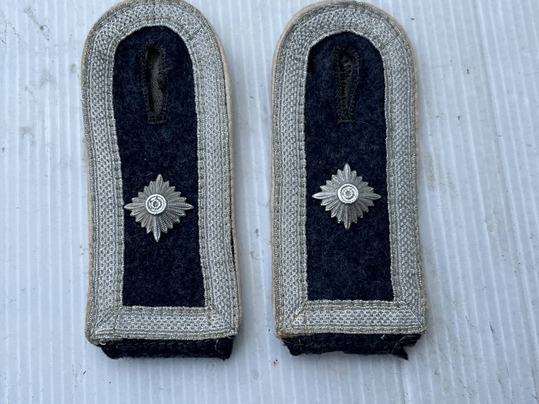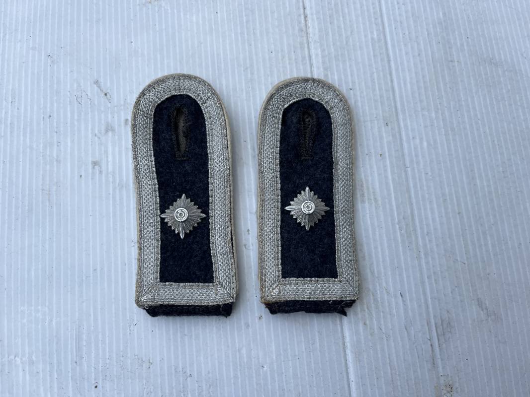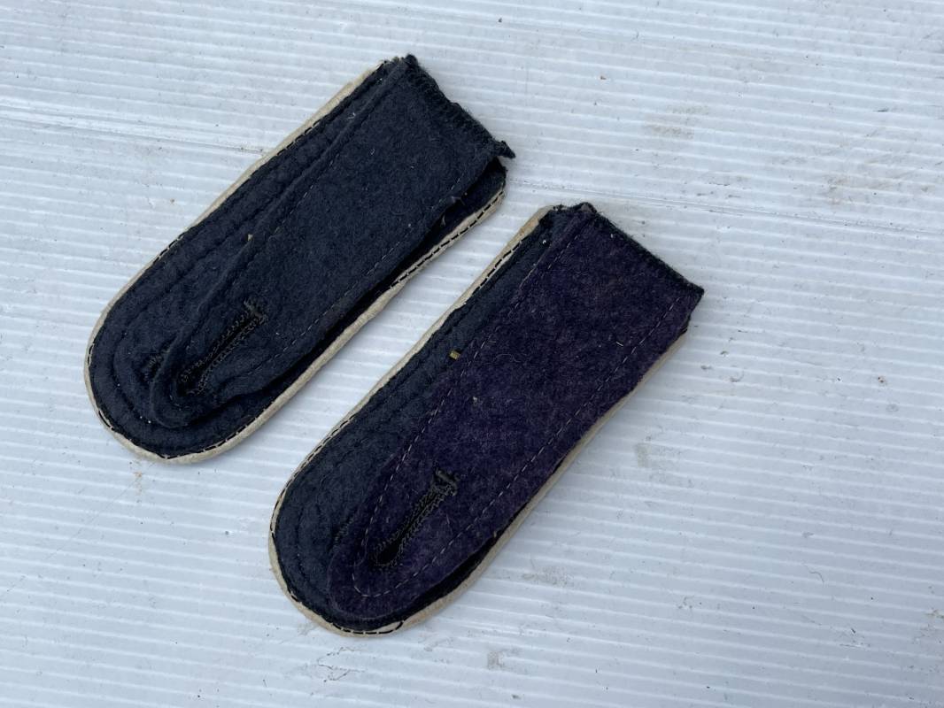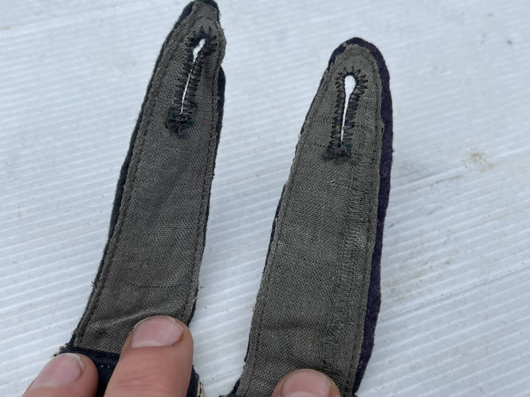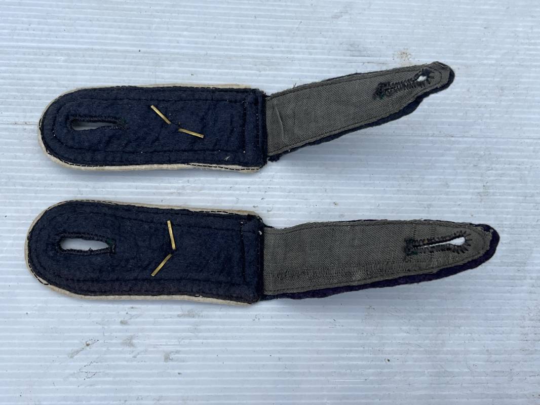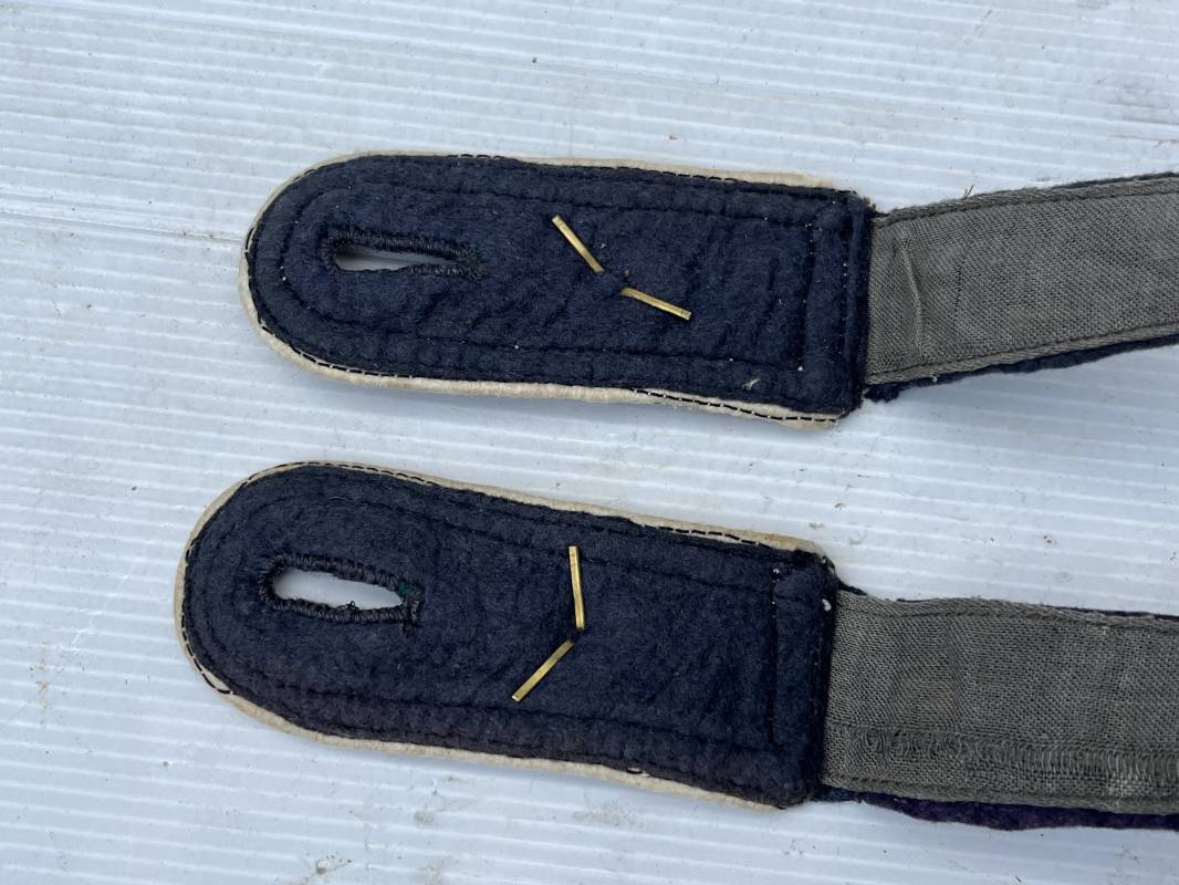 Très belle paire de pattes d'épaules d'un sous officier de la Luftwaffe. Liseré blanc de la Division Hermann Goering . Modèle à rabat pour fliegerbluse ou capote. Pattes en drap gris/bleu. Galons argent de sous officier. Clous de grade d'adjudant chef. Liseré en drap. Longueur 105 mm. Légèrement porté en trés bon état 1942/45. Ref 22207