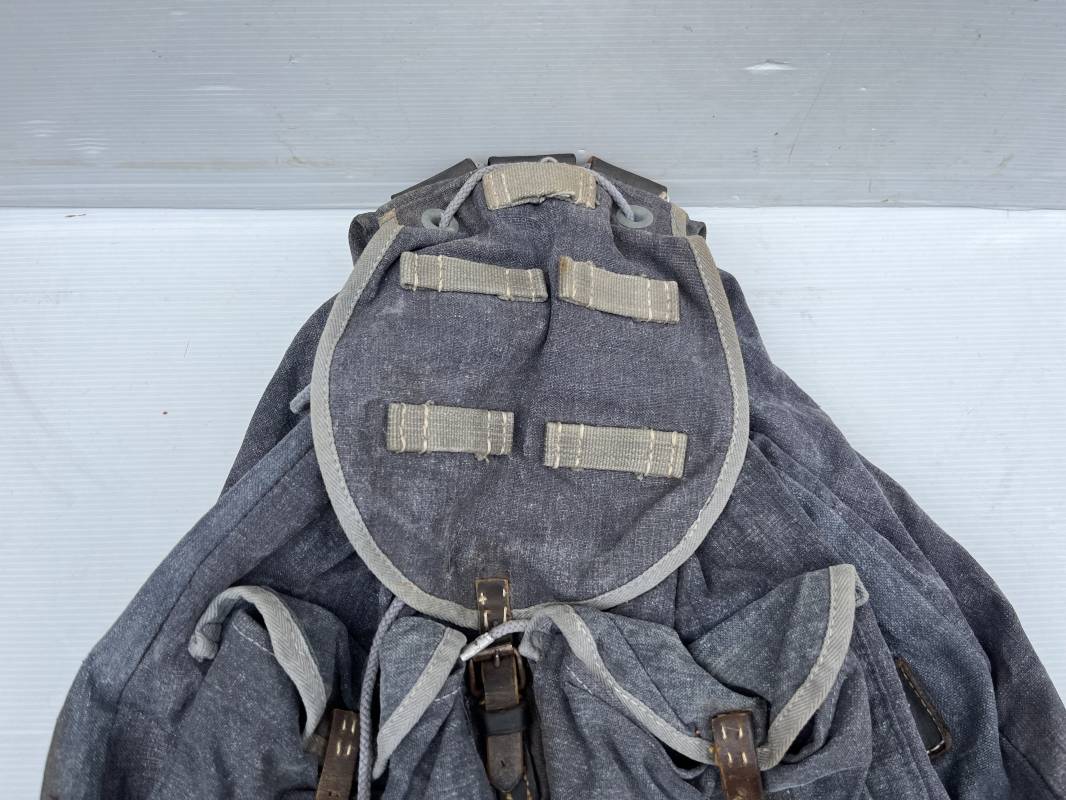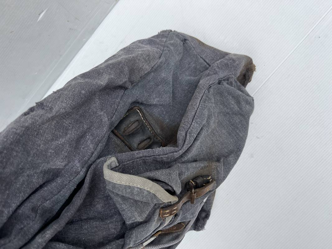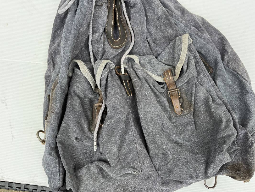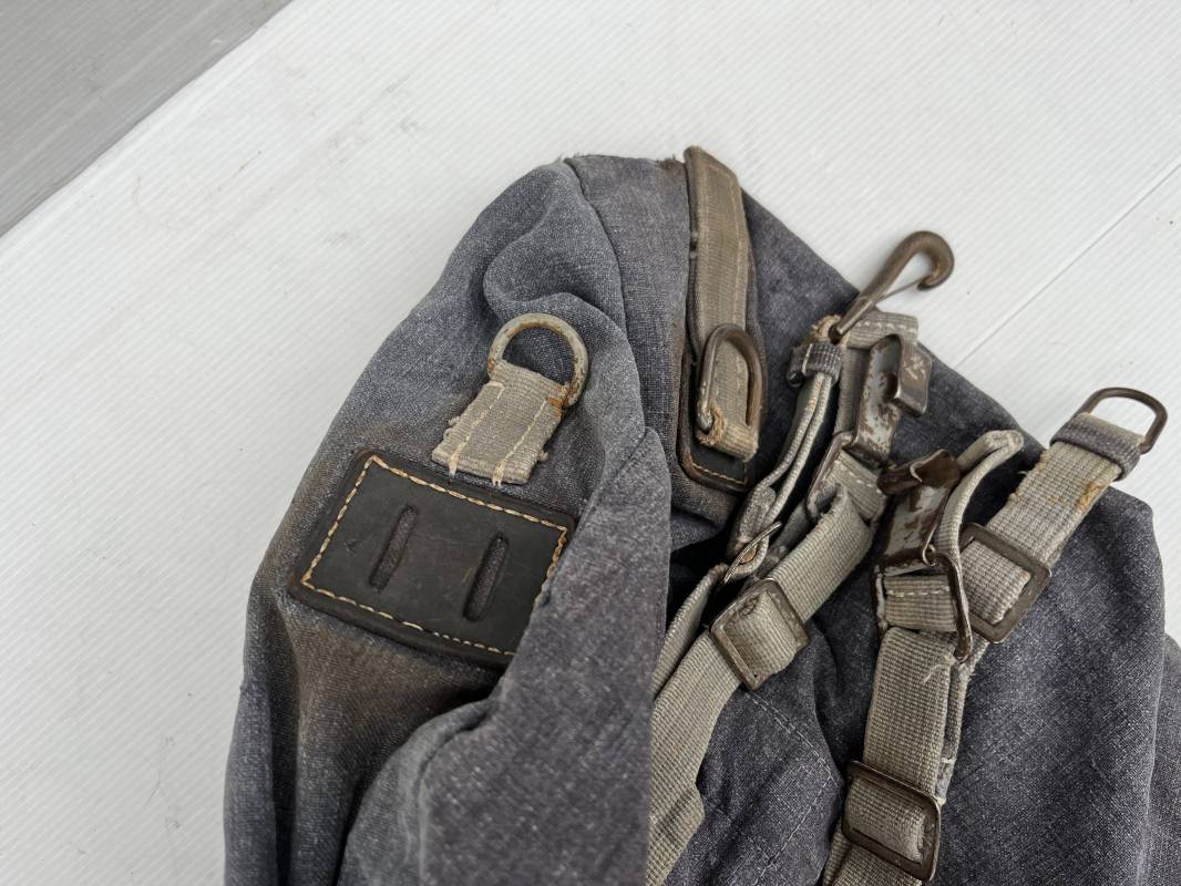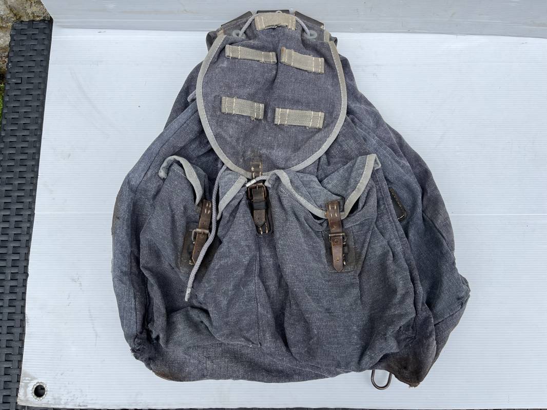 Sac à dos ( Rucksac ) du modèle lourd avec bretelles en toile de couleur gris bleu . Large sac avec deux poches a rabats , passants en toile . Sac du modele lourd avec bretelles en forte toile gris bleu .Boucles et crochets metalliiques Marquage code fabricant Rbnr ; Sac porté en bon état . Sac trouvé en brocante a Avranches ( 50) Ref 20004