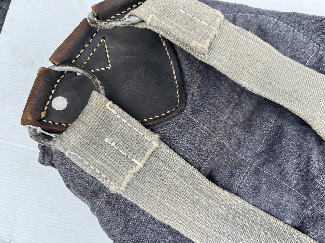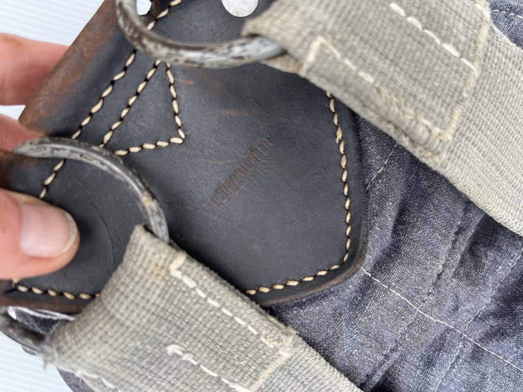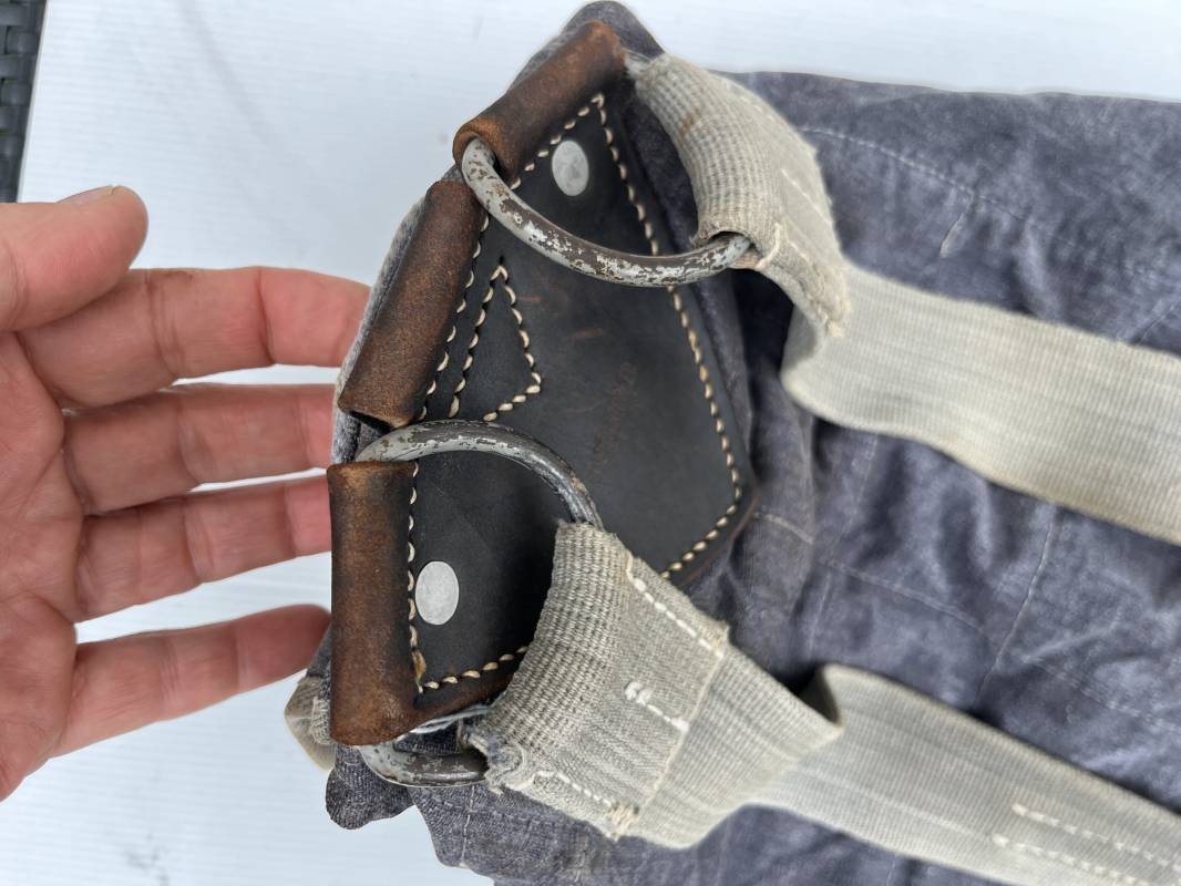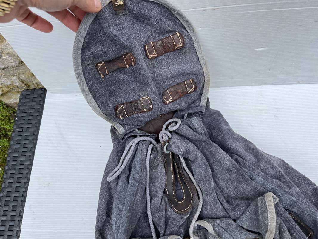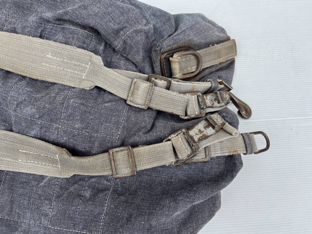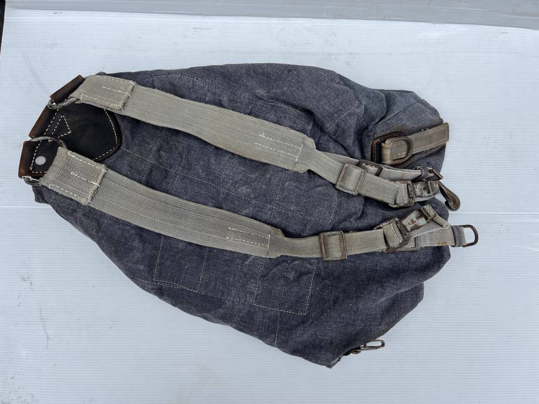 Sac à dos ( Rucksac ) du modèle lourd avec bretelles en toile de couleur gris bleu . Large sac avec deux poches a rabats , passants en toile . Sac du modele lourd avec bretelles en forte toile gris bleu .Boucles et crochets metalliiques Marquage code fabricant Rbnr ; Sac porté en bon état . Sac trouvé en brocante a Avranches ( 50) Ref 20004