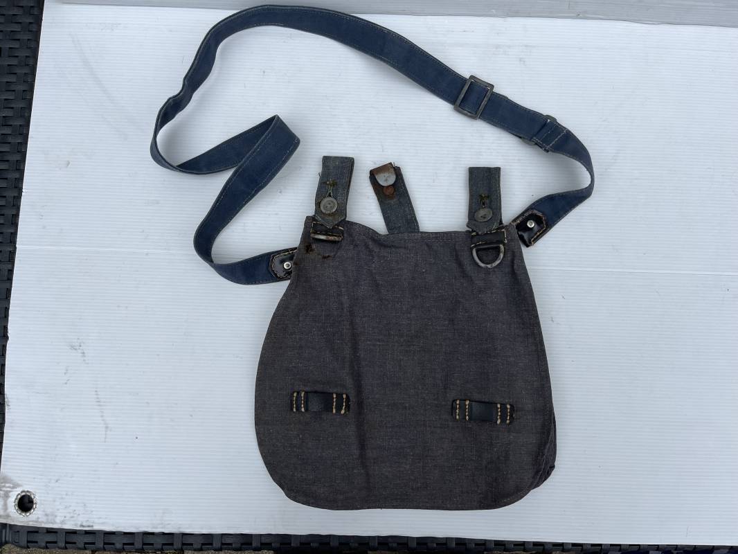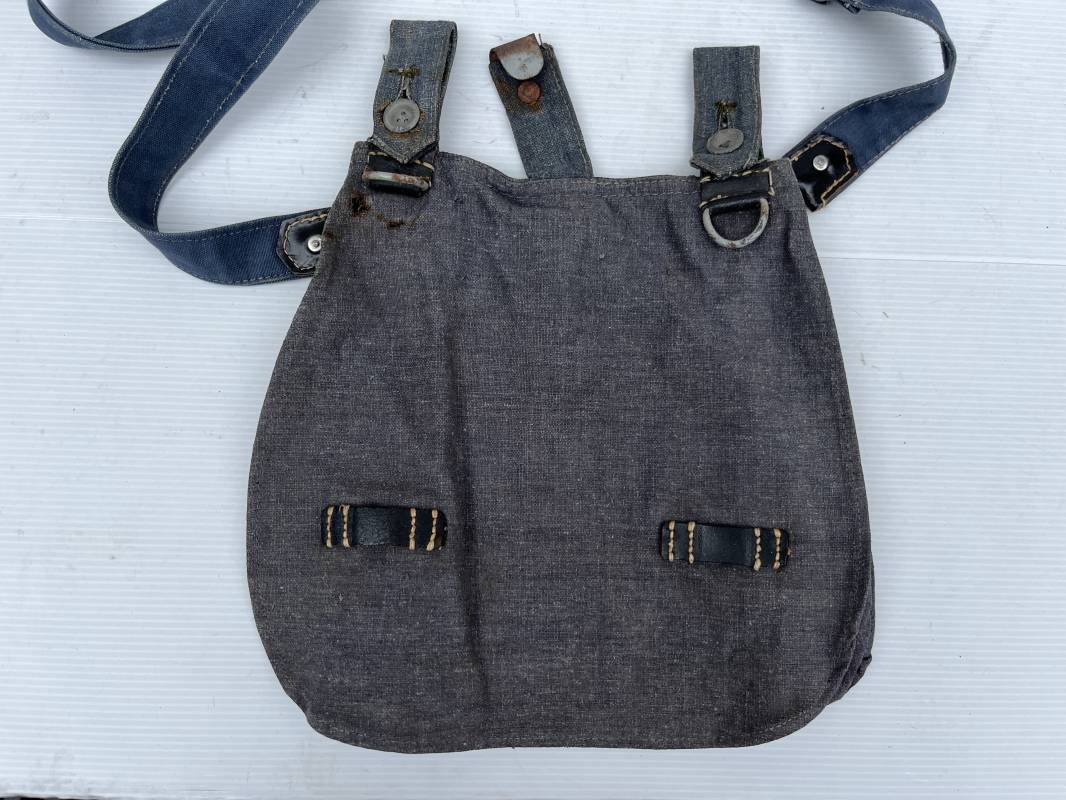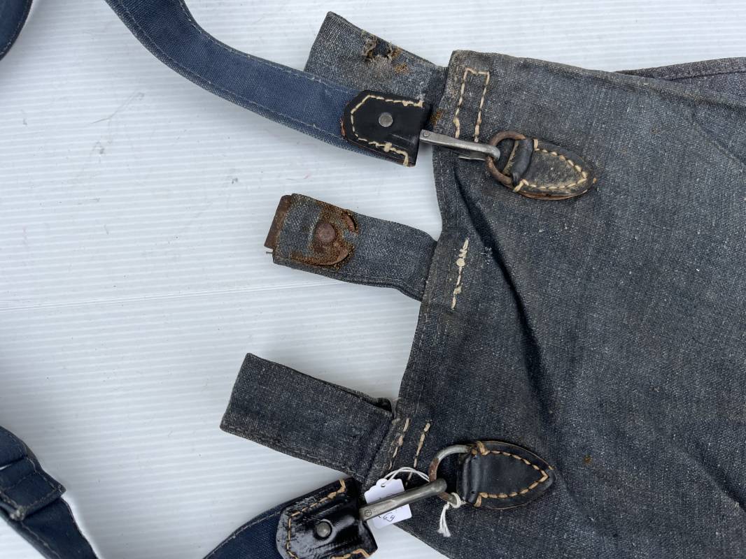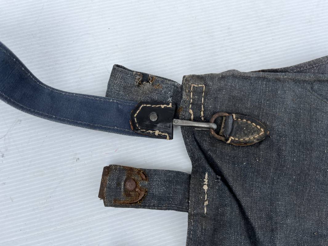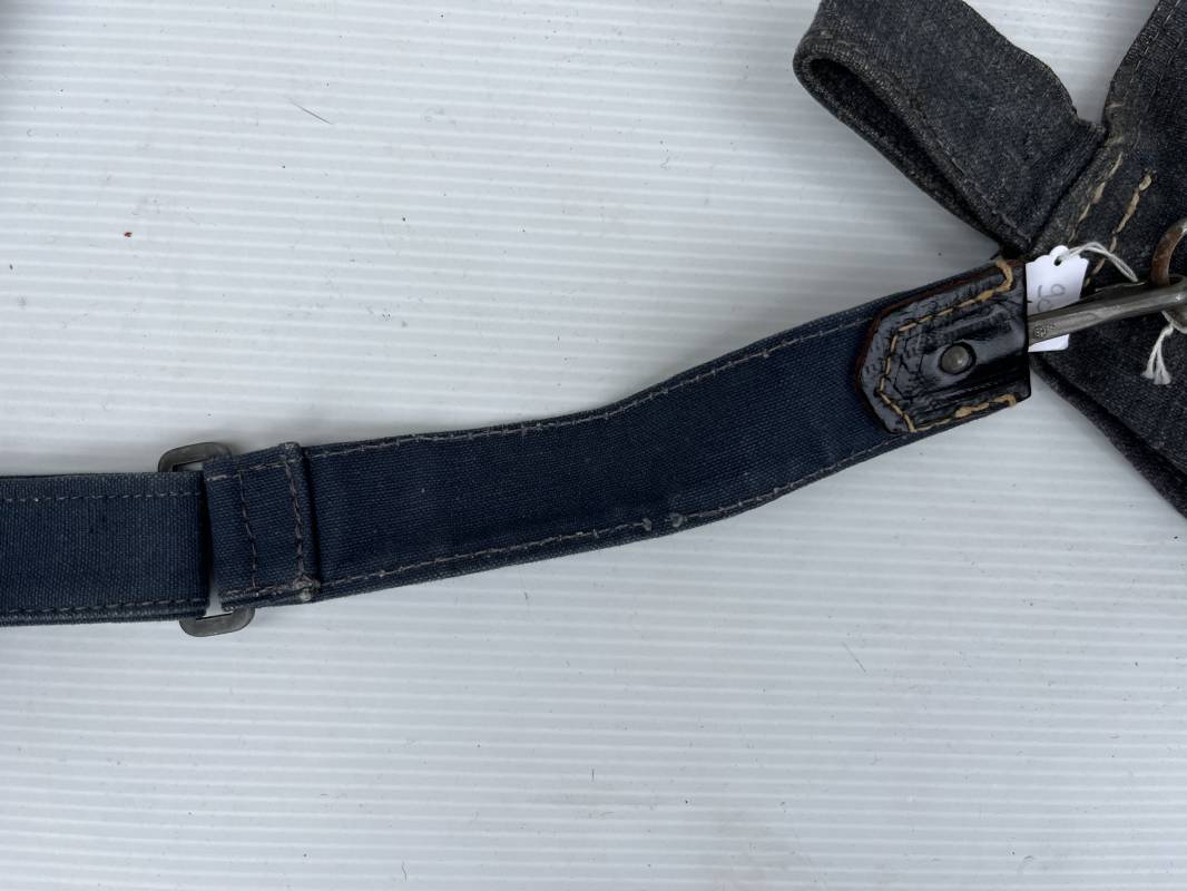 Beau sac à pain ( brot beutel ) modéle 1931 et sa sangle de la Luftwaffe en toile bleu. Passants de ceinturon en toile et crochet fer plat. Passants en cuir noir, boutons en zinc cousus d'origine. Anneaux en fer. Porté en bel état (petites usures au niveau passant ceinturon voir photo). Sangle en toile pour le port en bandoulière , boucle et crochets fer Belle couleur bleu non délavée . 1940/45. Ref 10269