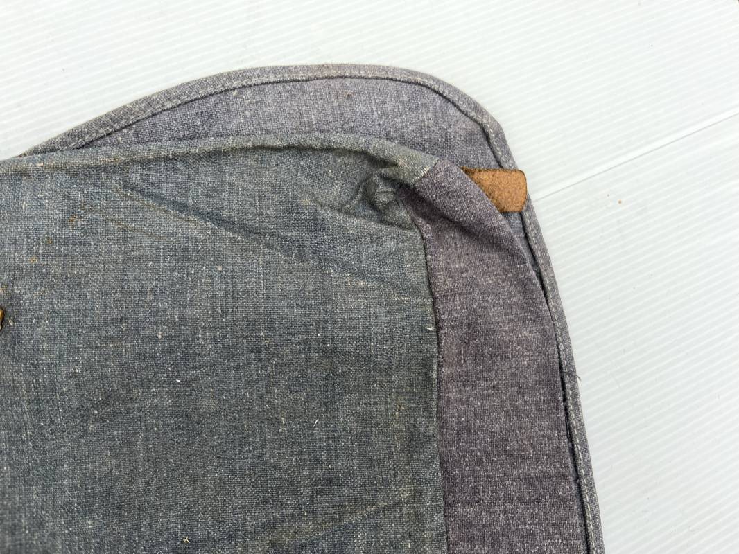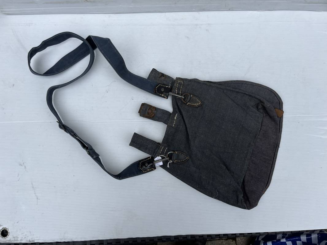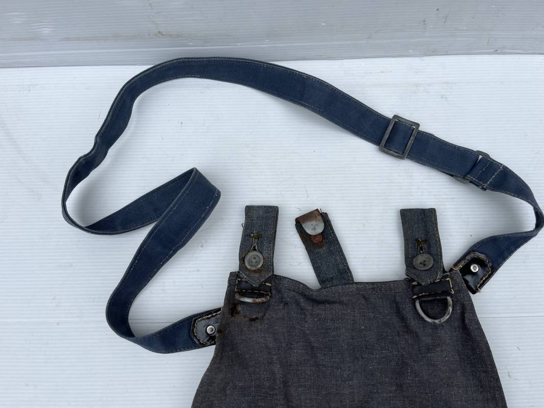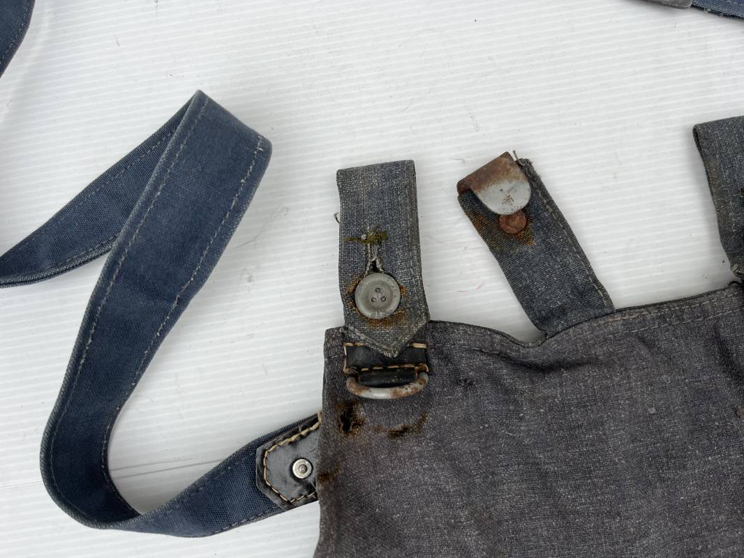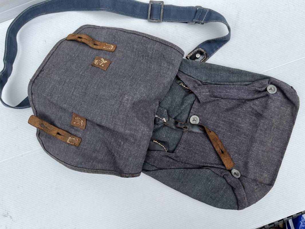 Beau sac à pain ( brot beutel ) modéle 1931 et sa sangle de la Luftwaffe en toile bleu. Passants de ceinturon en toile et crochet fer plat. Passants en cuir noir, boutons en zinc cousus d'origine. Anneaux en fer. Porté en bel état (petites usures au niveau passant ceinturon voir photo). Sangle en toile pour le port en bandoulière , boucle et crochets fer Belle couleur bleu non délavée . 1940/45. Ref 10269