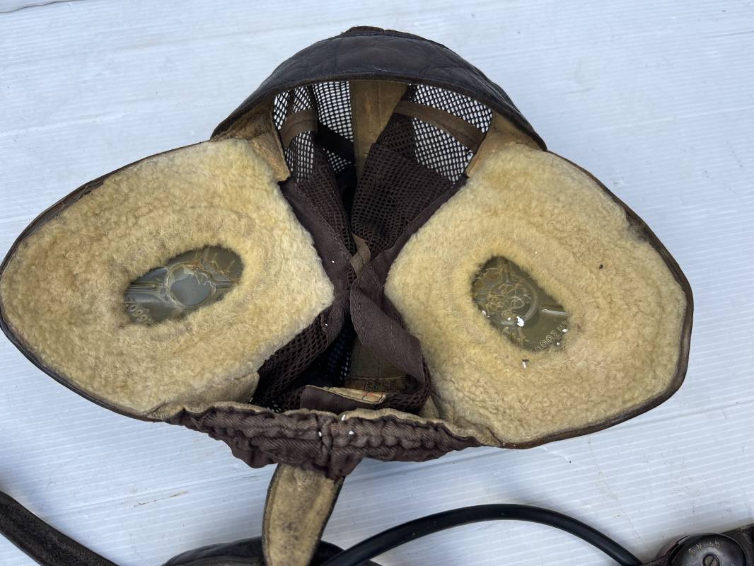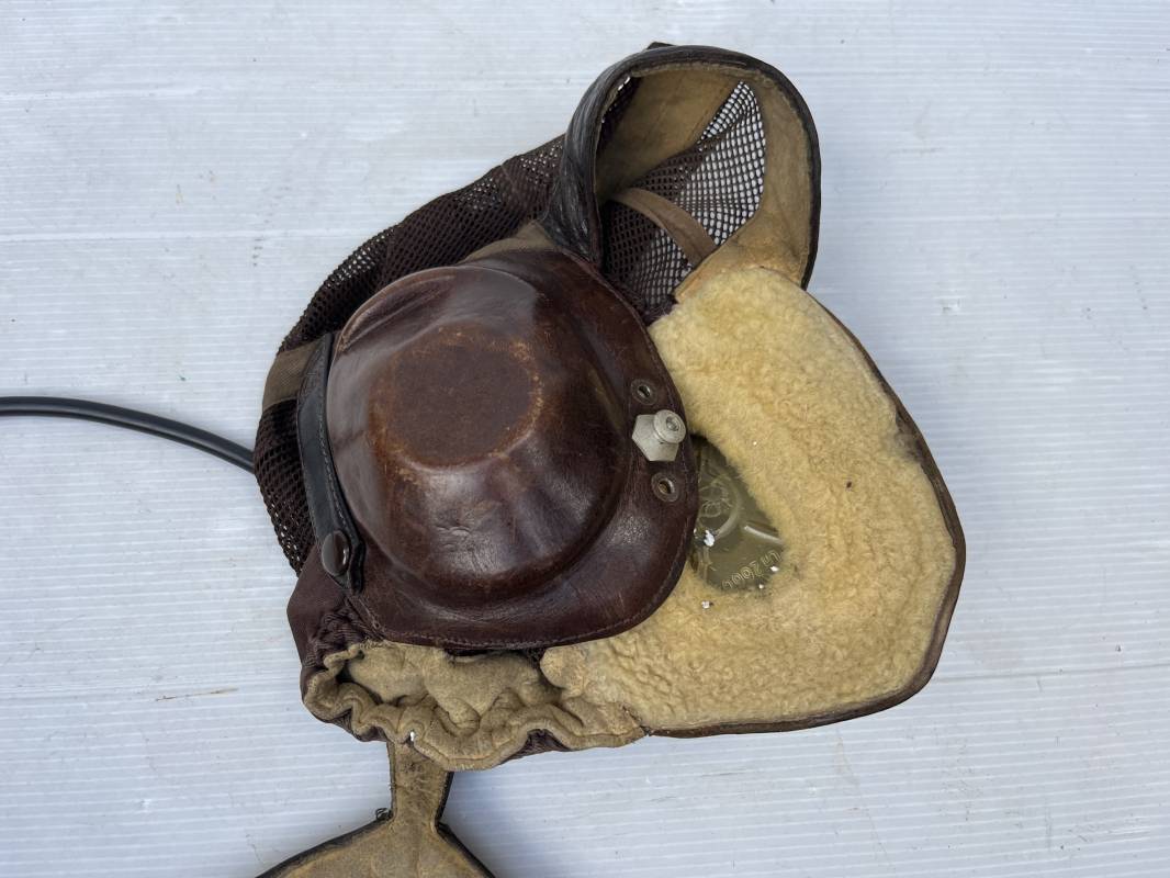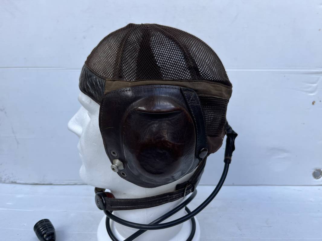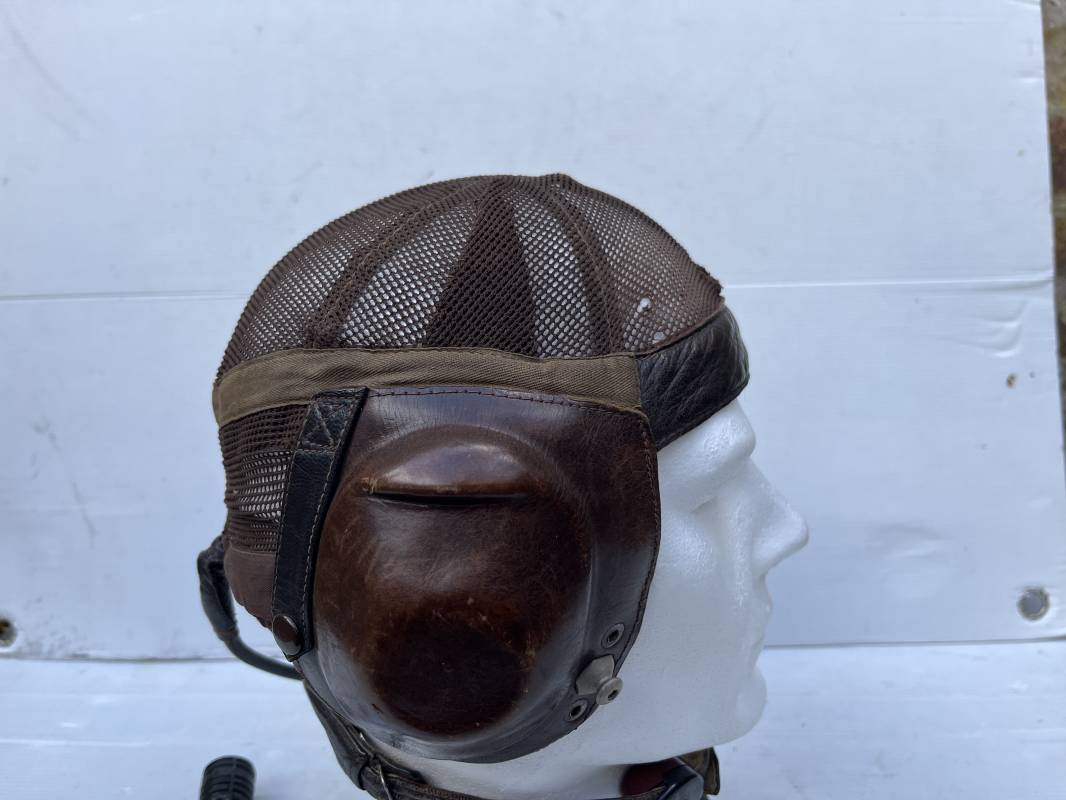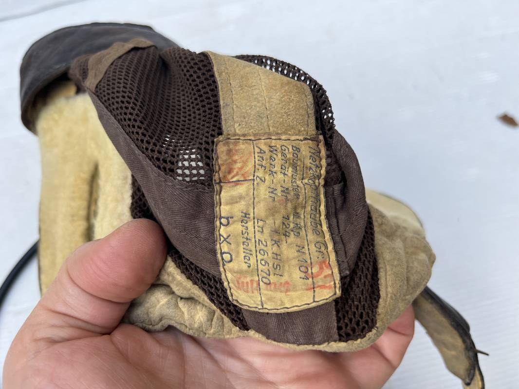 Rare serre tète lKp N 101 d'un navigant de la Luftwaffe. Serre tète 'été' du modèle "filet". Oreillettes en cuir marron foncé avec écouteurs à l'intérieur . Filet en coton marron foncé. Passants cuir pour le maintien des lunettes de vol. Deux écroux alu pour le port du masque. Intèrieur doublé en mouton blanc . Etiquette fabricant 'bxo',tampon de réception de la luftwaffe "BAL", taille 57 Daté Jun 1942 . Laryngophones en bakélite marron foncé , sangle en cuir marron . Marquage fabricant . Fermeture par pressions. Intèrieur de la sangle doublé chamois. Câble et fiche en bakélite d'origines. Serre tête légèrement porté en bel état 1940/45. Ref 19126