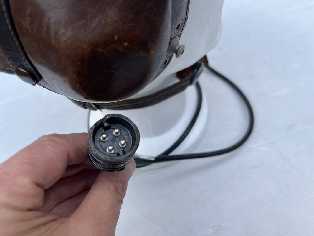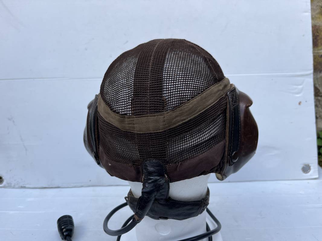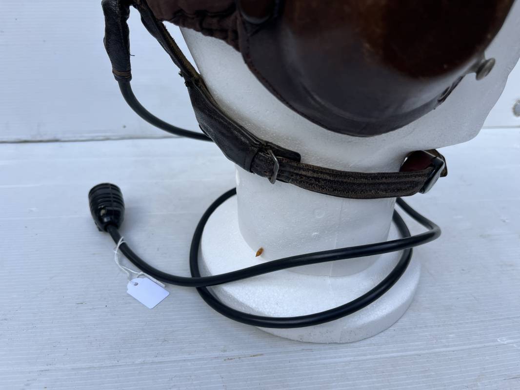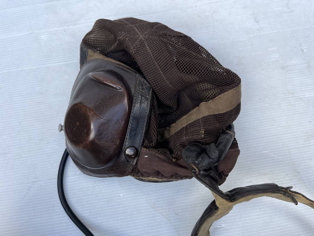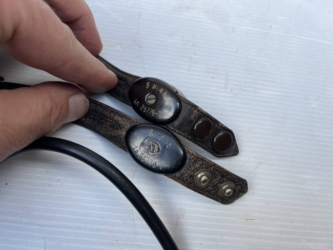 Rare serre tète lKp N 101 d'un navigant de la Luftwaffe. Serre tète 'été' du modèle "filet". Oreillettes en cuir marron foncé avec écouteurs à l'intérieur . Filet en coton marron foncé. Passants cuir pour le maintien des lunettes de vol. Deux écroux alu pour le port du masque. Intèrieur doublé en mouton blanc . Etiquette fabricant 'bxo',tampon de réception de la luftwaffe "BAL", taille 57 Daté Jun 1942 . Laryngophones en bakélite marron foncé , sangle en cuir marron . Marquage fabricant . Fermeture par pressions. Intèrieur de la sangle doublé chamois. Câble et fiche en bakélite d'origines. Serre tête légèrement porté en bel état 1940/45. Ref 19126
