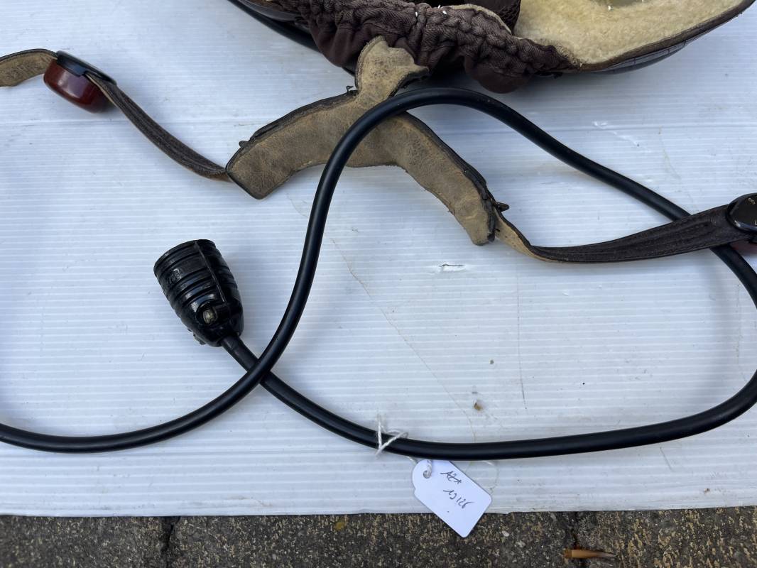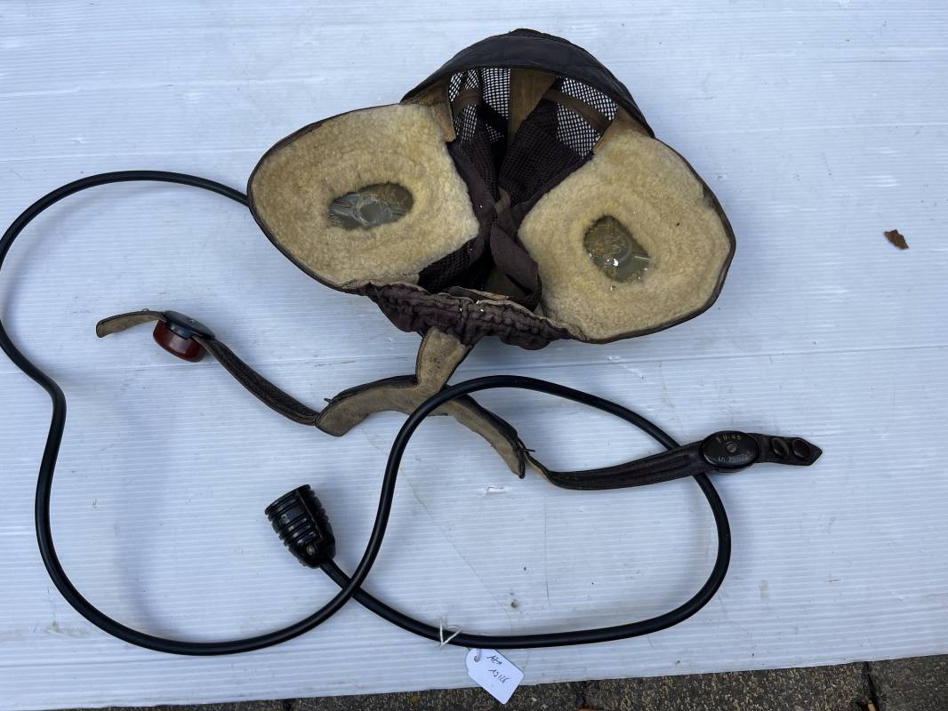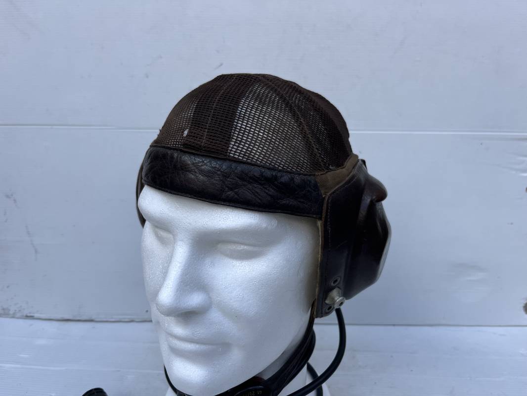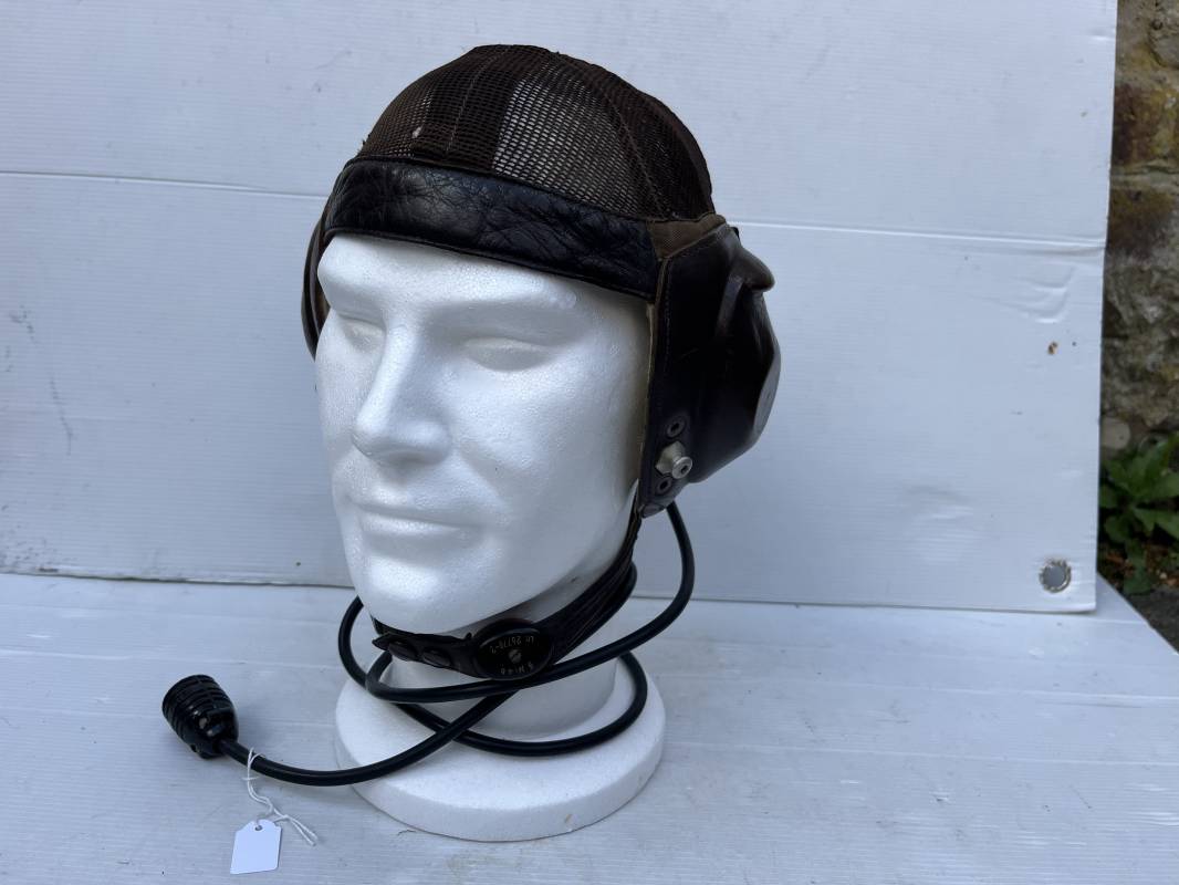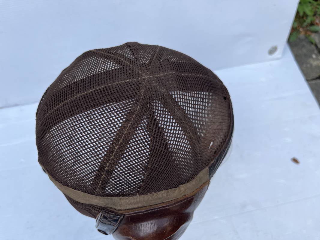 Rare serre tète lKp N 101 d'un navigant de la Luftwaffe. Serre tète 'été' du modèle "filet". Oreillettes en cuir marron foncé avec écouteurs à l'intérieur . Filet en coton marron foncé. Passants cuir pour le maintien des lunettes de vol. Deux écroux alu pour le port du masque. Intèrieur doublé en mouton blanc . Etiquette fabricant 'bxo',tampon de réception de la luftwaffe "BAL", taille 57 Daté Jun 1942 . Laryngophones en bakélite marron foncé , sangle en cuir marron . Marquage fabricant . Fermeture par pressions. Intèrieur de la sangle doublé chamois. Câble et fiche en bakélite d'origines. Serre tête légèrement porté en bel état 1940/45. Ref 19126