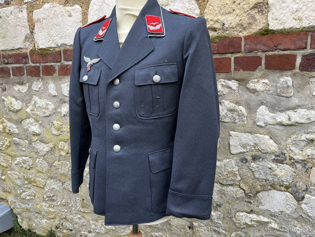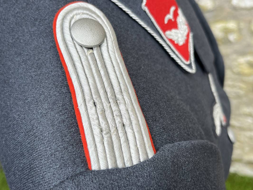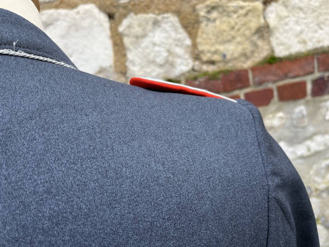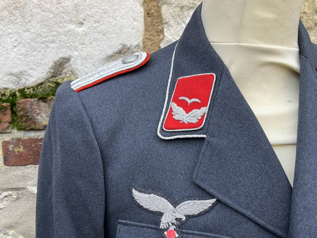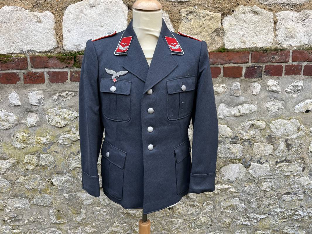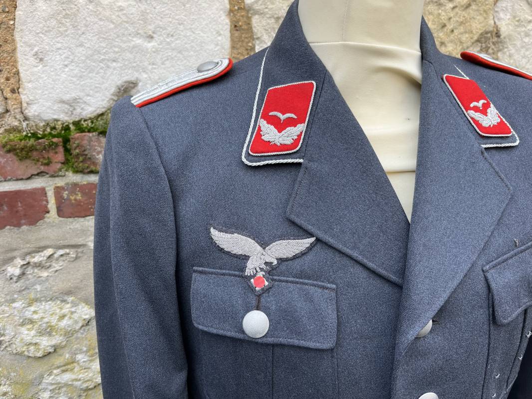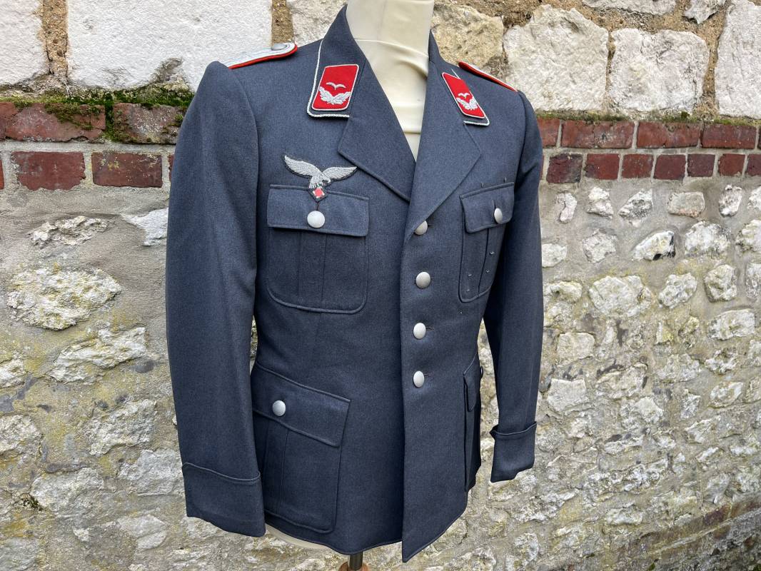 Très belle veste quatre poches ( Dienst Rock ) d'un officier de la Luftwaffe en gabardin gris bleu. Cette veste est entièrement montée d origine . Liseré rouge de l'artillerie, quatre poches à plis, boutons grenelés argent cousus d'origine. Pattes de col et d'épaules d'un sous lieutenant ( leunant ) de la Flak Artillerie. Galon de col torsadé pour officier. Aigle de poitrine brodé cannetille argent. Passants pour le port de deux décorations de poitrine et ruban de décoration . Intérieur doublé satinette gris bleu. Etiquette fabricant Edouard Zeeck Stralsund , poche intérieure avec noominette du fabricant avec nom de l officier et matricule , daté 28 02 1939 . Passant et anneau métalliques pour le port de la dague.Petite ceinture ventrière en tissu satinette avec boutons pression de fermeture . Veste légèrement portée en parfait état. Largeur épaules 43cm. Longueur 68 cm. Manches 60cm. Superbe veste entièrement montée d'origine en parfait état . Veste trouvée en Allemagne directement dans la famille 100% nature et intouchée . 1939/45 . Ref 21570