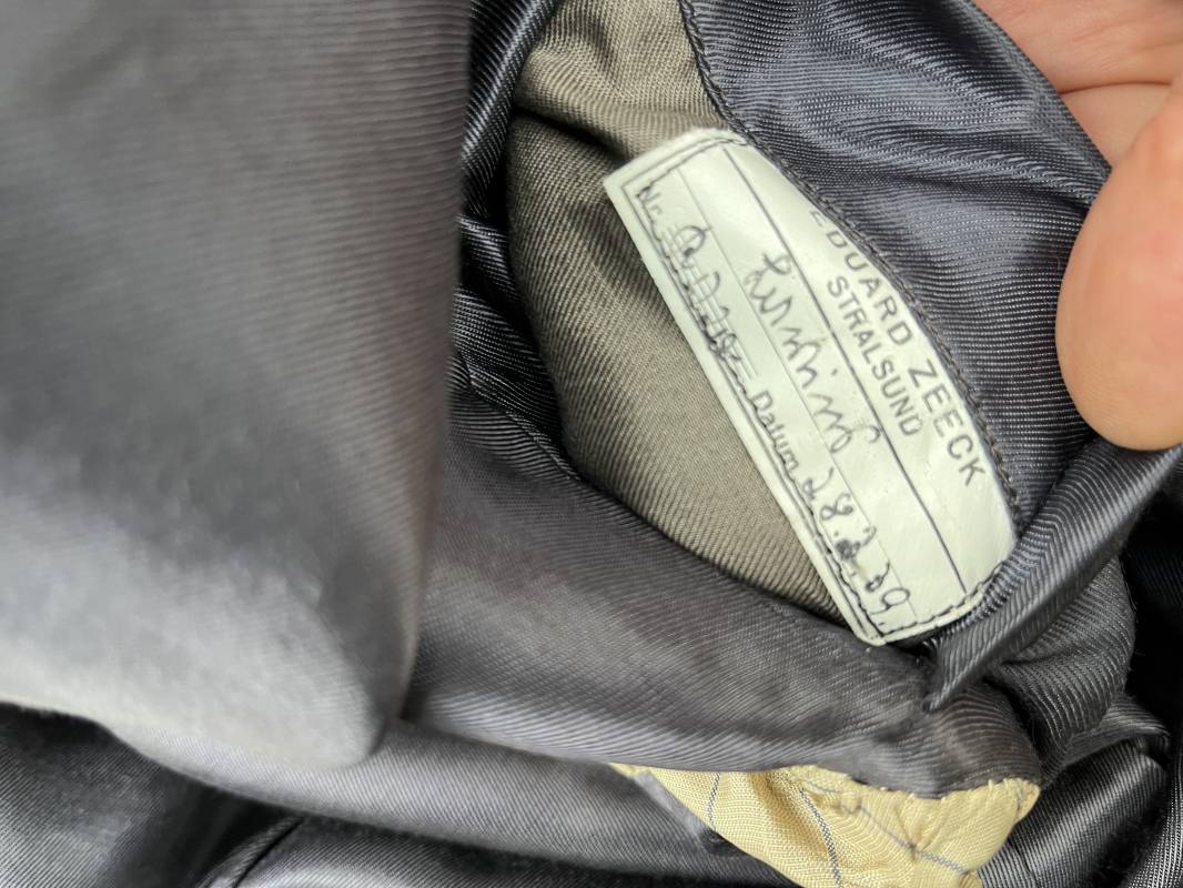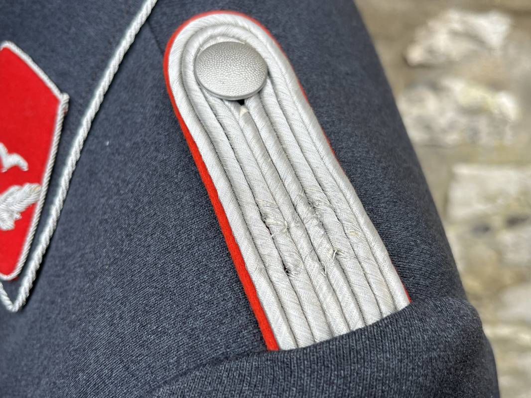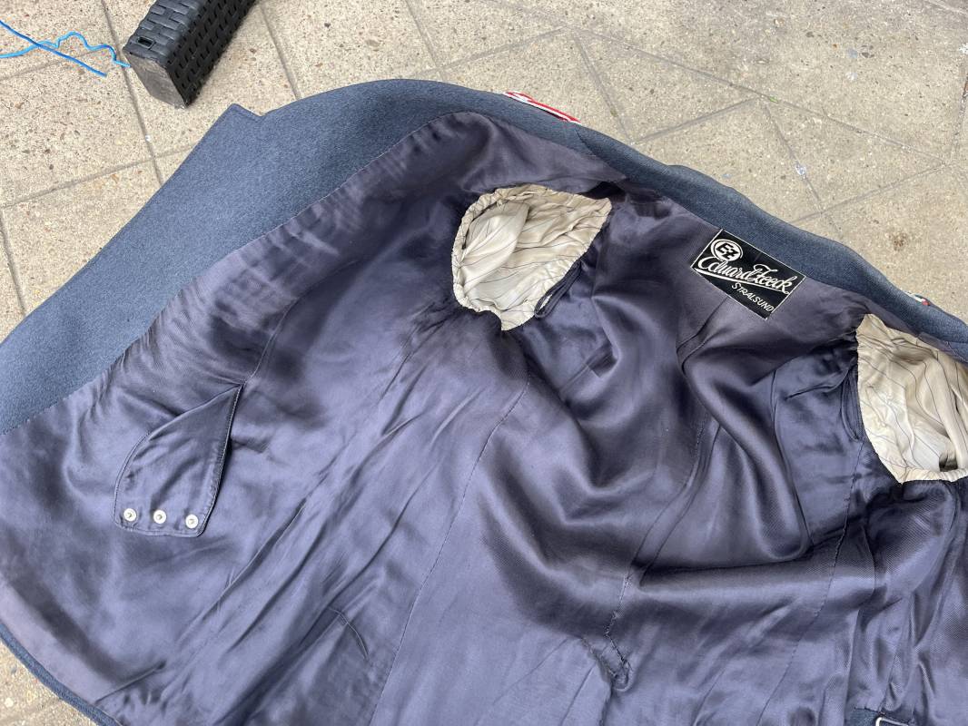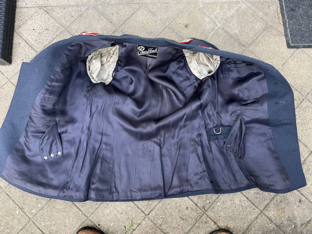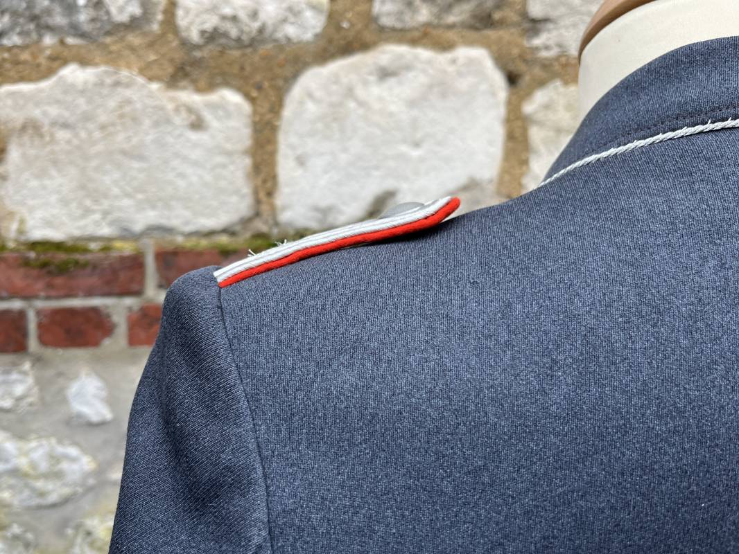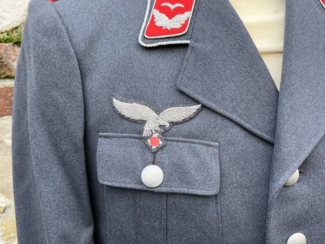 Très belle veste quatre poches ( Dienst Rock ) d'un officier de la Luftwaffe en gabardin gris bleu. Cette veste est entièrement montée d origine . Liseré rouge de l'artillerie, quatre poches à plis, boutons grenelés argent cousus d'origine. Pattes de col et d'épaules d'un sous lieutenant ( leunant ) de la Flak Artillerie. Galon de col torsadé pour officier. Aigle de poitrine brodé cannetille argent. Passants pour le port de deux décorations de poitrine et ruban de décoration . Intérieur doublé satinette gris bleu. Etiquette fabricant Edouard Zeeck Stralsund , poche intérieure avec noominette du fabricant avec nom de l officier et matricule , daté 28 02 1939 . Passant et anneau métalliques pour le port de la dague.Petite ceinture ventrière en tissu satinette avec boutons pression de fermeture . Veste légèrement portée en parfait état. Largeur épaules 43cm. Longueur 68 cm. Manches 60cm. Superbe veste entièrement montée d'origine en parfait état . Veste trouvée en Allemagne directement dans la famille 100% nature et intouchée . 1939/45 . Ref 21570