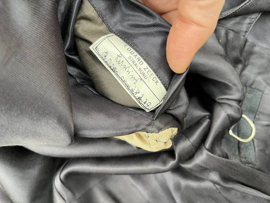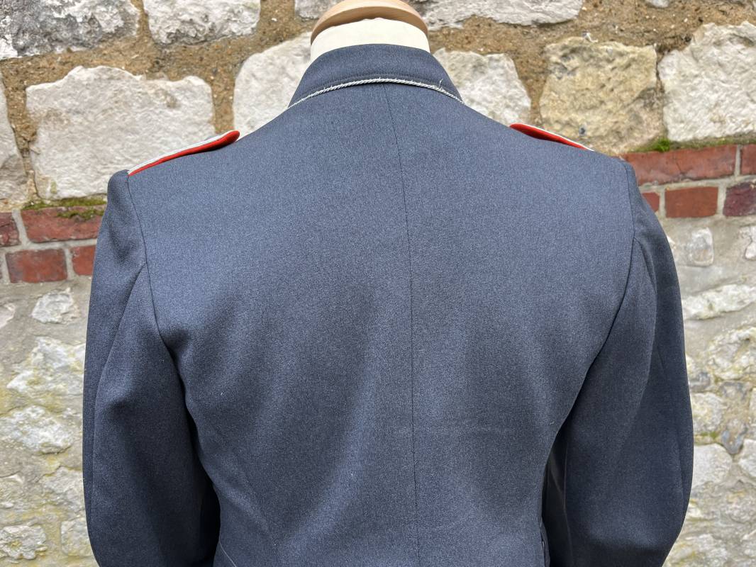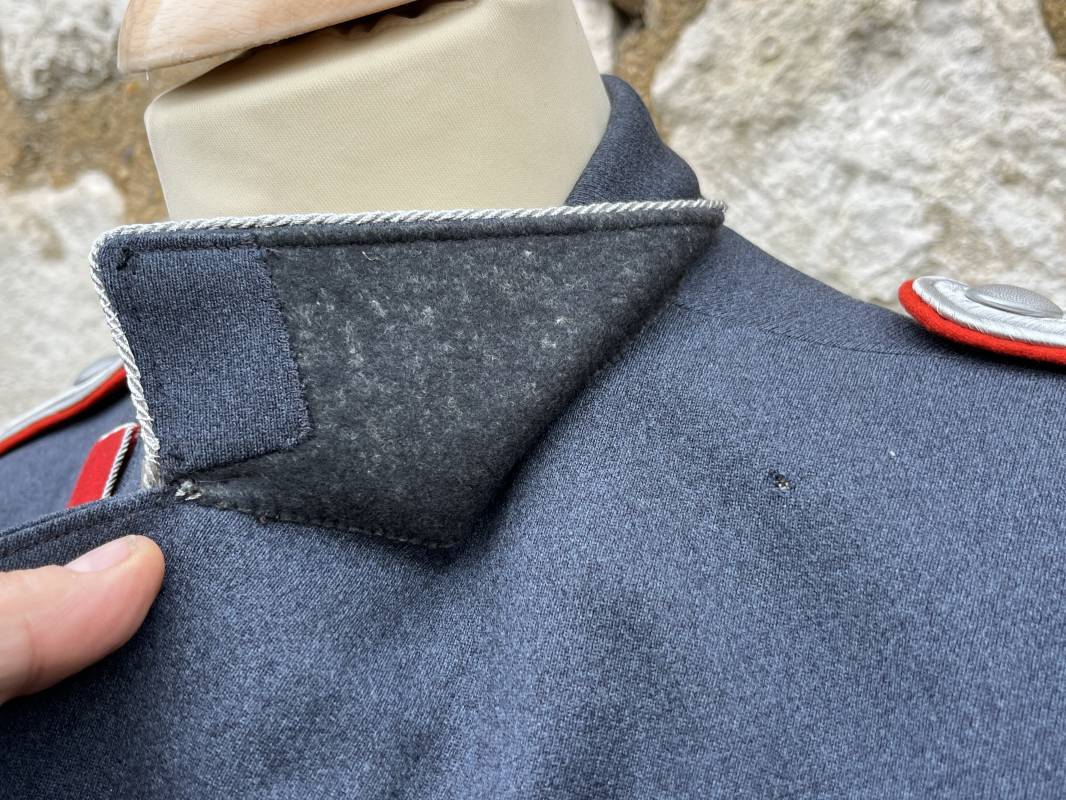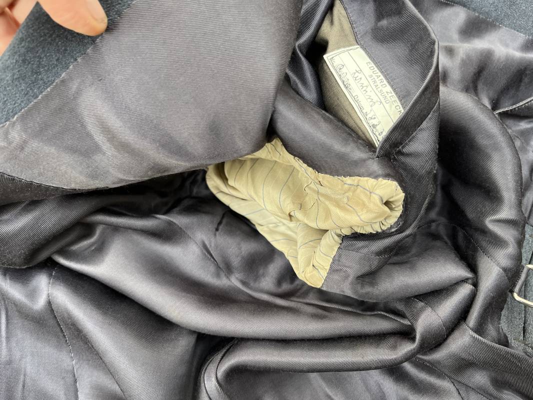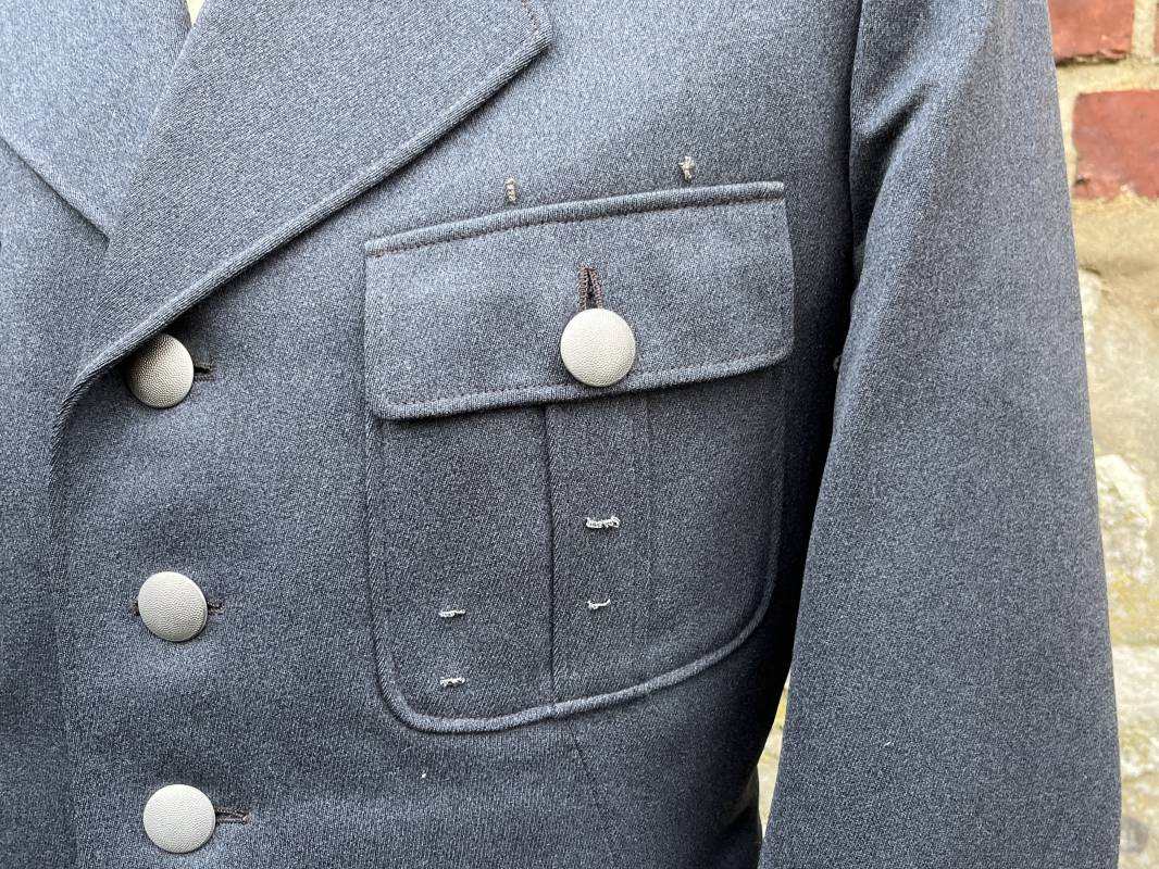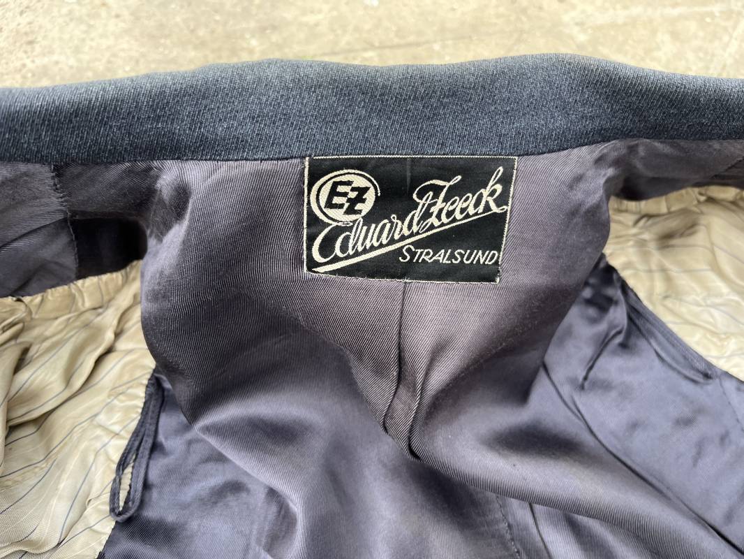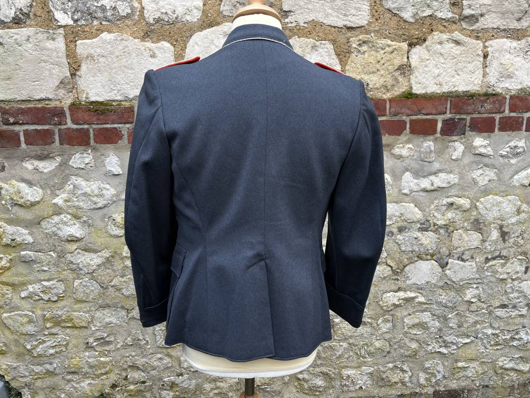 Très belle veste quatre poches ( Dienst Rock ) d'un officier de la Luftwaffe en gabardin gris bleu. Cette veste est entièrement montée d origine . Liseré rouge de l'artillerie, quatre poches à plis, boutons grenelés argent cousus d'origine. Pattes de col et d'épaules d'un sous lieutenant ( leunant ) de la Flak Artillerie. Galon de col torsadé pour officier. Aigle de poitrine brodé cannetille argent. Passants pour le port de deux décorations de poitrine et ruban de décoration . Intérieur doublé satinette gris bleu. Etiquette fabricant Edouard Zeeck Stralsund , poche intérieure avec noominette du fabricant avec nom de l officier et matricule , daté 28 02 1939 . Passant et anneau métalliques pour le port de la dague.Petite ceinture ventrière en tissu satinette avec boutons pression de fermeture . Veste légèrement portée en parfait état. Largeur épaules 43cm. Longueur 68 cm. Manches 60cm. Superbe veste entièrement montée d'origine en parfait état . Veste trouvée en Allemagne directement dans la famille 100% nature et intouchée . 1939/45 . Ref 21570