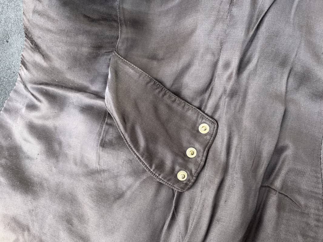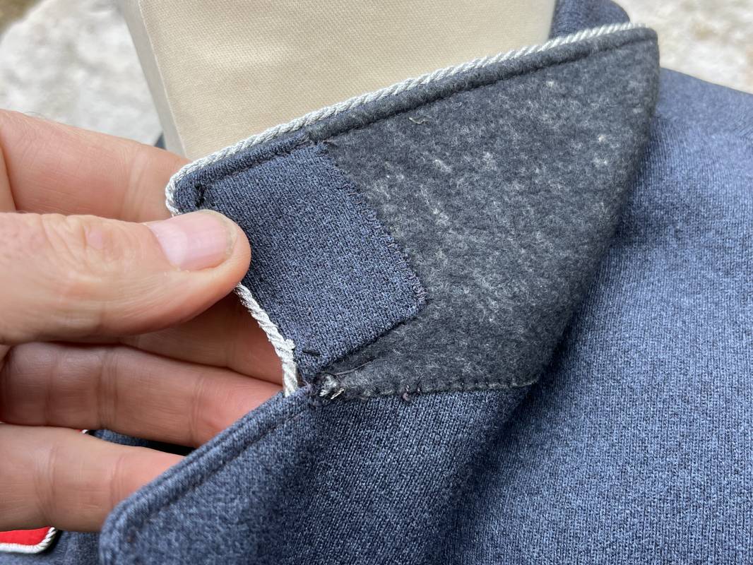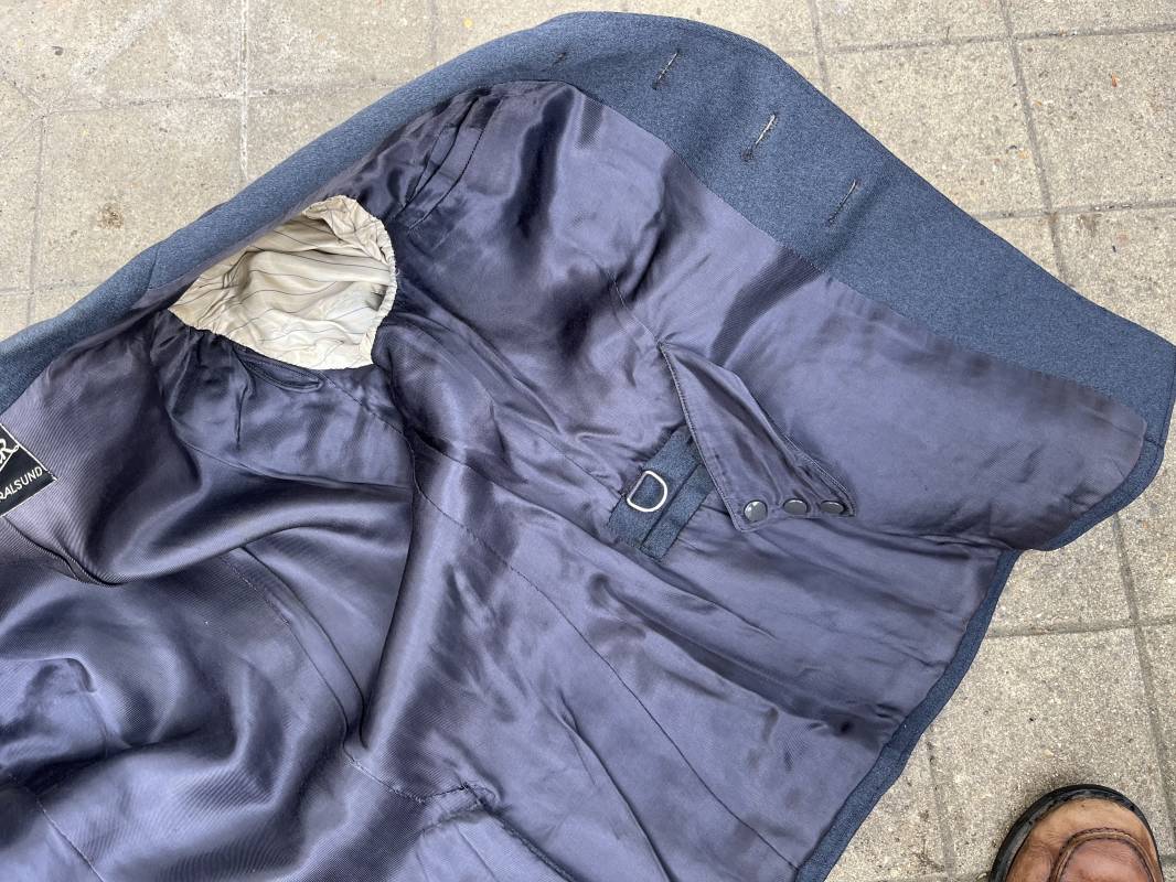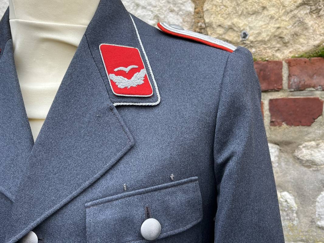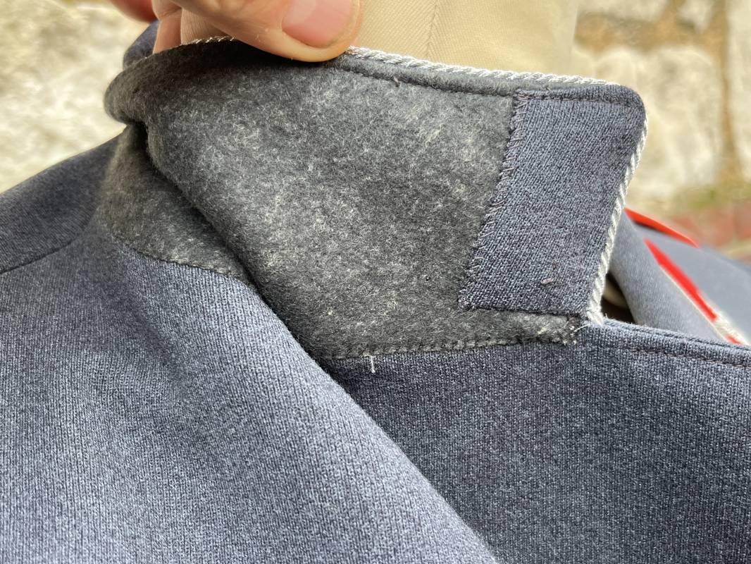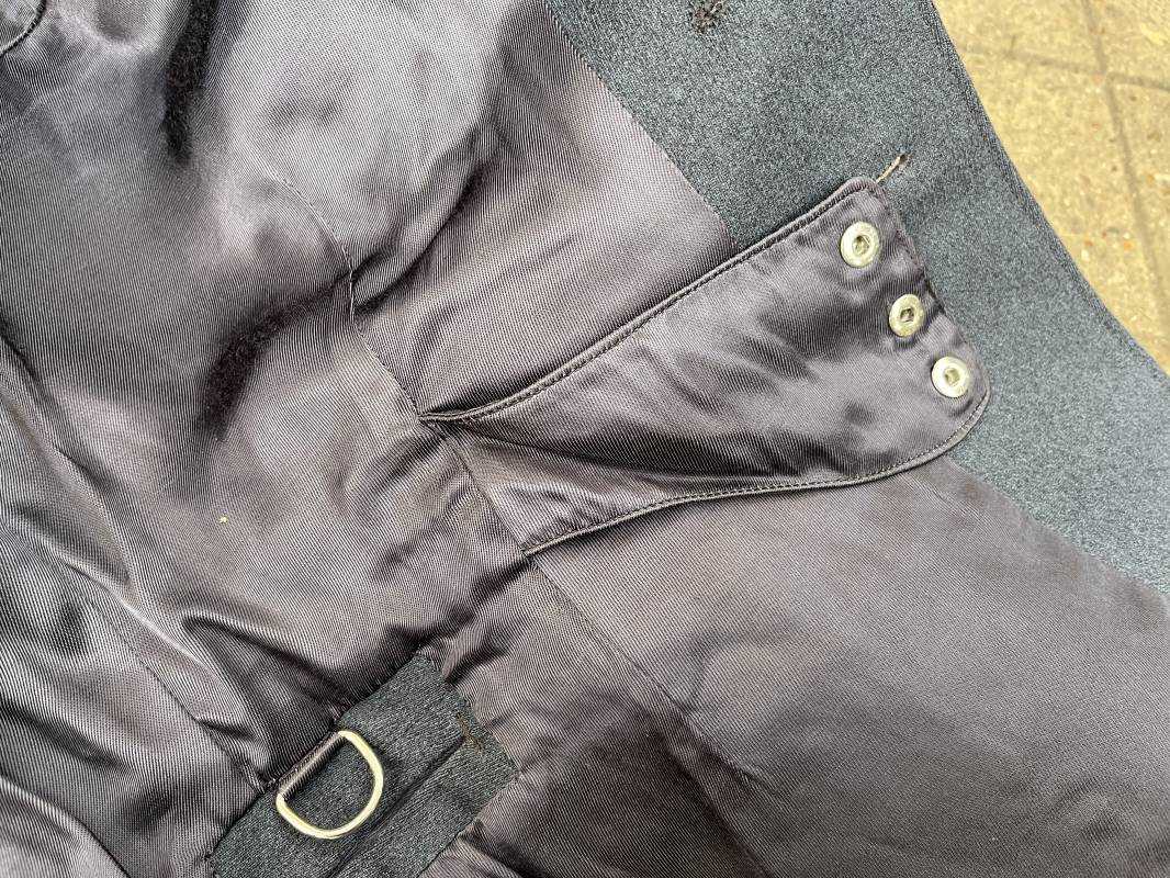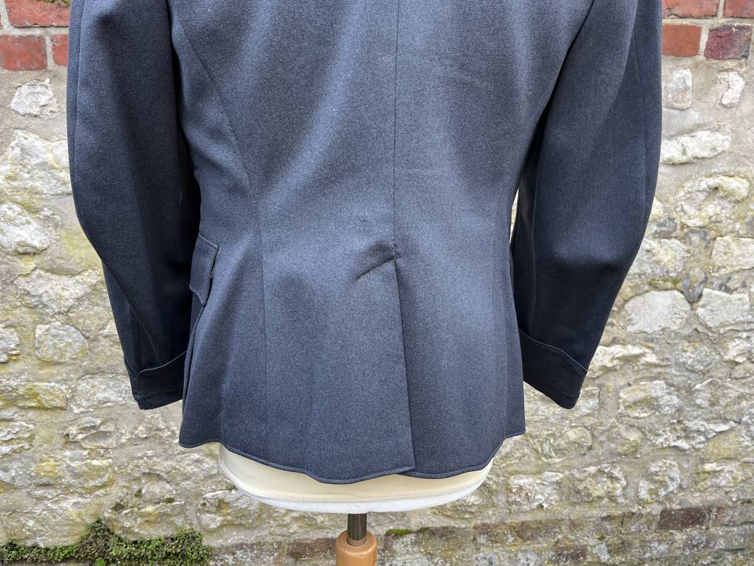 Très belle veste quatre poches ( Dienst Rock ) d'un officier de la Luftwaffe en gabardin gris bleu. Cette veste est entièrement montée d origine . Liseré rouge de l'artillerie, quatre poches à plis, boutons grenelés argent cousus d'origine. Pattes de col et d'épaules d'un sous lieutenant ( leunant ) de la Flak Artillerie. Galon de col torsadé pour officier. Aigle de poitrine brodé cannetille argent. Passants pour le port de deux décorations de poitrine et ruban de décoration . Intérieur doublé satinette gris bleu. Etiquette fabricant Edouard Zeeck Stralsund , poche intérieure avec noominette du fabricant avec nom de l officier et matricule , daté 28 02 1939 . Passant et anneau métalliques pour le port de la dague.Petite ceinture ventrière en tissu satinette avec boutons pression de fermeture . Veste légèrement portée en parfait état. Largeur épaules 43cm. Longueur 68 cm. Manches 60cm. Superbe veste entièrement montée d'origine en parfait état . Veste trouvée en Allemagne directement dans la famille 100% nature et intouchée . 1939/45 . Ref 21570