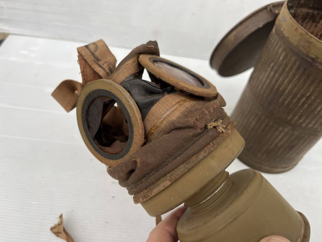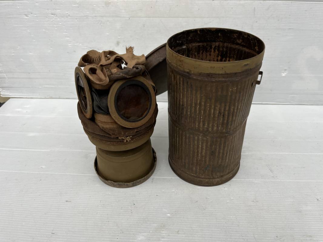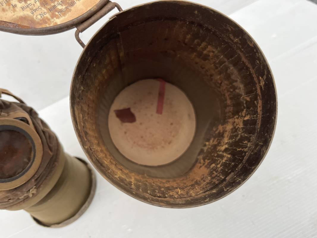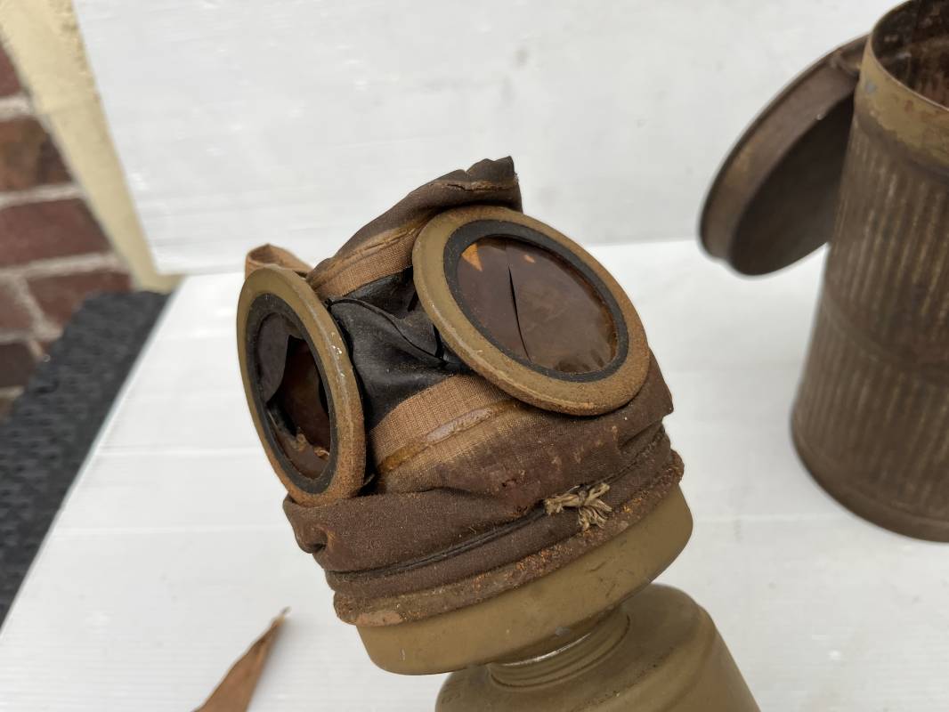 Raremasque de protection ARS 1917 . Ce masque est attribué au Medecin Aide Major MESNIL . Bel ensemble trouvé en succession familiale . Masque en toile avec ses sangles et filtre . Le masque est plié d origine . Trés sec il ne peut pas etre ouvert . Sec et cassant a manipuler avec precaution . Boitier en fer cannelé peint en kaki moutarde. Couvercle avec notice en papier (traces de corrosion). Marquage fabricant au cul du boitier JJ CARNAUD Elancourt . Peinture d'origine non frottée. Il manque la grande sangle en toile de coton kaki . La petite sangle boutonnière est présente , 100% dans son jus et intouché. Ref 16308