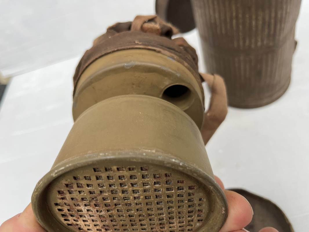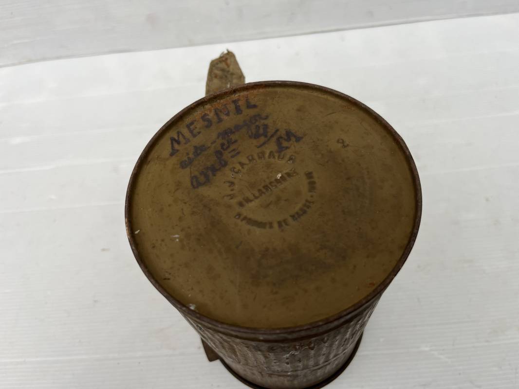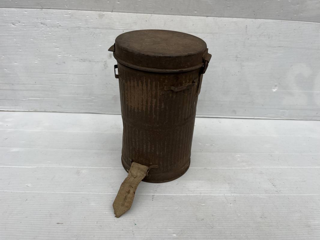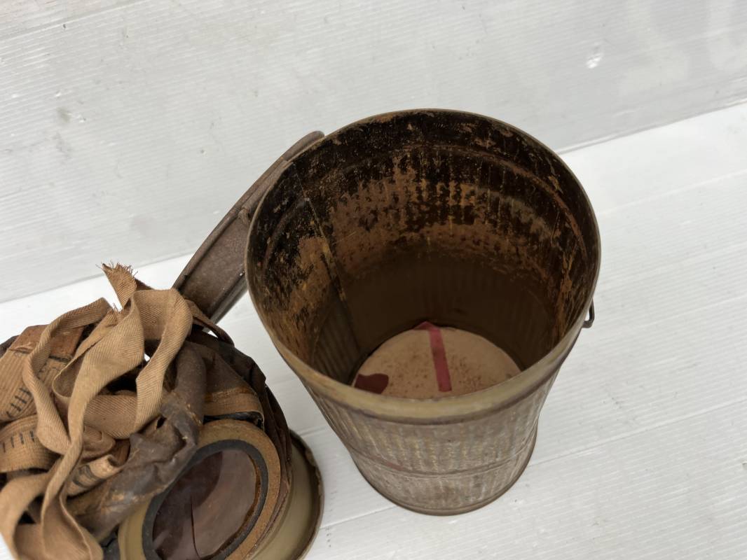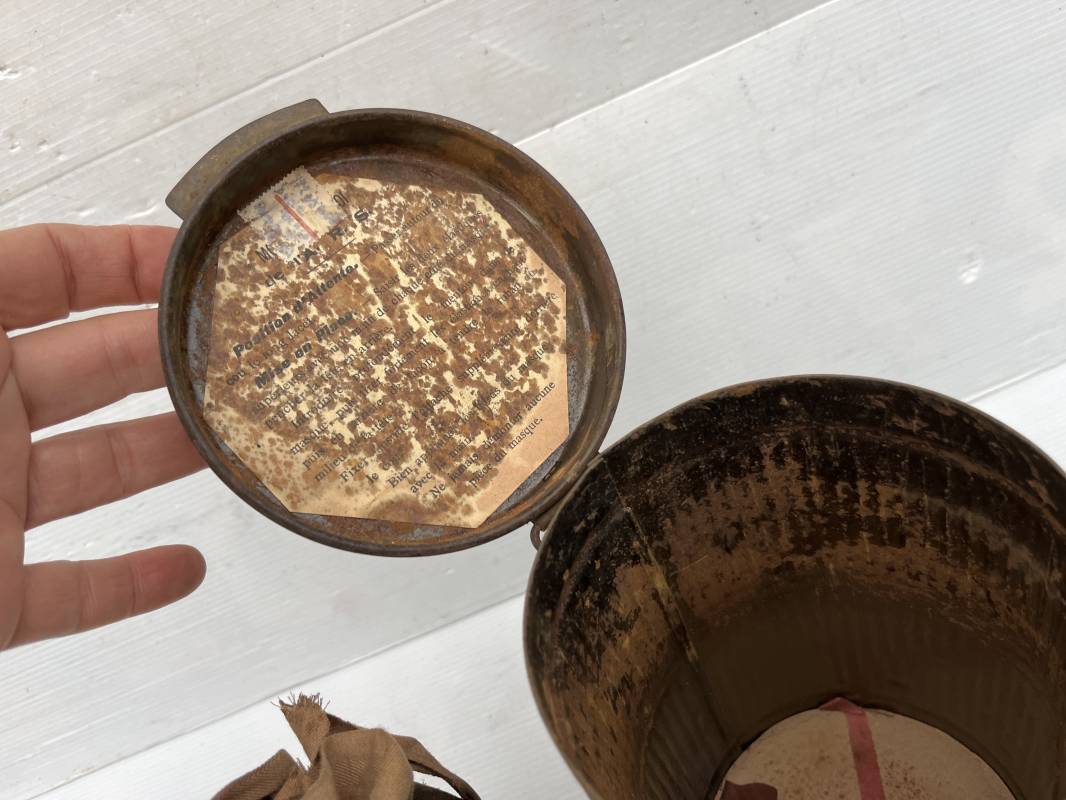 Raremasque de protection ARS 1917 . Ce masque est attribué au Medecin Aide Major MESNIL . Bel ensemble trouvé en succession familiale . Masque en toile avec ses sangles et filtre . Le masque est plié d origine . Trés sec il ne peut pas etre ouvert . Sec et cassant a manipuler avec precaution . Boitier en fer cannelé peint en kaki moutarde. Couvercle avec notice en papier (traces de corrosion). Marquage fabricant au cul du boitier JJ CARNAUD Elancourt . Peinture d'origine non frottée. Il manque la grande sangle en toile de coton kaki . La petite sangle boutonnière est présente , 100% dans son jus et intouché. Ref 16308