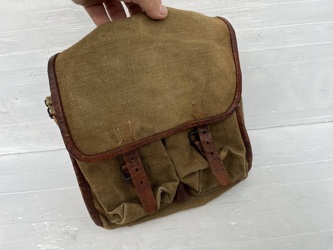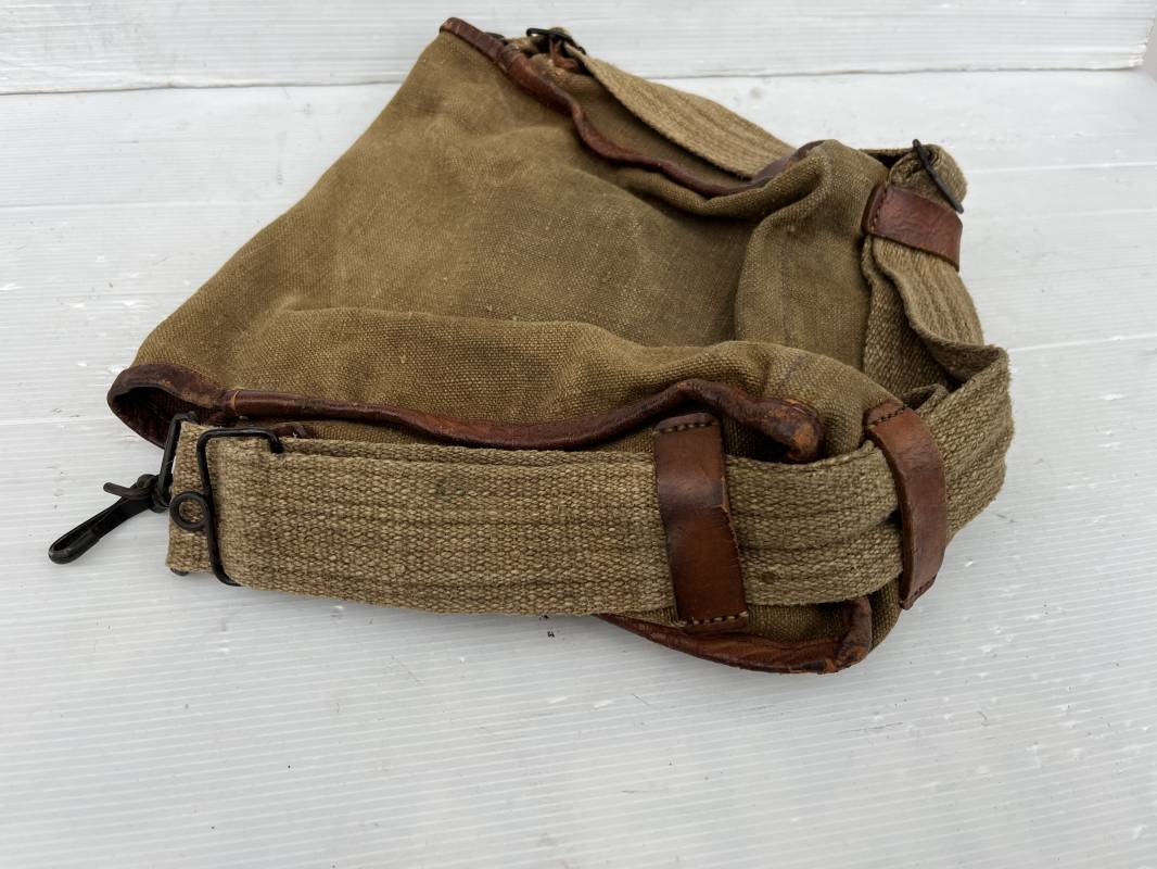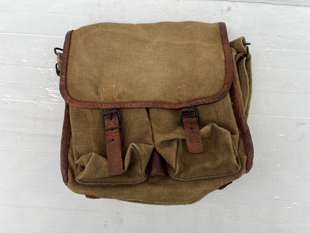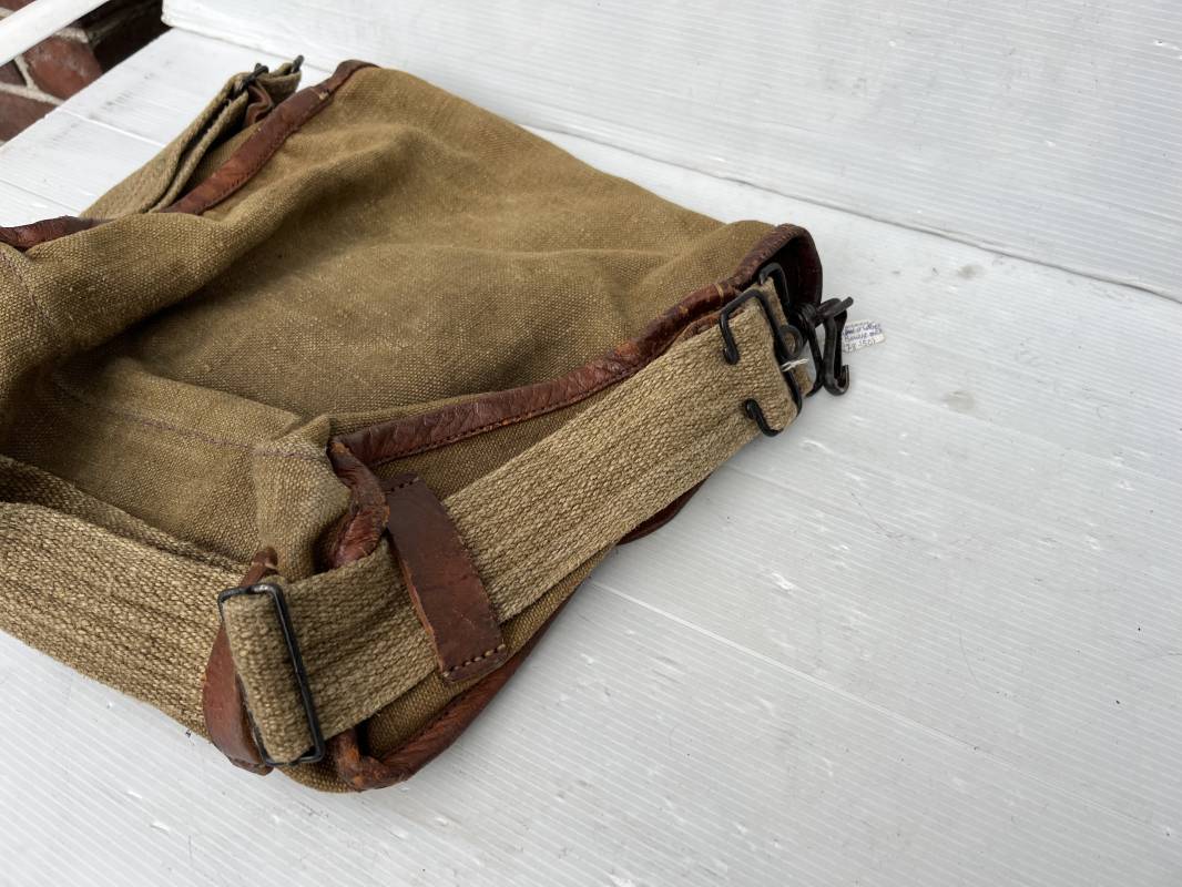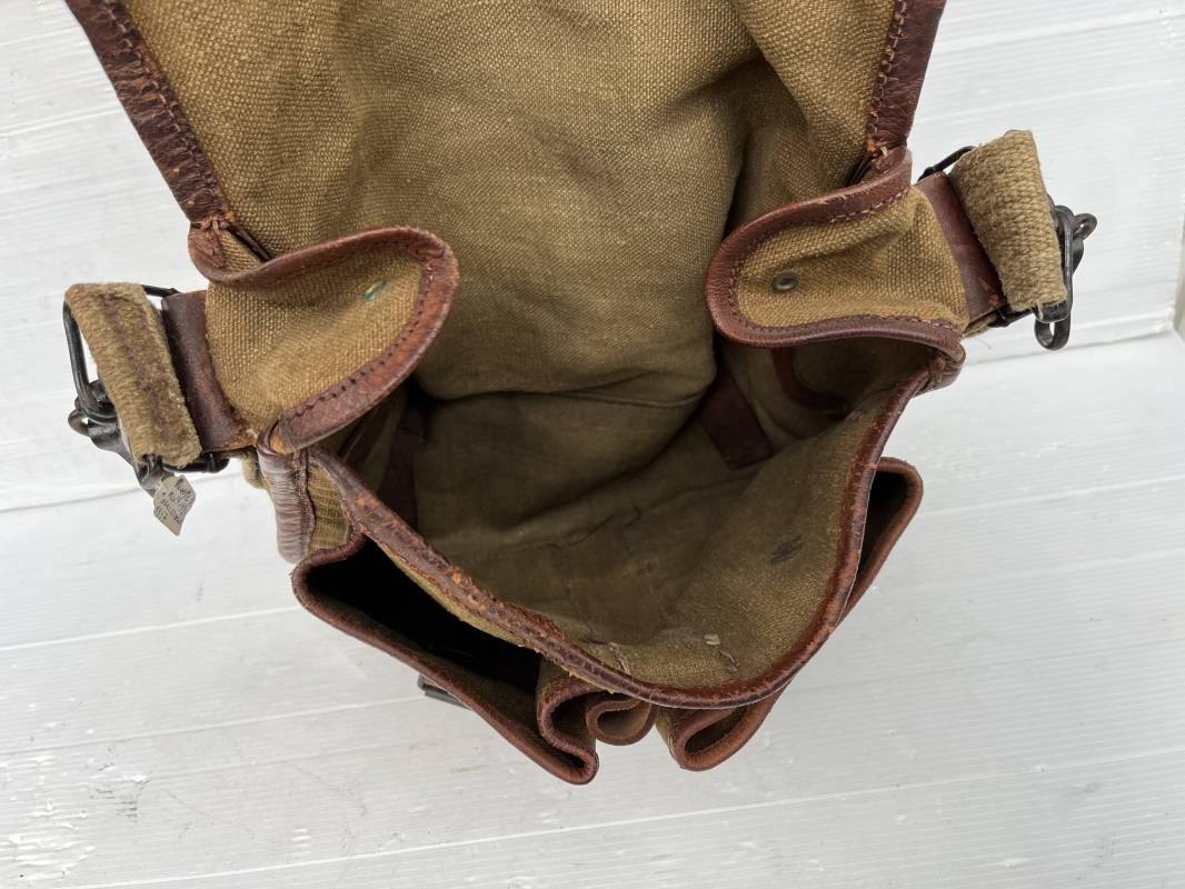 Belle musette modèle 1935 en forte toile kaki , ourlée cuir fauve. Deux poches frontales à munitions. Sangle en forte toile et boucles métalliques , crochets fer de fixation . Tampon encre sous rabat daté 3 39 . Musette portée en bon état 1935/40.ref 22064