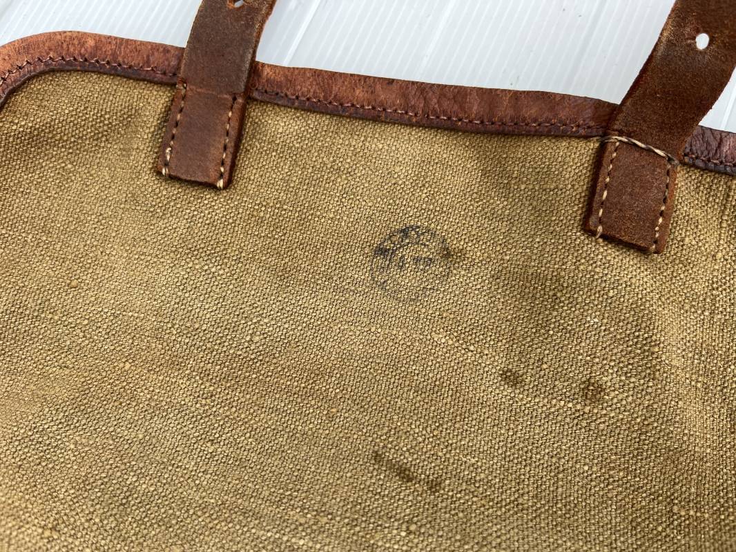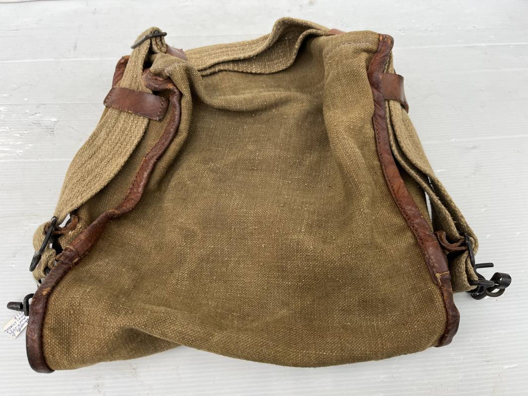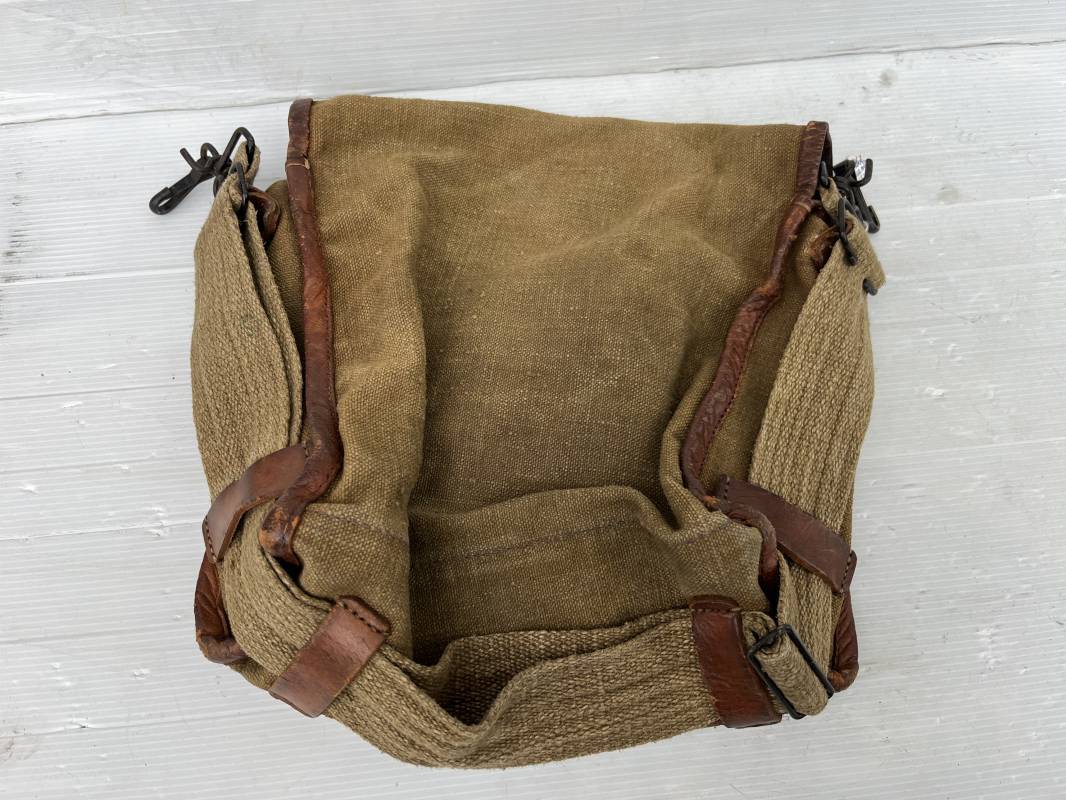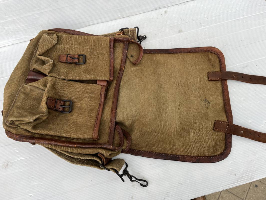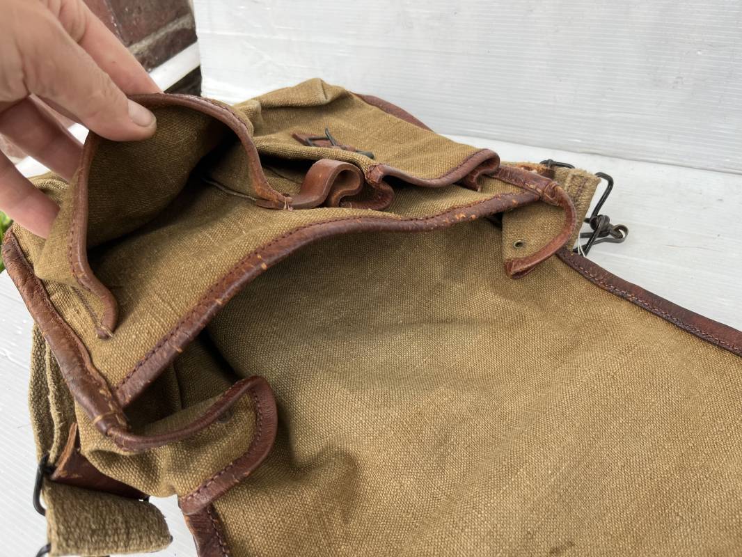 Belle musette modèle 1935 en forte toile kaki , ourlée cuir fauve. Deux poches frontales à munitions. Sangle en forte toile et boucles métalliques , crochets fer de fixation . Tampon encre sous rabat daté 3 39 . Musette portée en bon état 1935/40.ref 22064