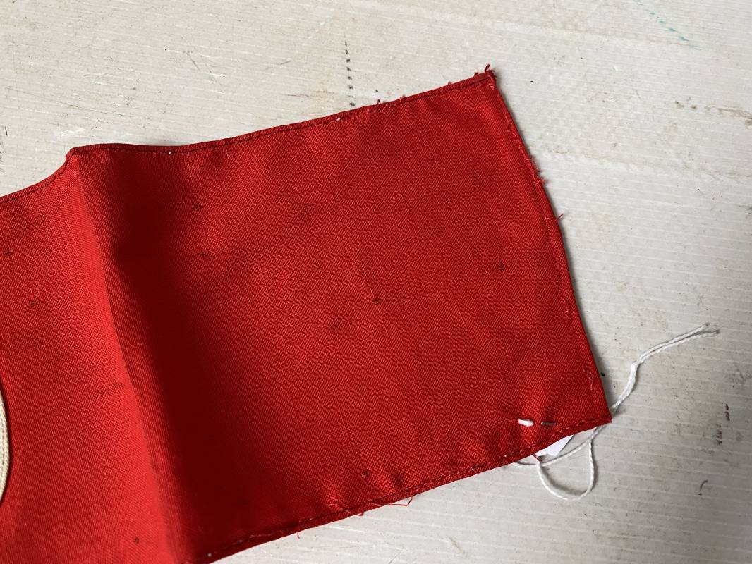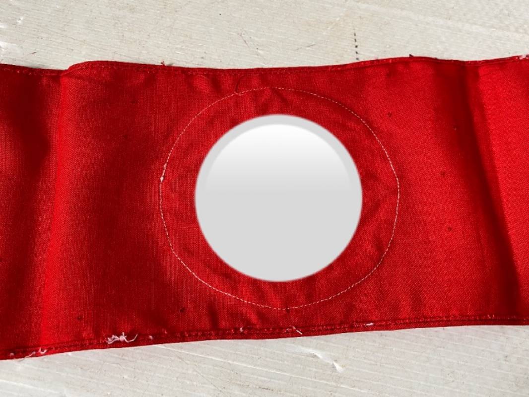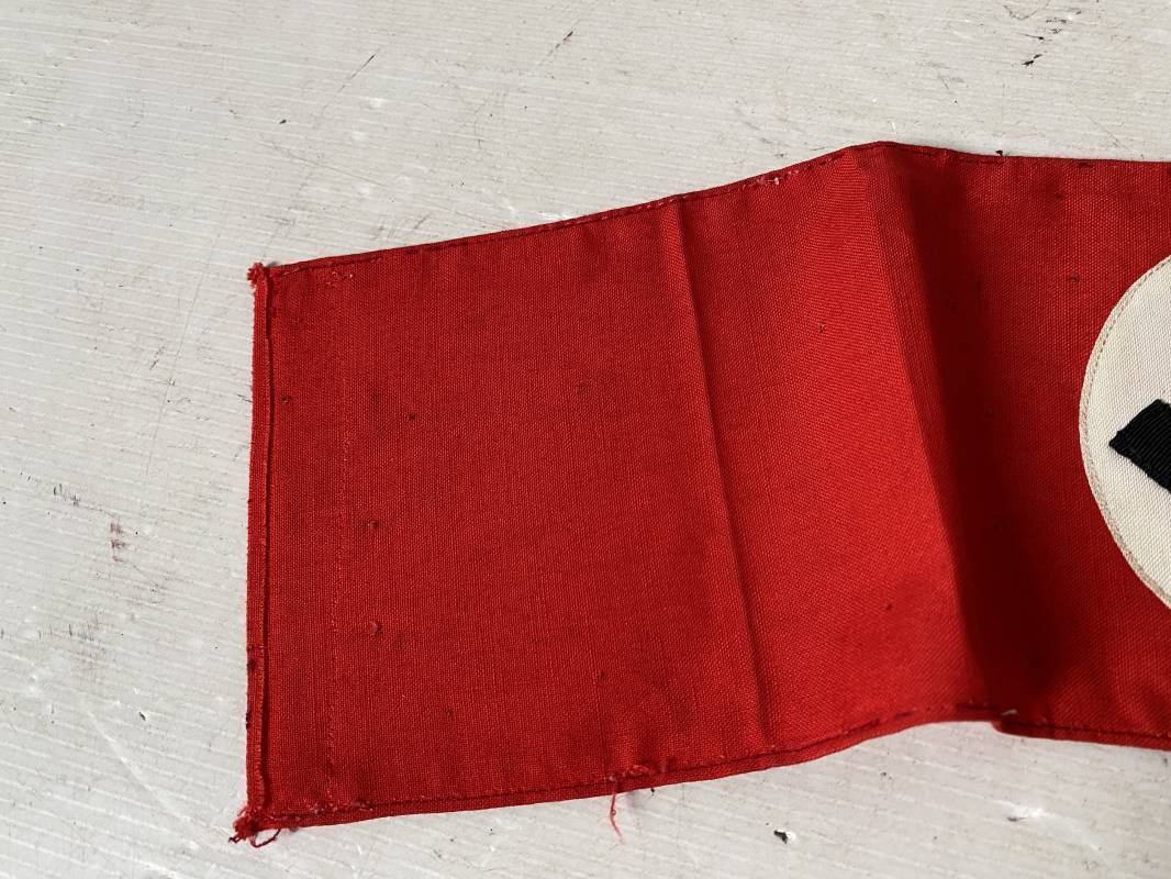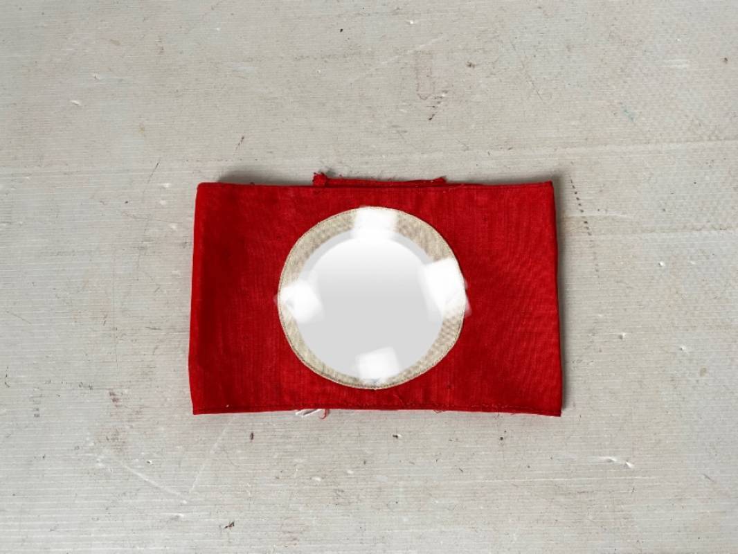 Bon brassard pour personnel du NSDAP (SA, NSKK, RAD...) Brassard en coton rouge, rond blanc cousu. Croix cousue en coton satiné noir. Ce brassard a été décousu d'une vareuse. Pleine dimensions : 440mmx115mm. Légèrement porté en parfait état. Ref 14661
